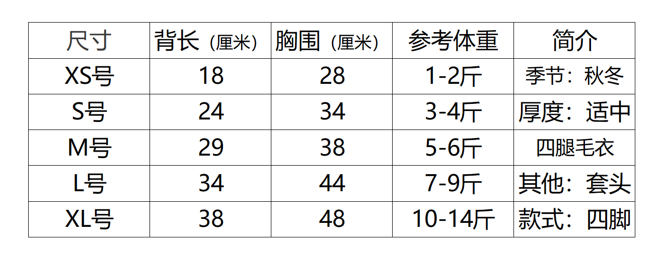 Size XS Size Back Length 18 (Recommended 0.5-1.0kg),Size S Back Length 24 (Recommended 1.5-2kg),Size m Back Length 29 (Recommended 2.5-3kg),Size L Back Length 34 (Recommended 3.5-4.5kg),XL Back Length 38cm, Recommended 5-7kg