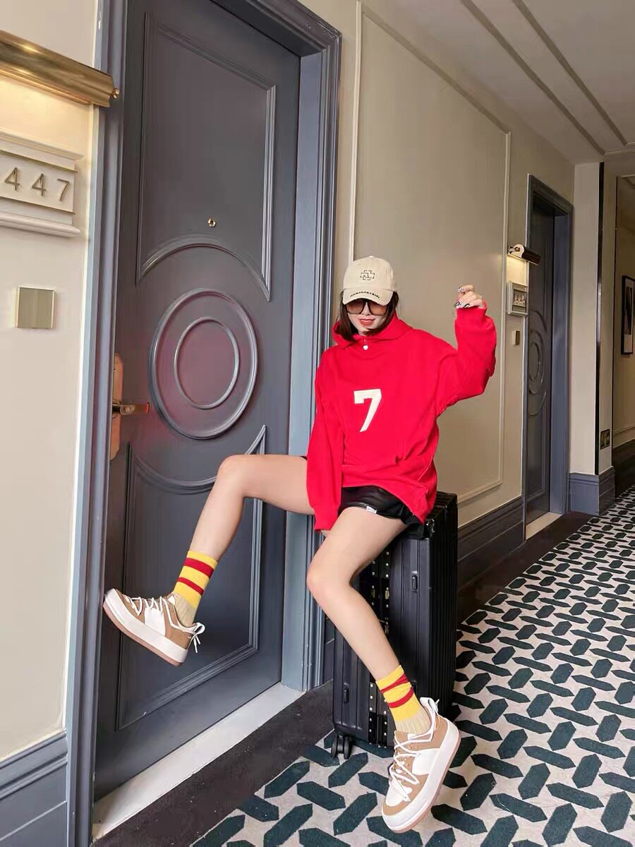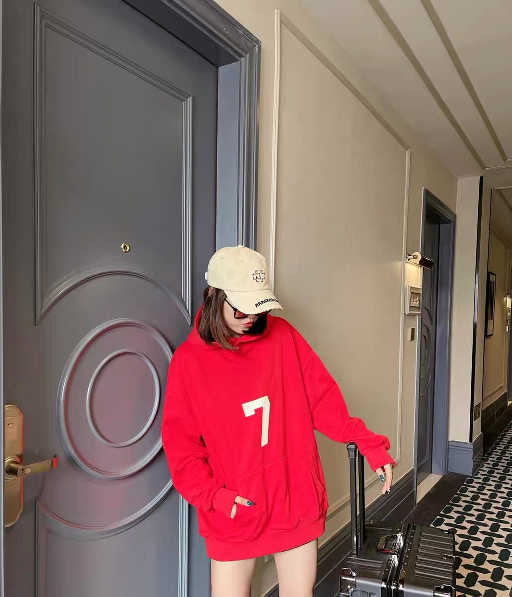 Fog Red Sweatshirt for Women, Spring and Autumn, High Street Fashion Brand, Bf Lazy Style, Number 7 Flocking Print, Thick Couple Hoodie