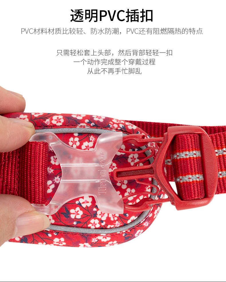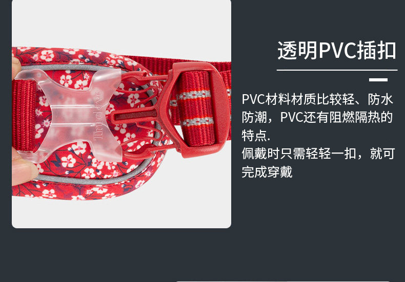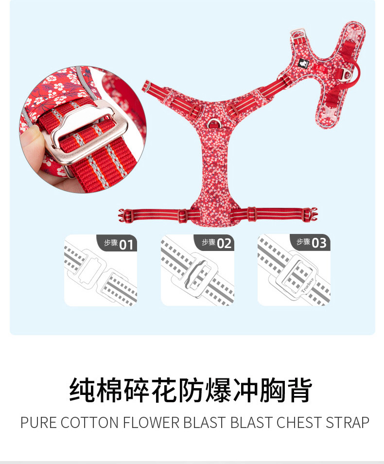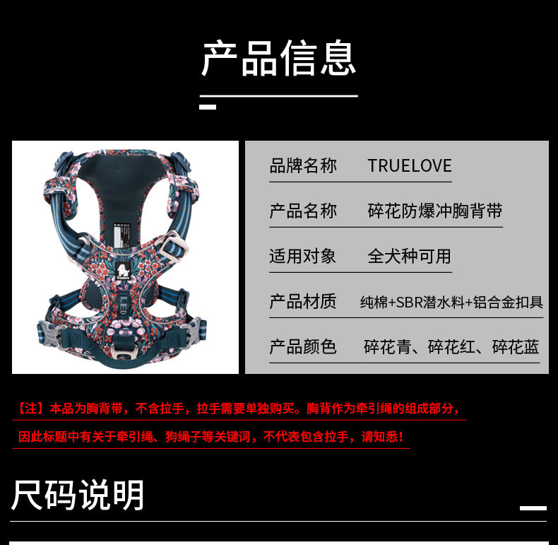 Applicable size XS Harness S Traction Rope Bust 33-43cm recommended 2kg-5kg,S chest and back S traction rope Bust 43-56cm, recommended 4-7kg,M Harness M Traction Rope Bust 56-69cm, 7-18kg recommended,L chest and back L traction rope Bust 69-81cm, recommended 18kg-30kg,XL Harness L Traction Rope Bust 81-107cm, 30-50kg recommended