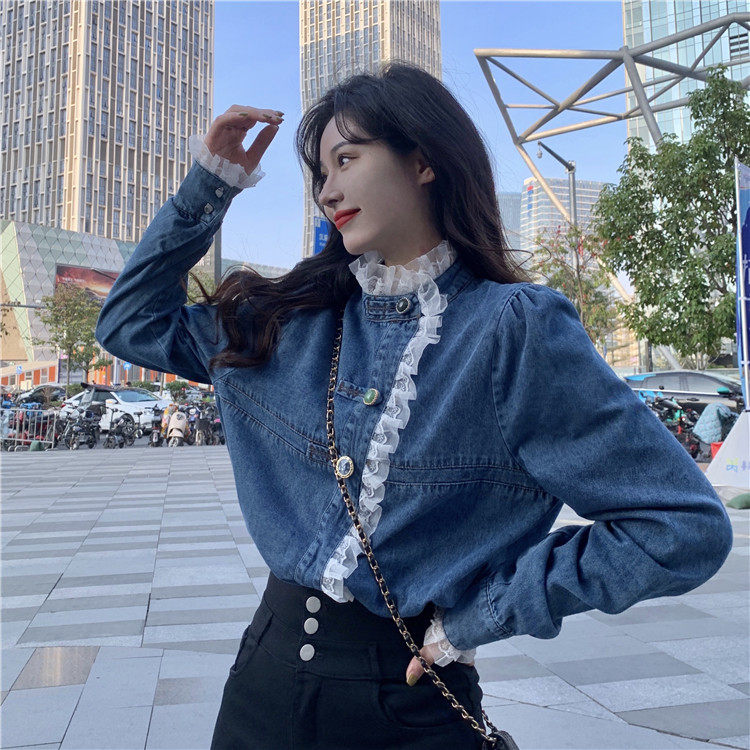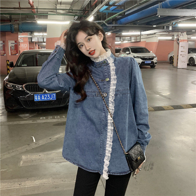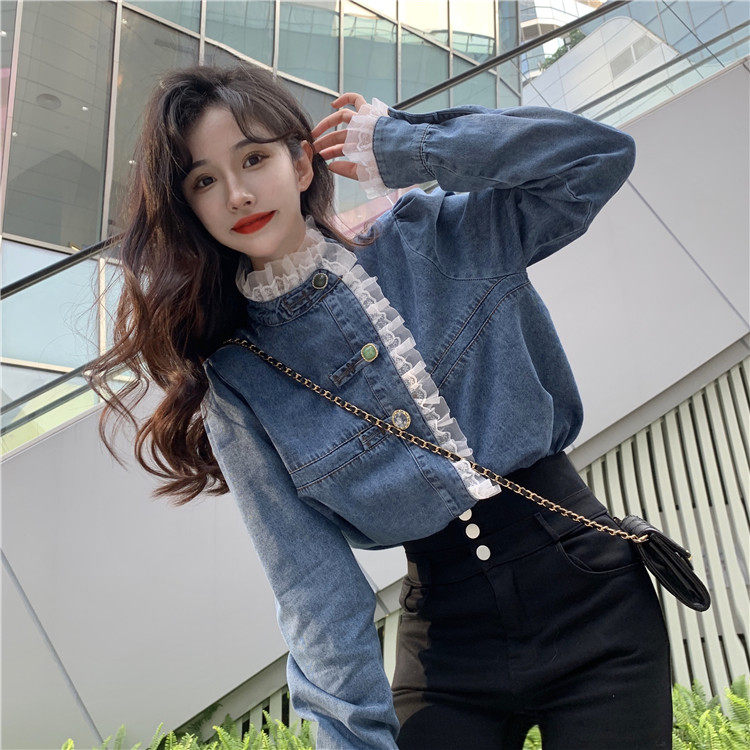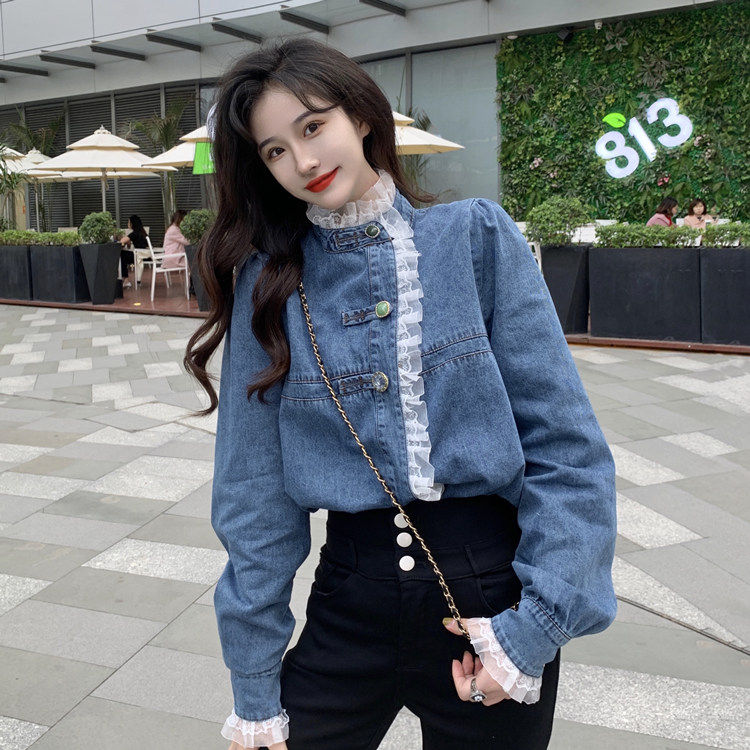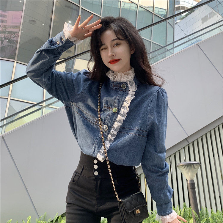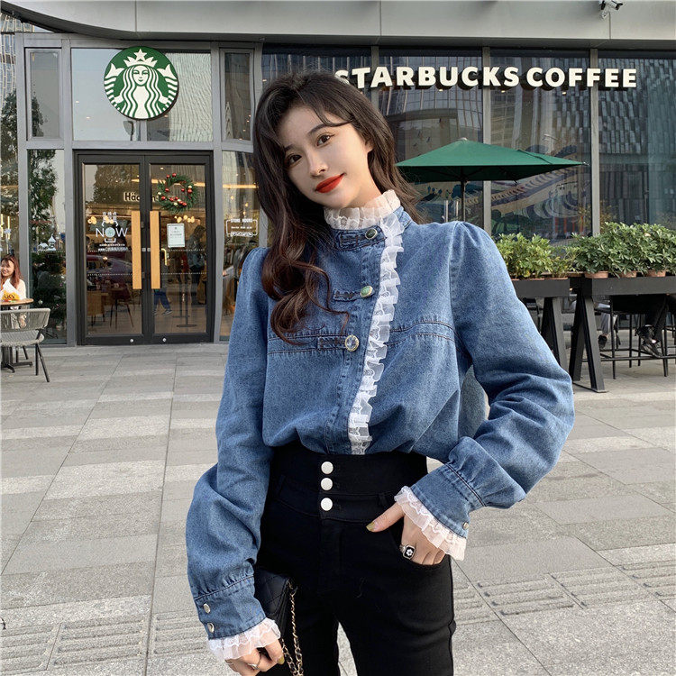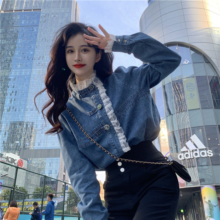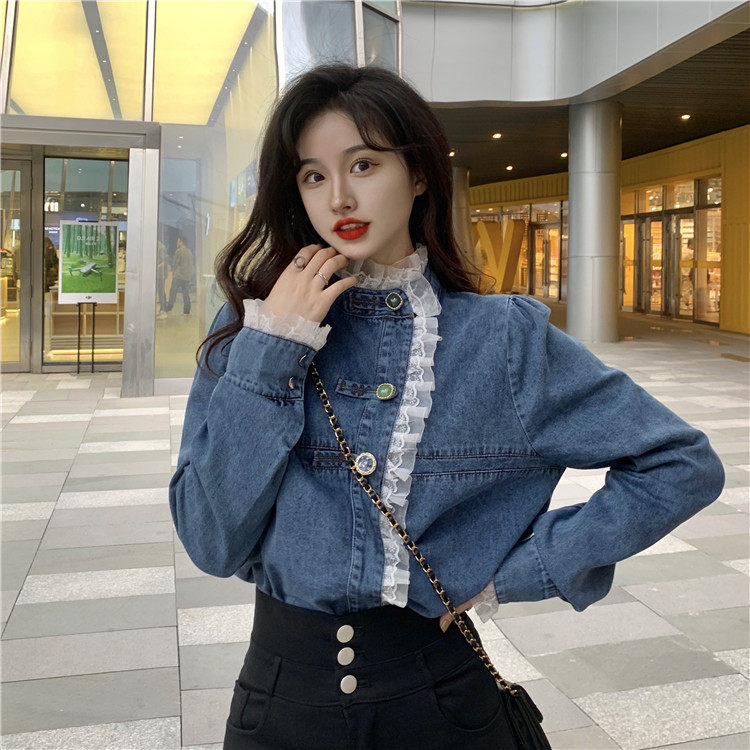 Джинсовая куртка-рубашка с кружевной отделкой для женщин, весенне-осенний дизайн, нишевый стиль, стильный французский шик, топ с воротником-стойкой.