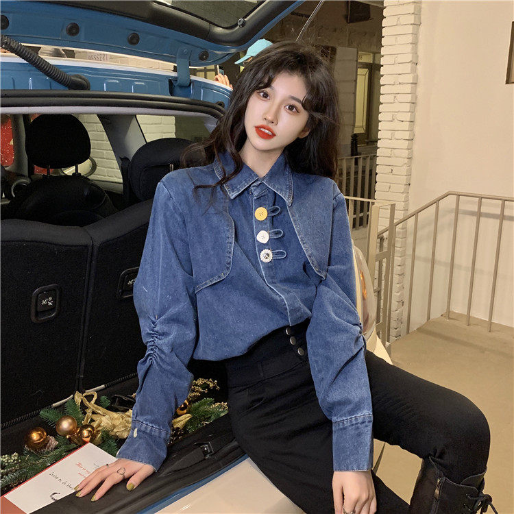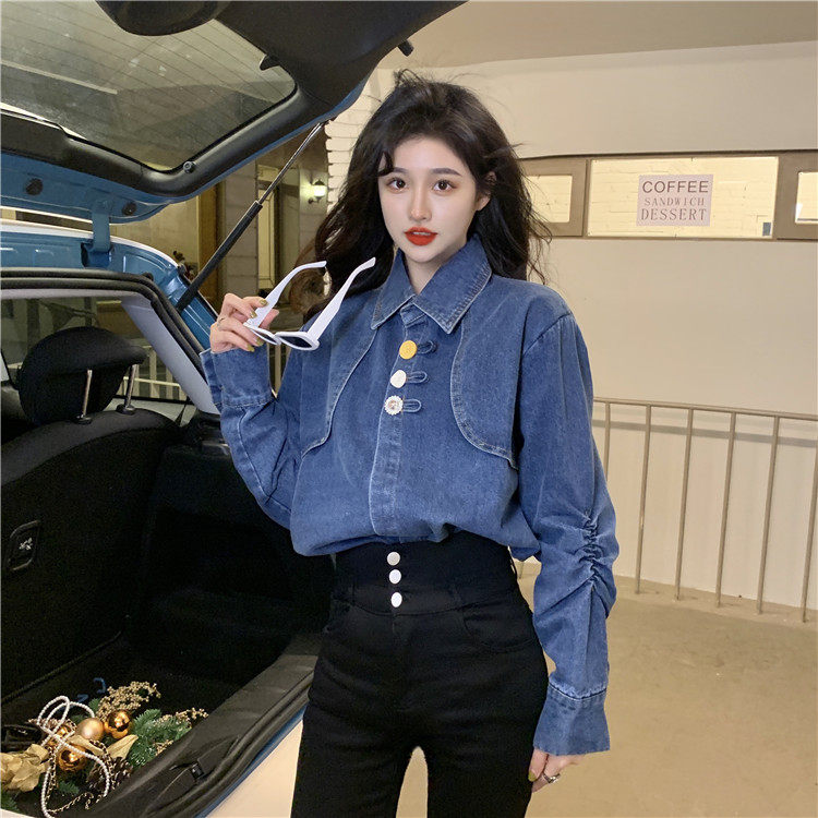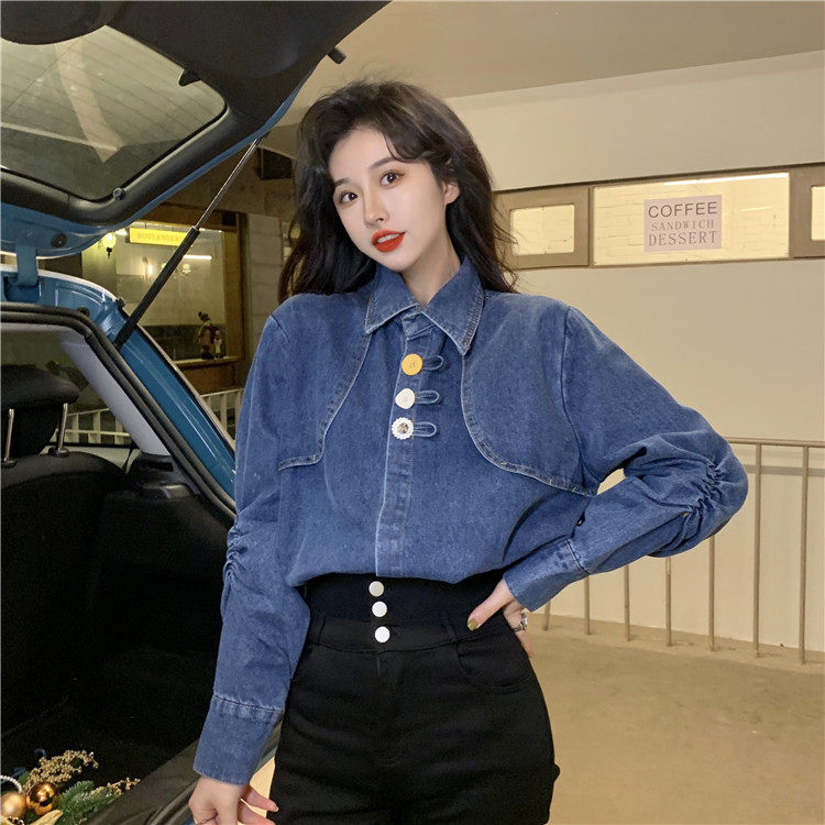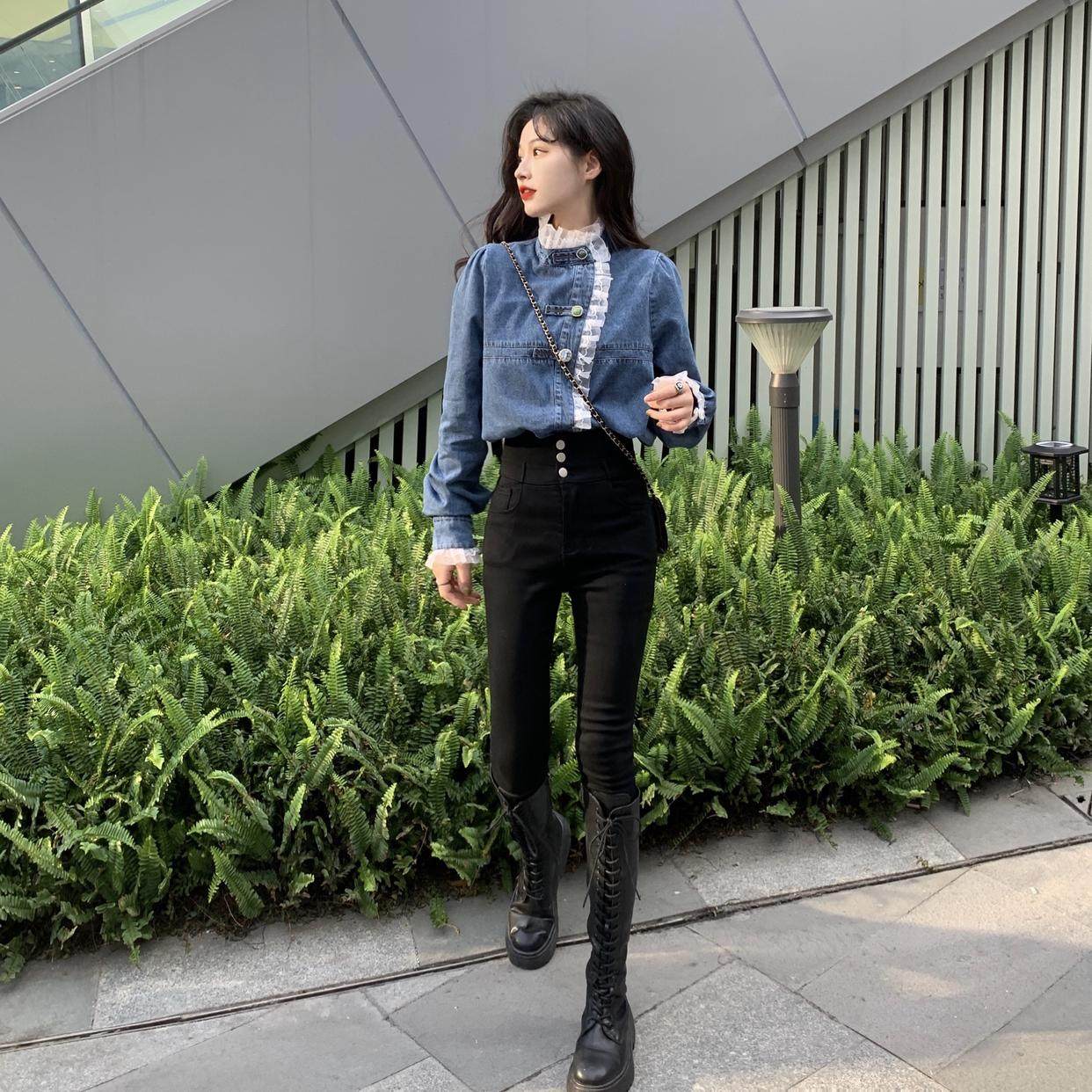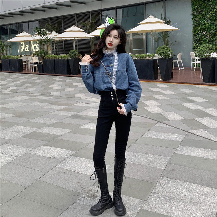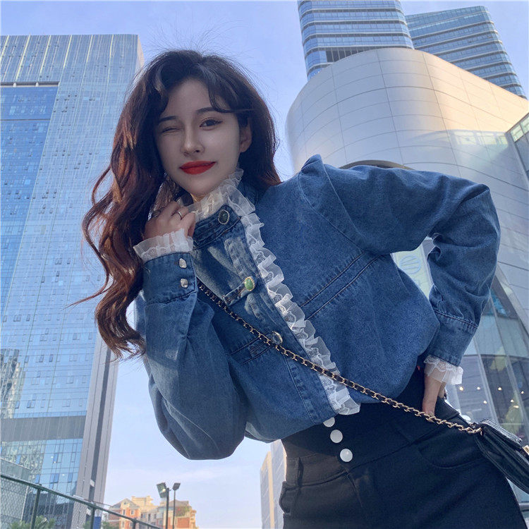 Джинсовая куртка-рубашка с кружевной отделкой для женщин, весенне-осенний дизайн, нишевый стиль, стильный французский шик, топ с воротником-стойкой.