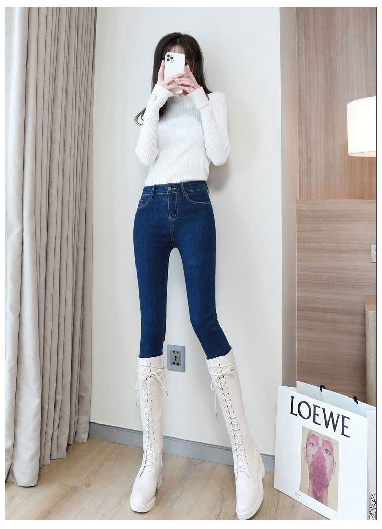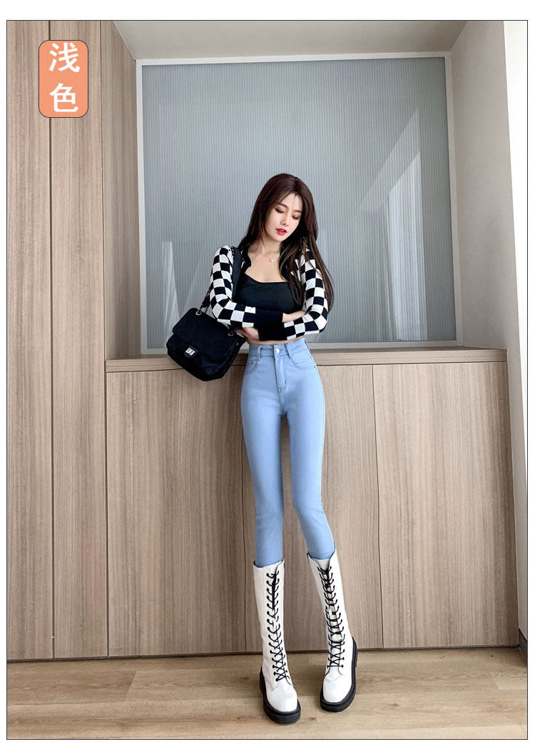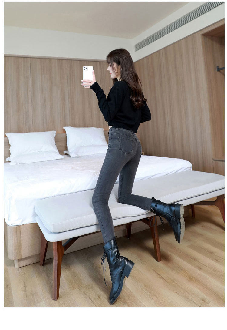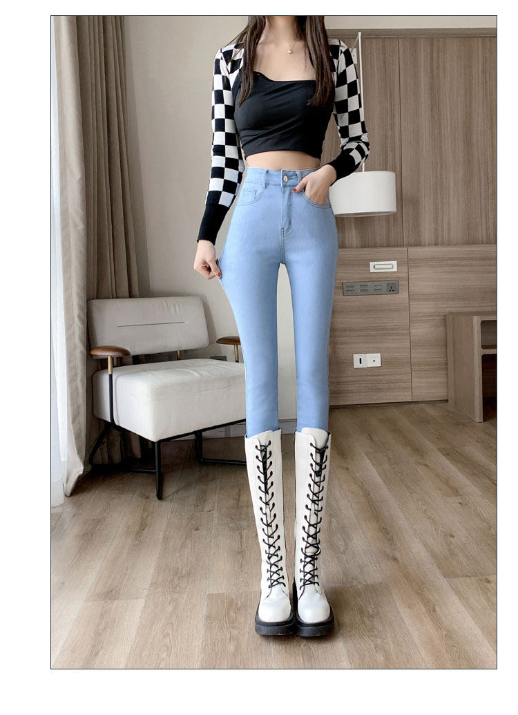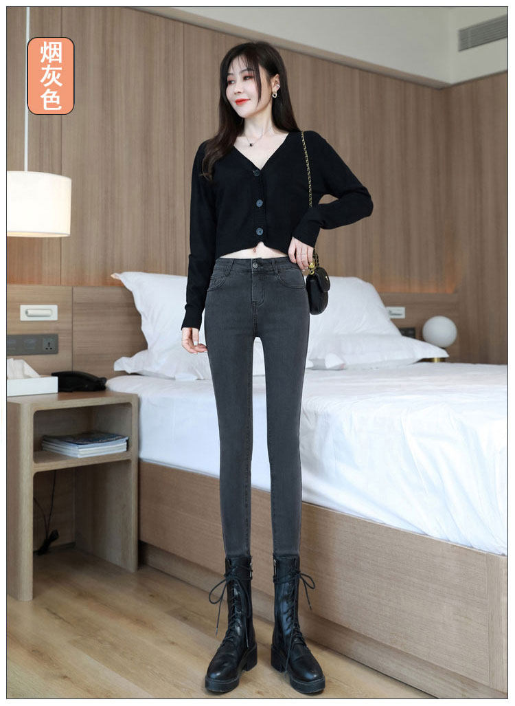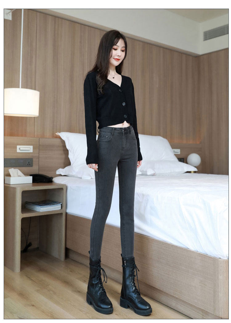 Light-colored high-waisted jeans for women, spring and autumn 2025 new elastic tight-fitting black velvet petite pants