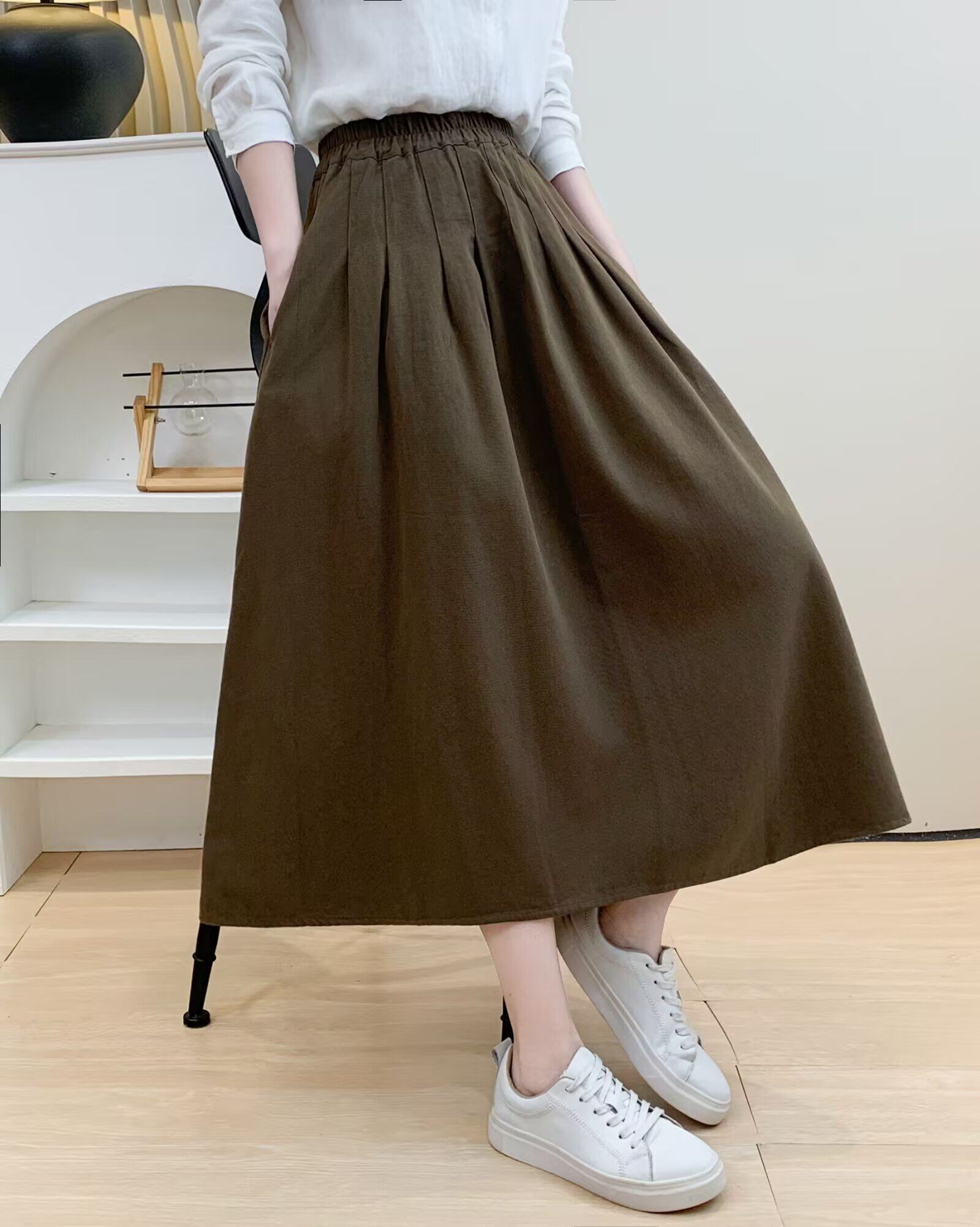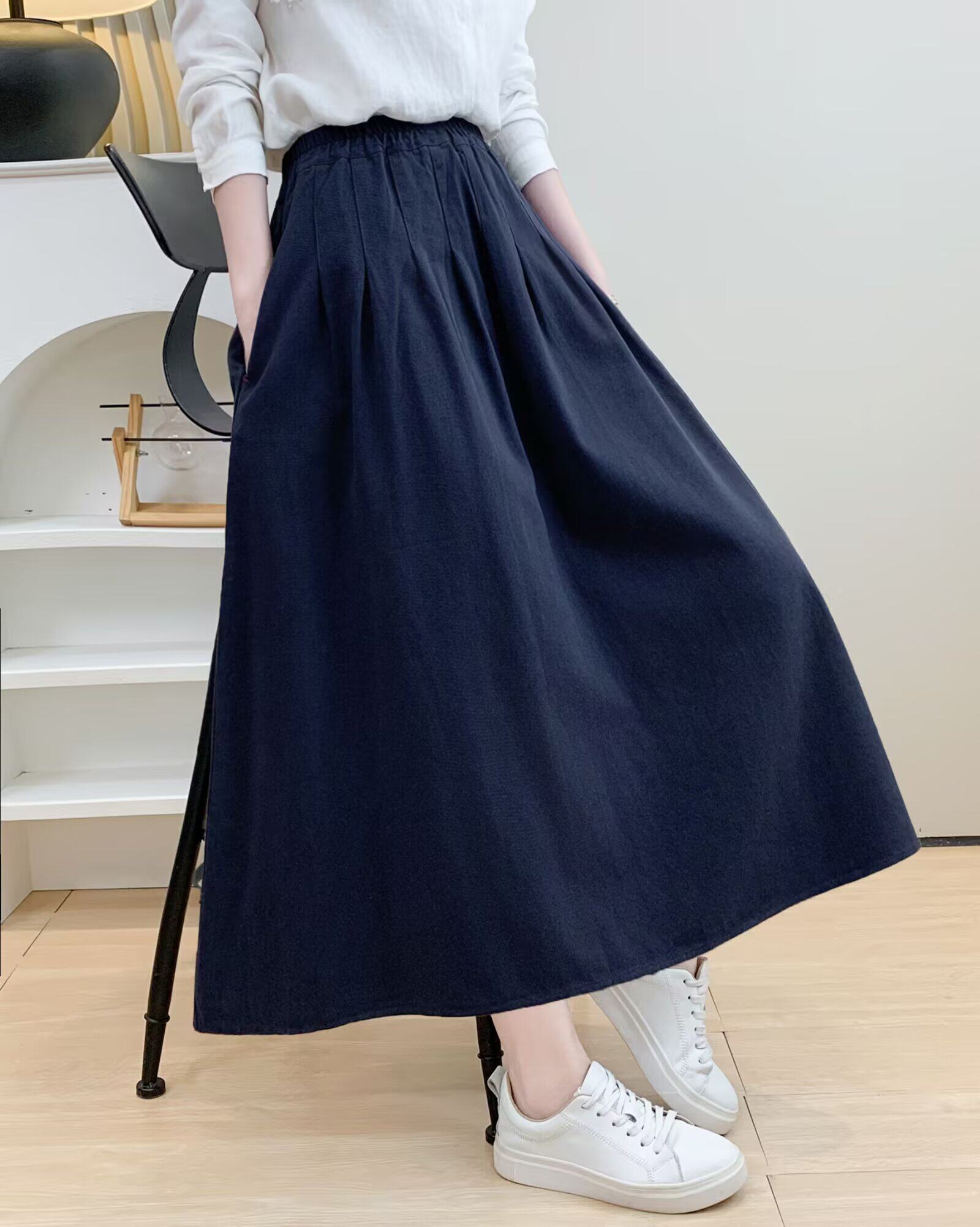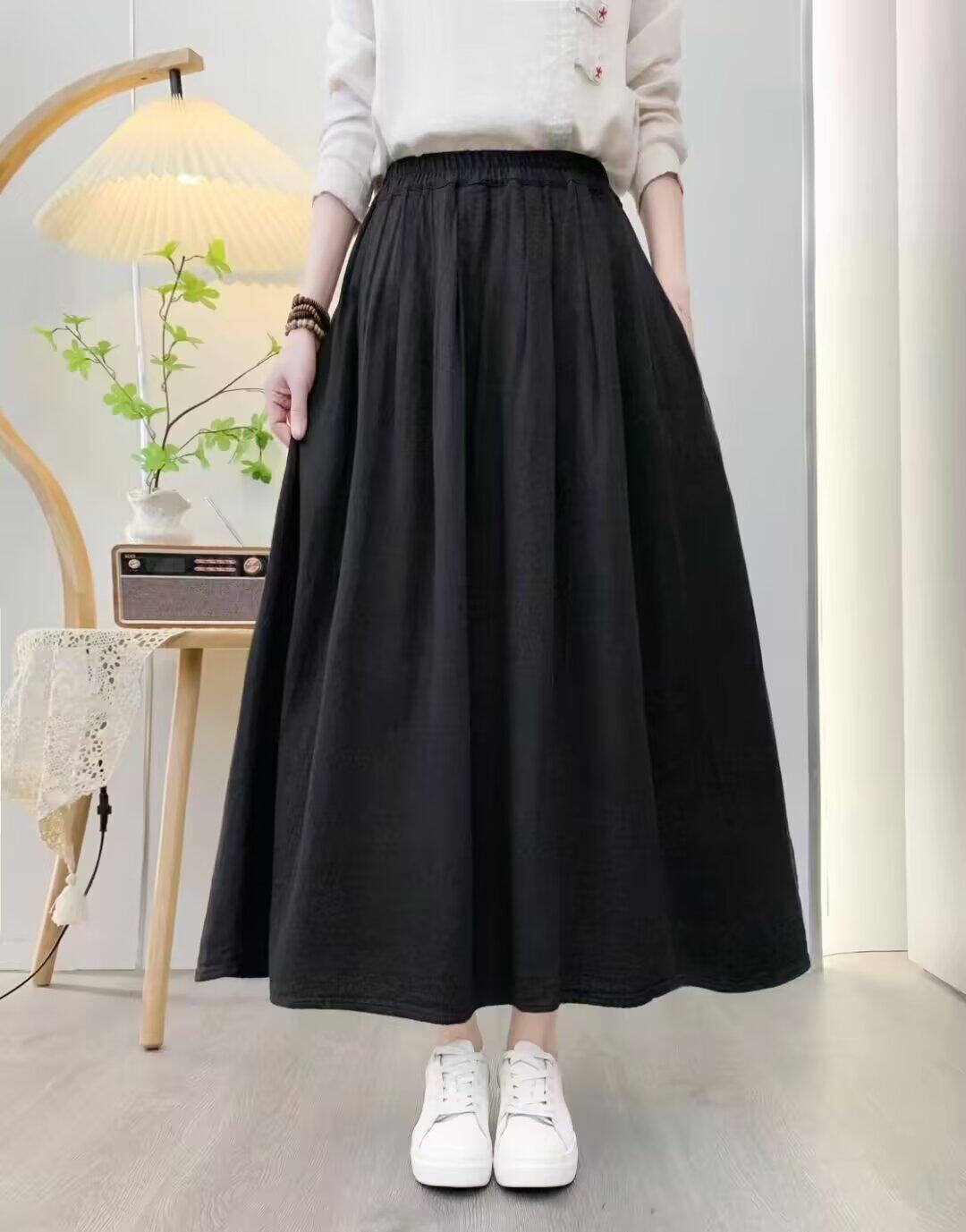 Spring and Autumn Over-The-Knee Skirt for Women, Elastic Waist, Mid-Length Skirt, Solid Color A-Line, Pure Cotton Long Skirt, Slimming Women's Long Skirt with Pockets