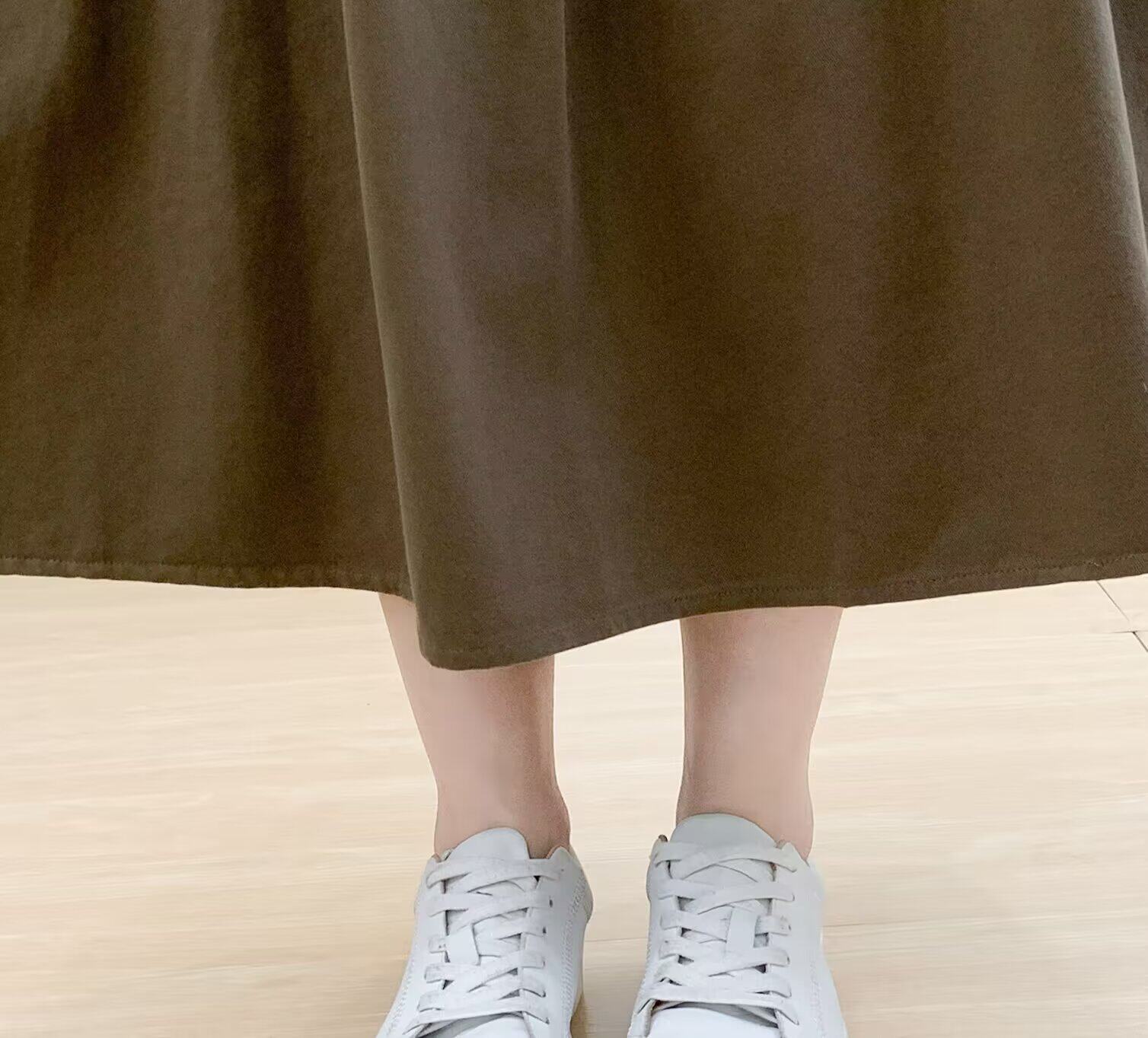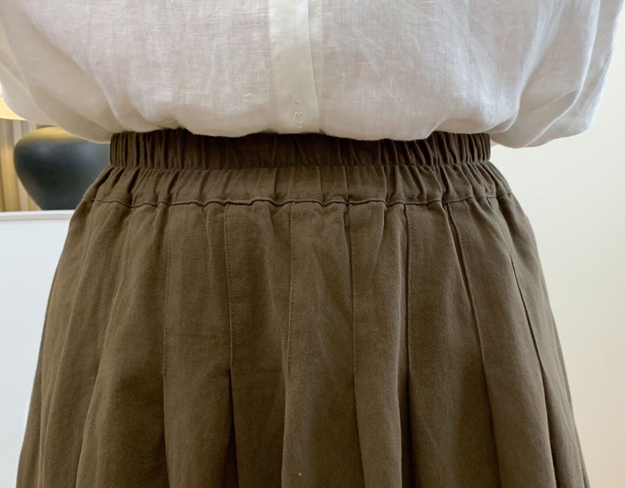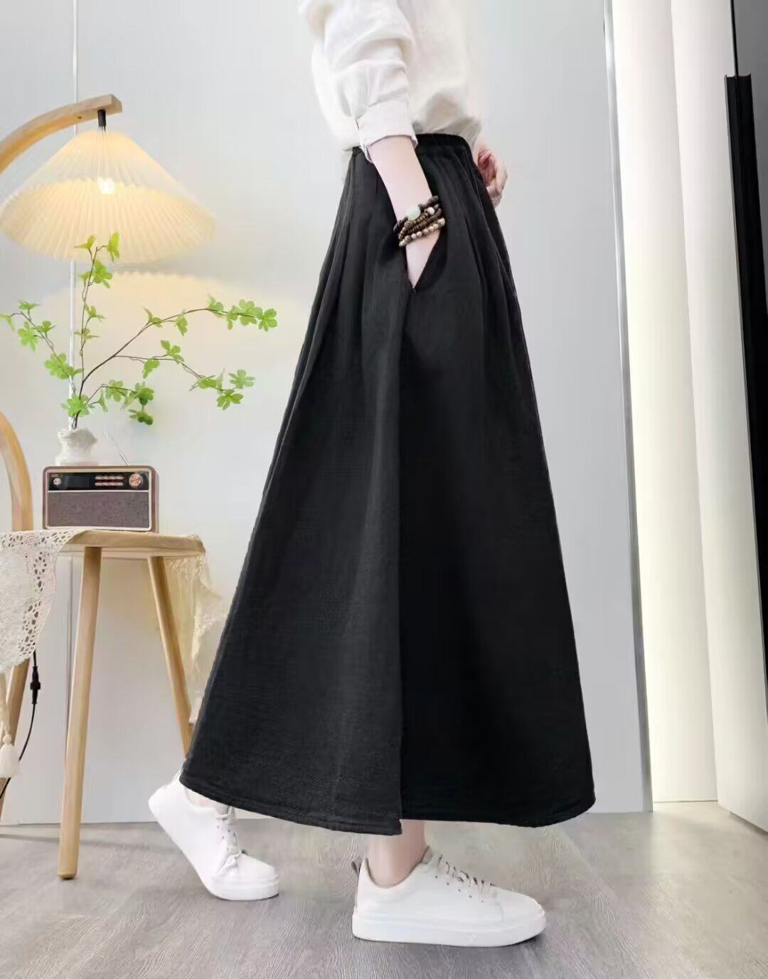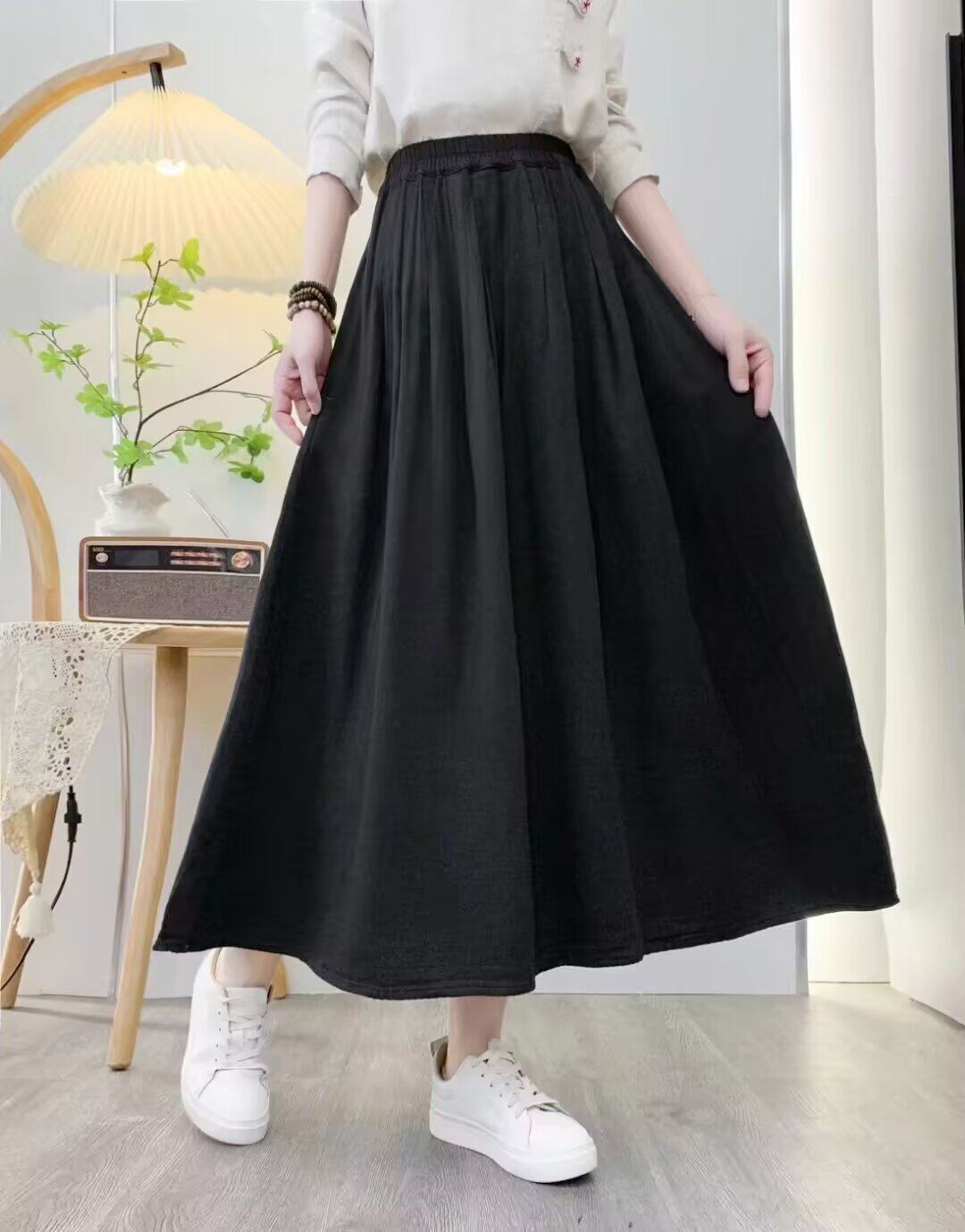 Spring and Autumn Over-The-Knee Skirt for Women, Elastic Waist, Mid-Length Skirt, Solid Color A-Line, Pure Cotton Long Skirt, Slimming Women's Long Skirt with Pockets