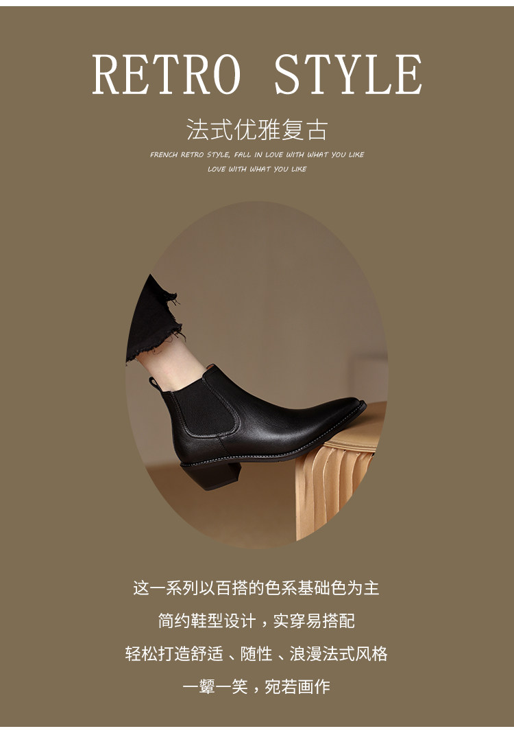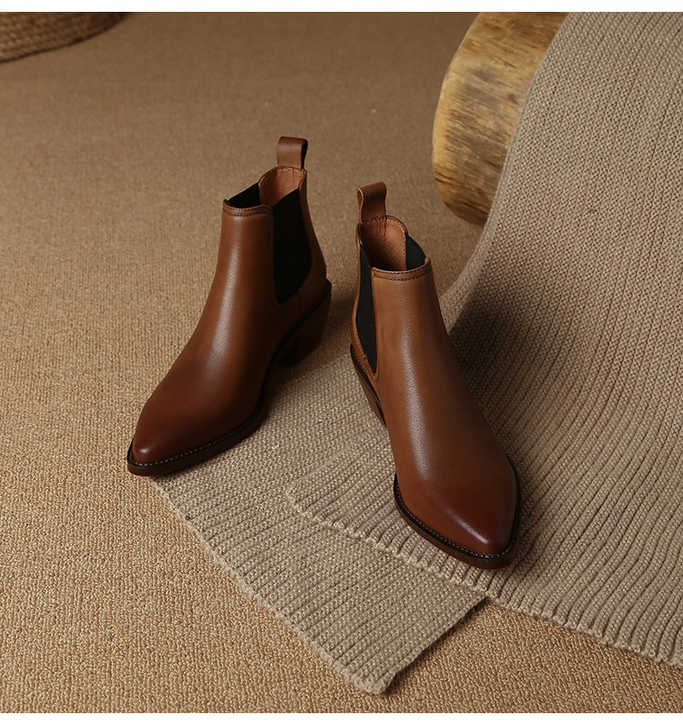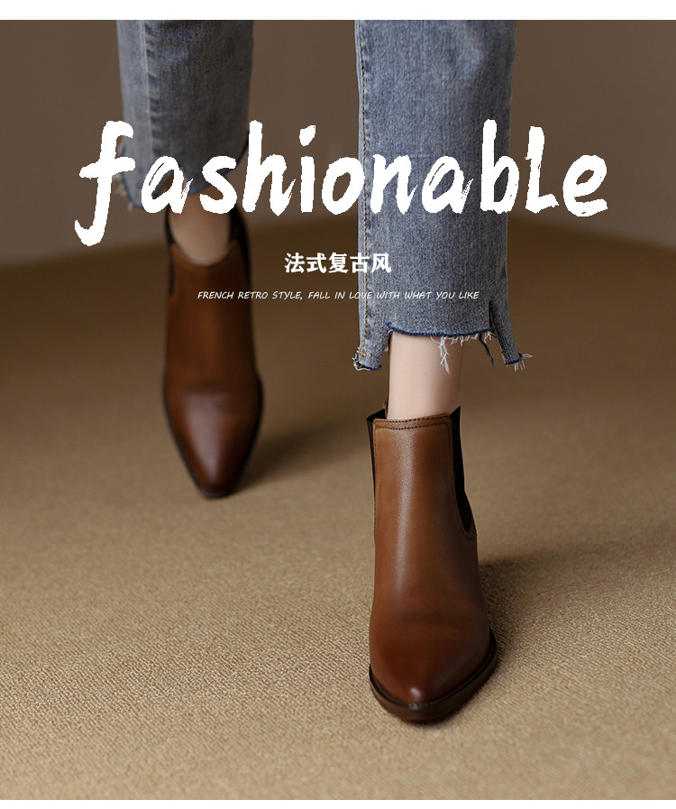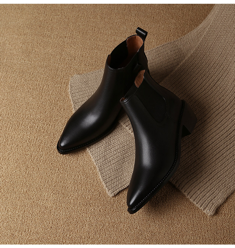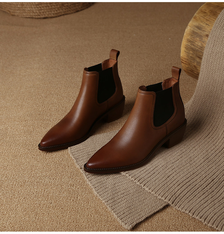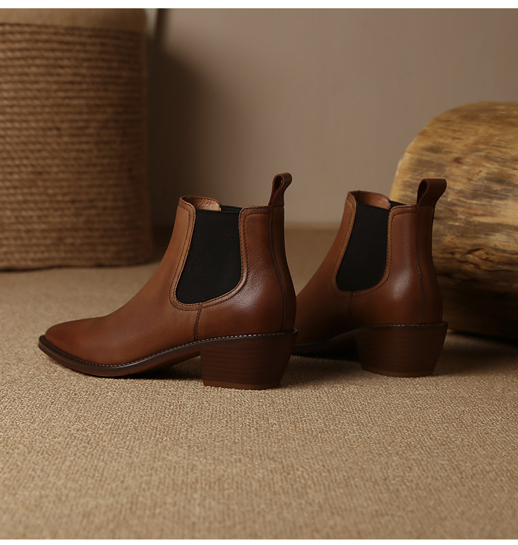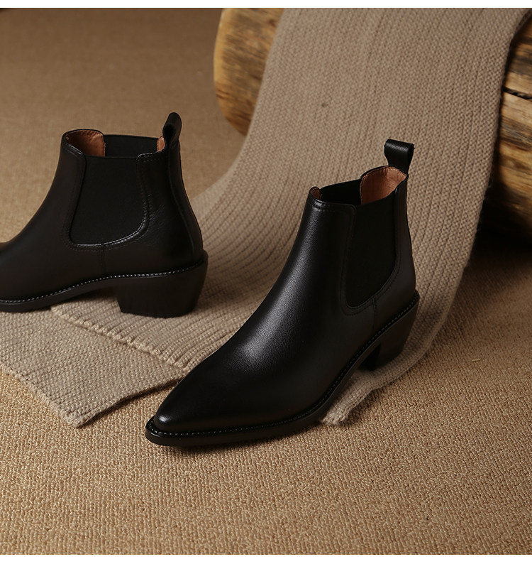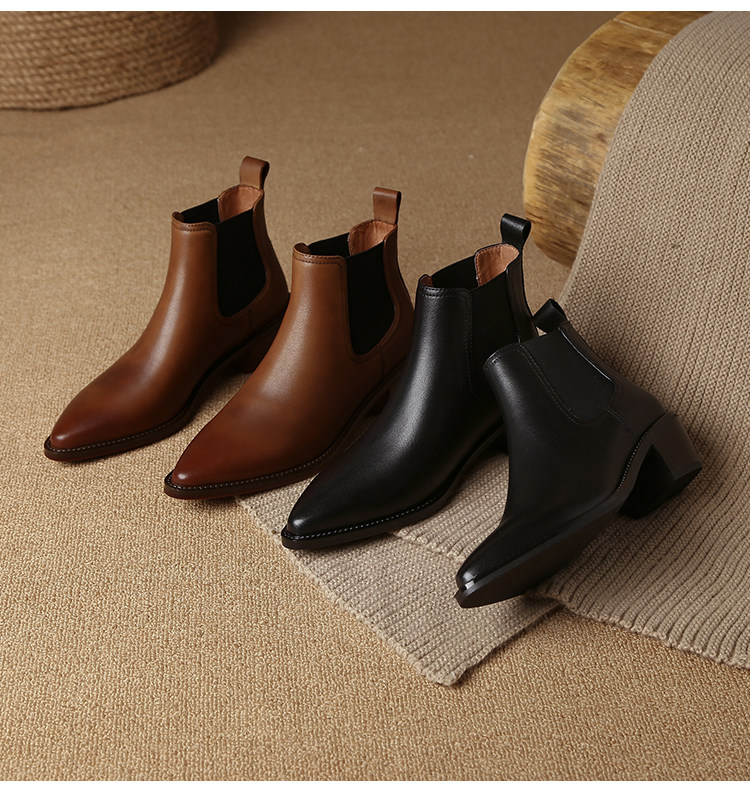 Genuine Leather Retro Pointed-Toe Chelsea Boots for Women, British Style Slimming Single Boots, Chunky Heel Short Boots, Mid-Heel Ankle Boots, Bare Boots