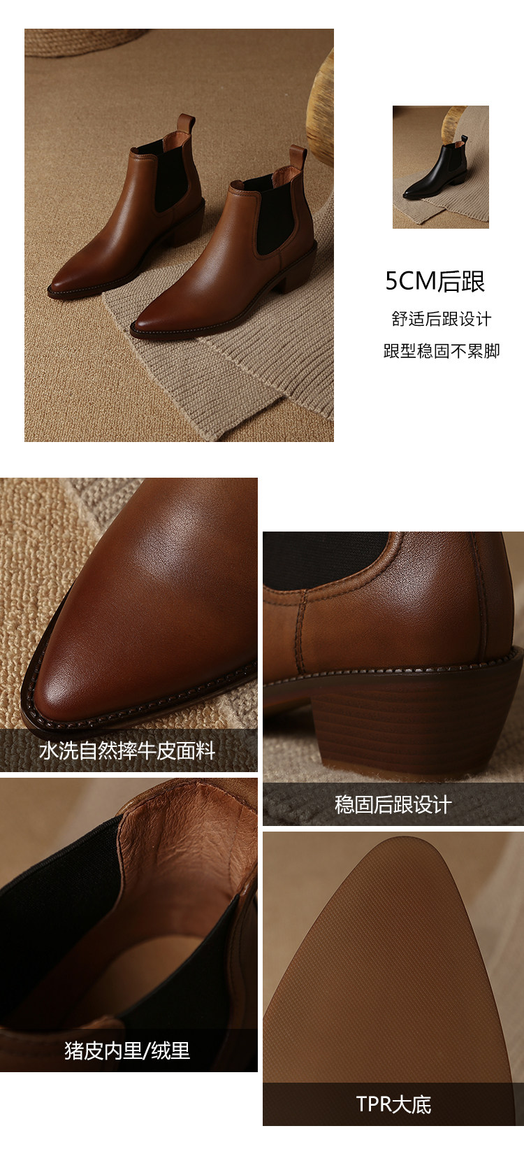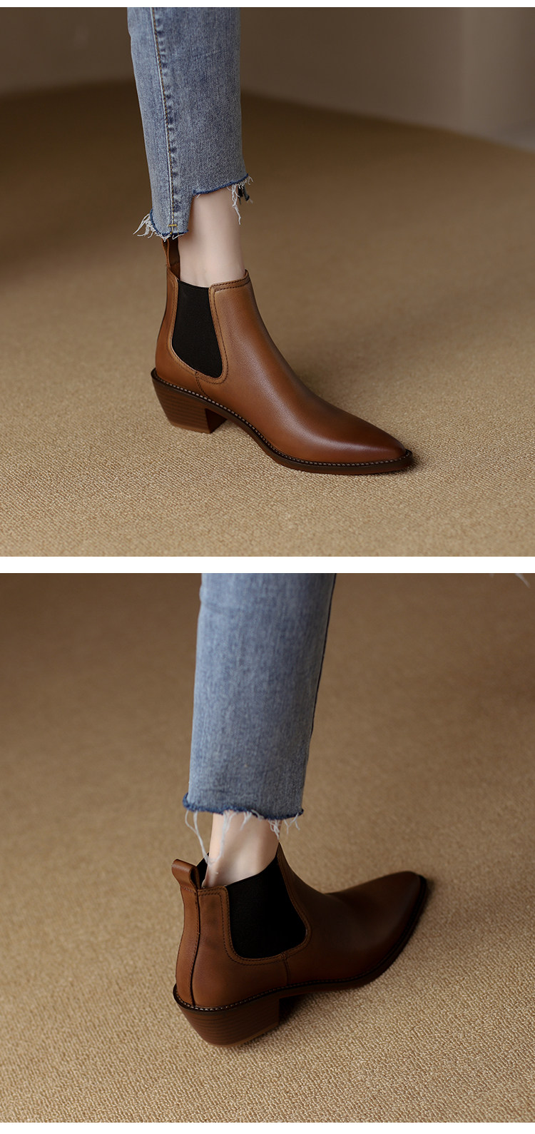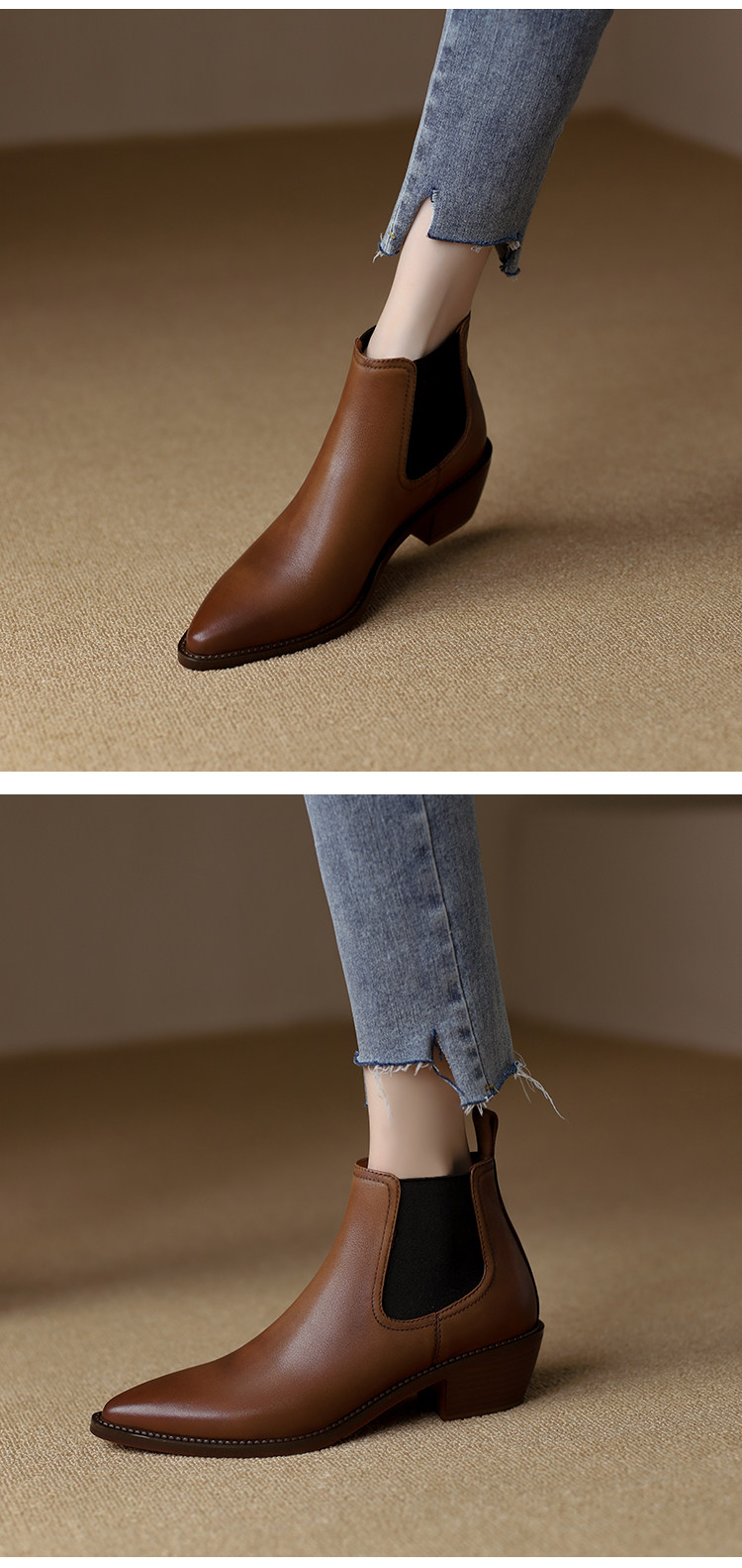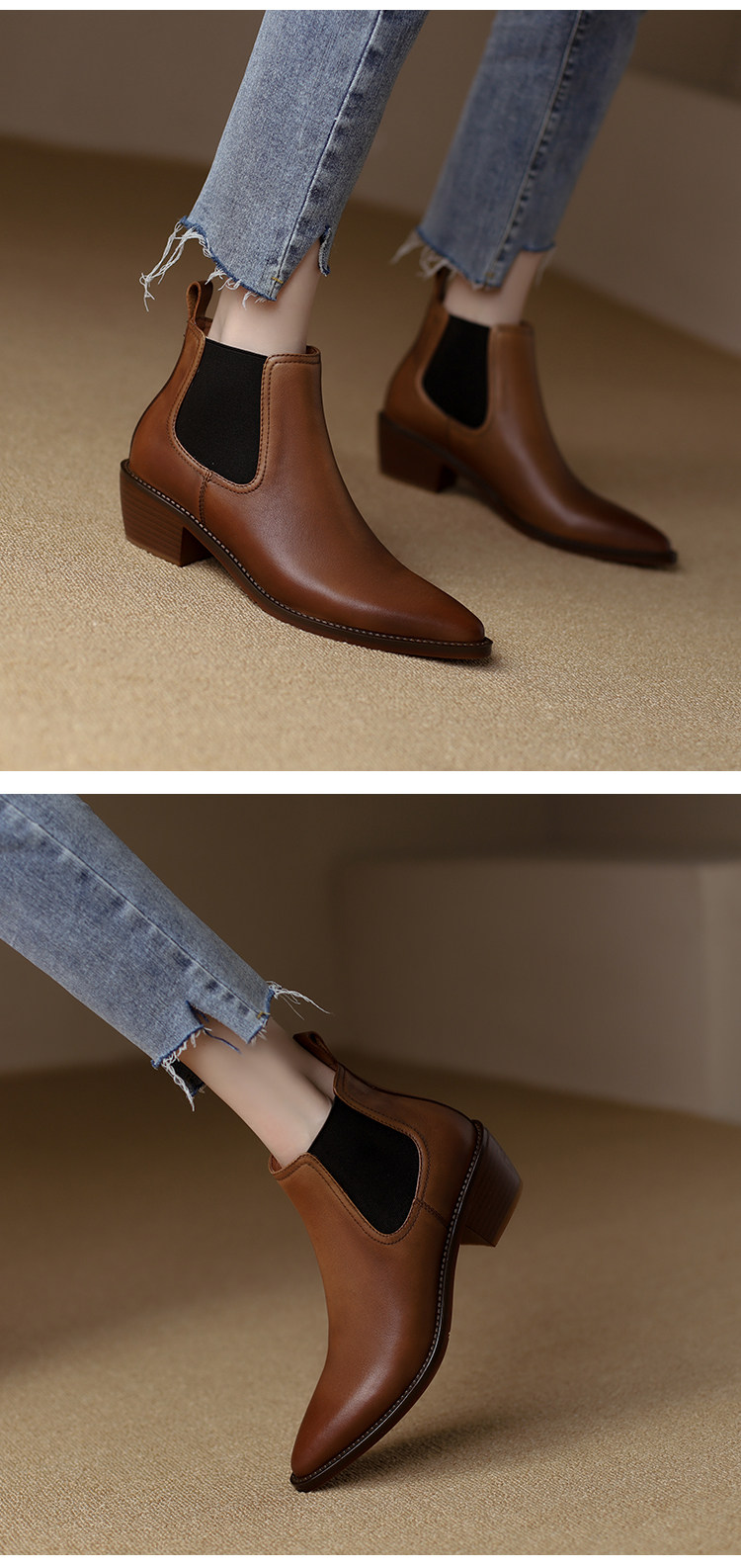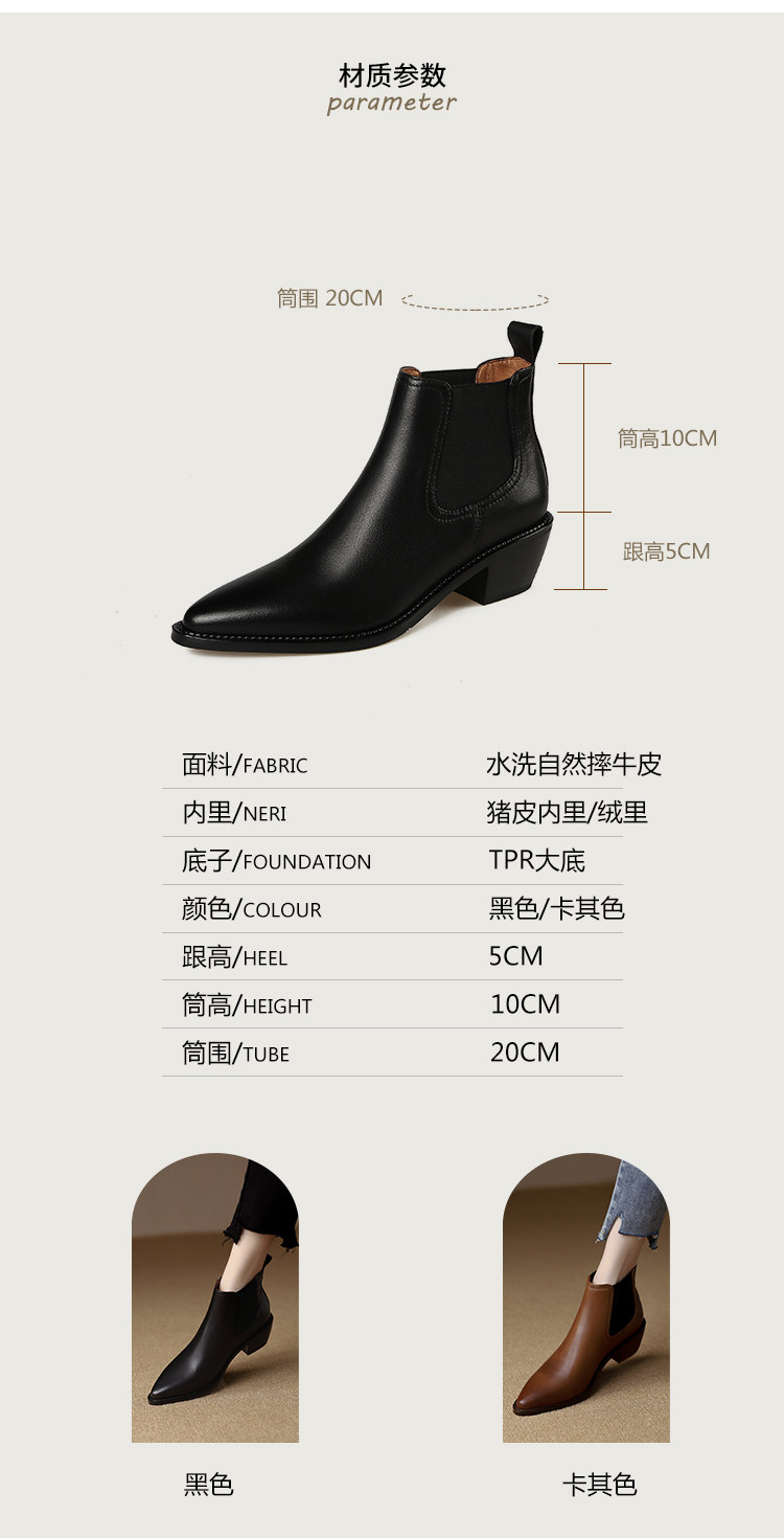 Genuine Leather Retro Pointed-Toe Chelsea Boots for Women, British Style Slimming Single Boots, Chunky Heel Short Boots, Mid-Heel Ankle Boots, Bare Boots