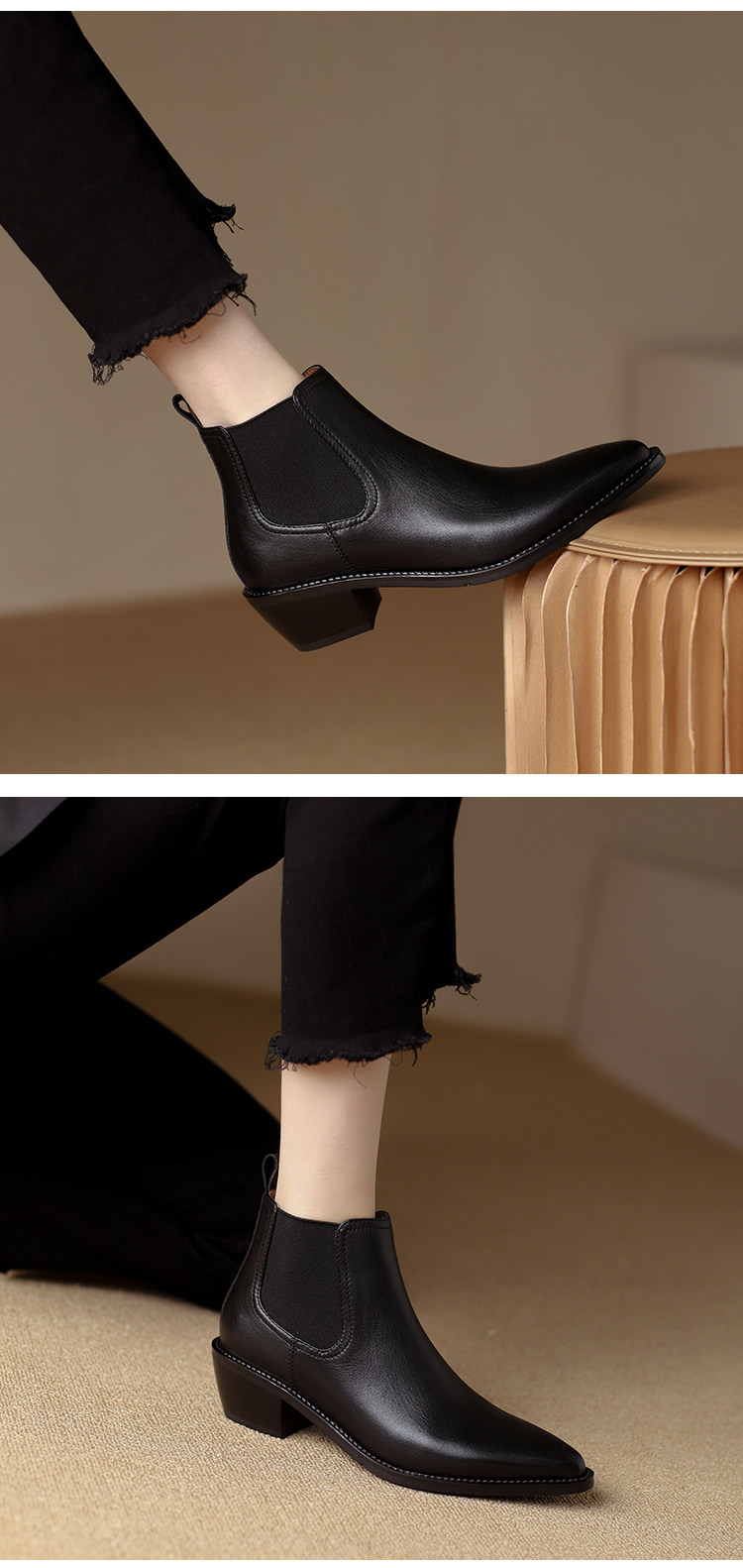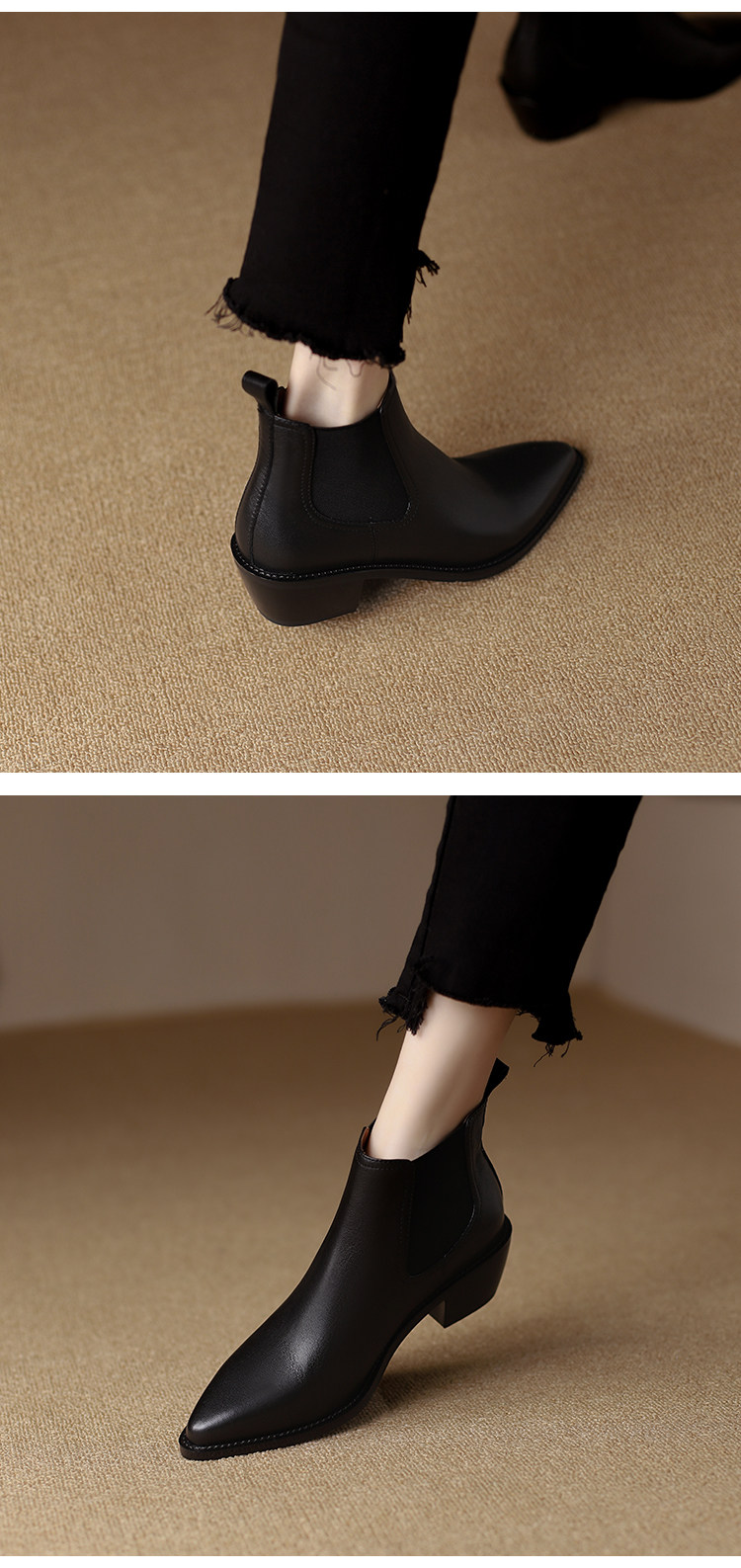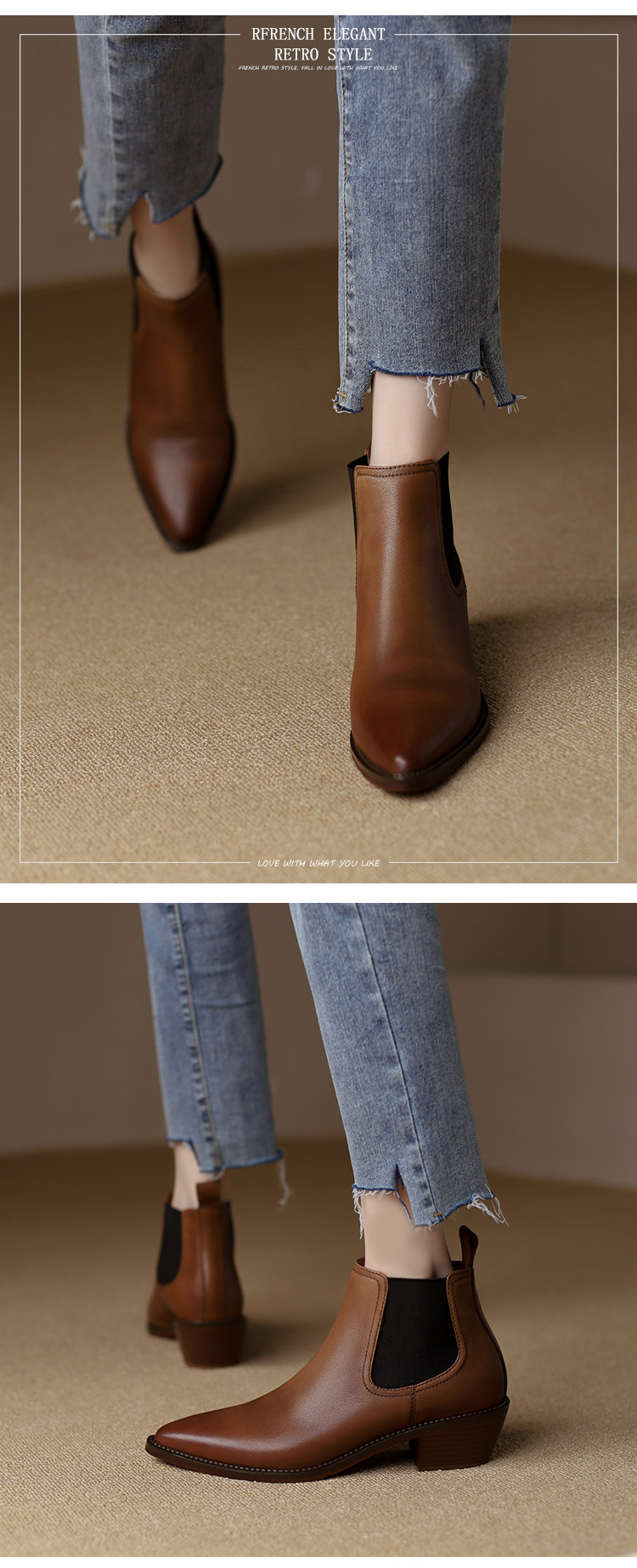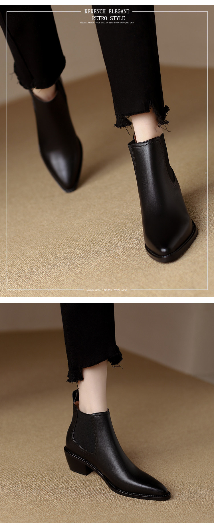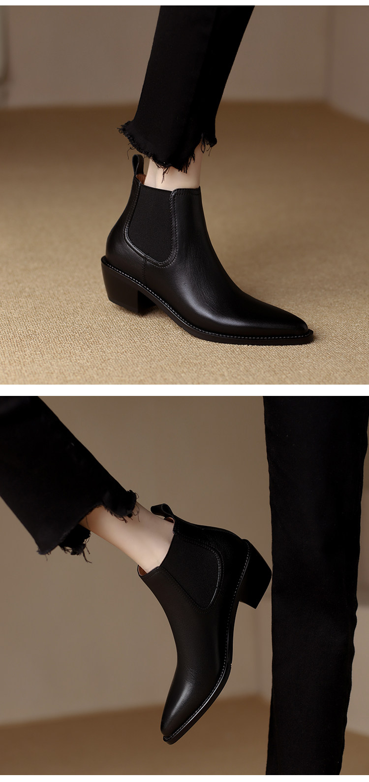 Genuine Leather Retro Pointed-Toe Chelsea Boots for Women, British Style Slimming Single Boots, Chunky Heel Short Boots, Mid-Heel Ankle Boots, Bare Boots