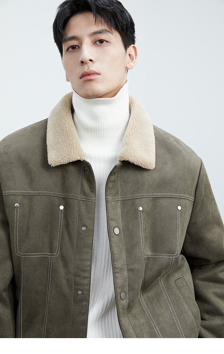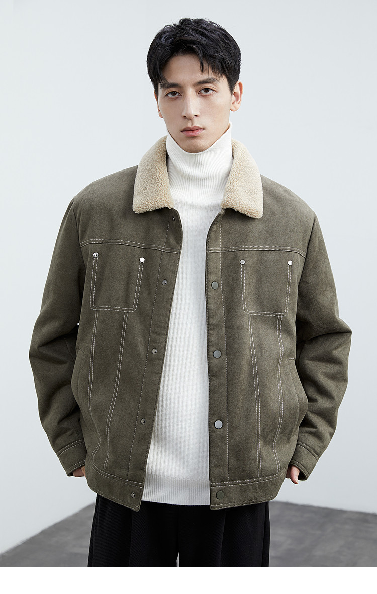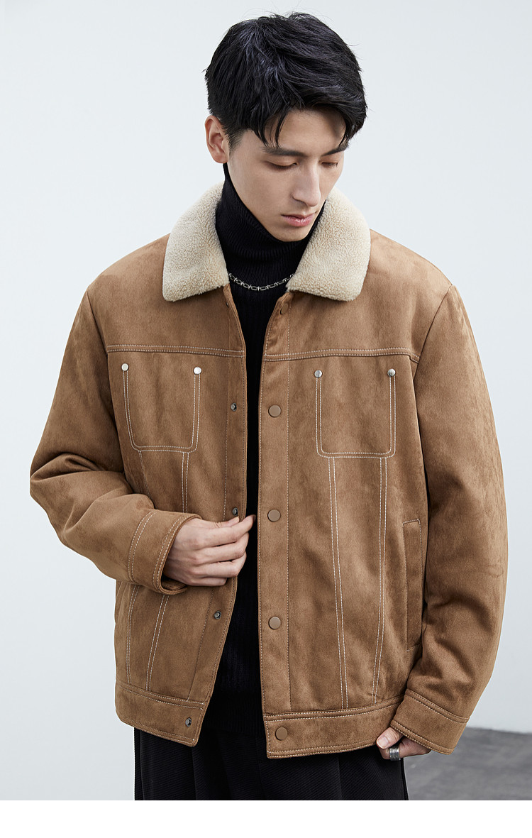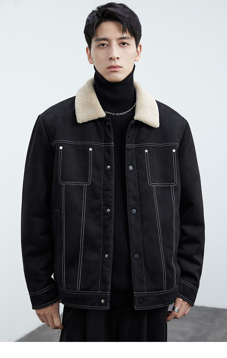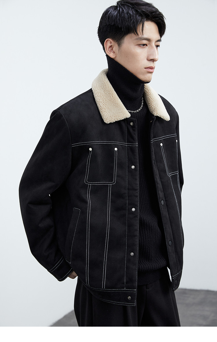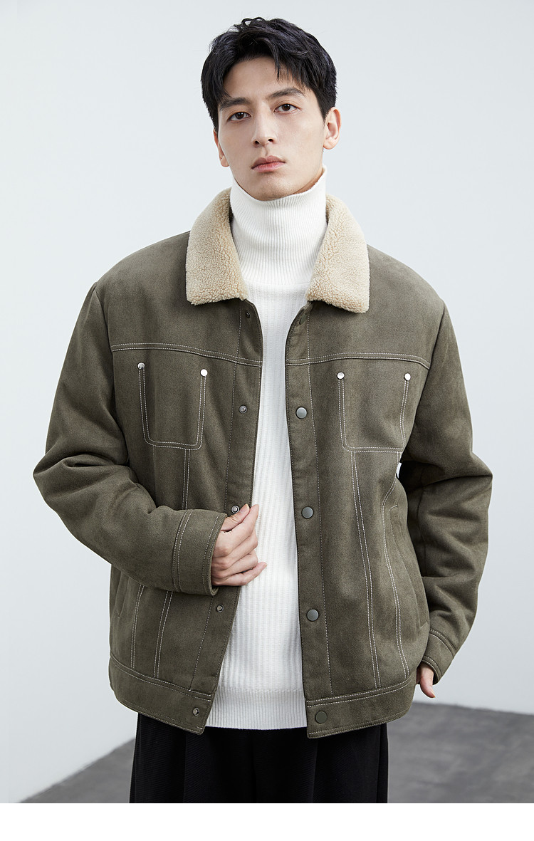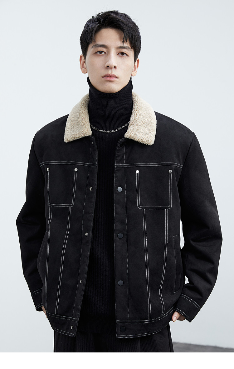 Black Zeming Men's Faux Suede Short Jacket Winter Commuting Loose Casual Thickened Cotton Jacket
