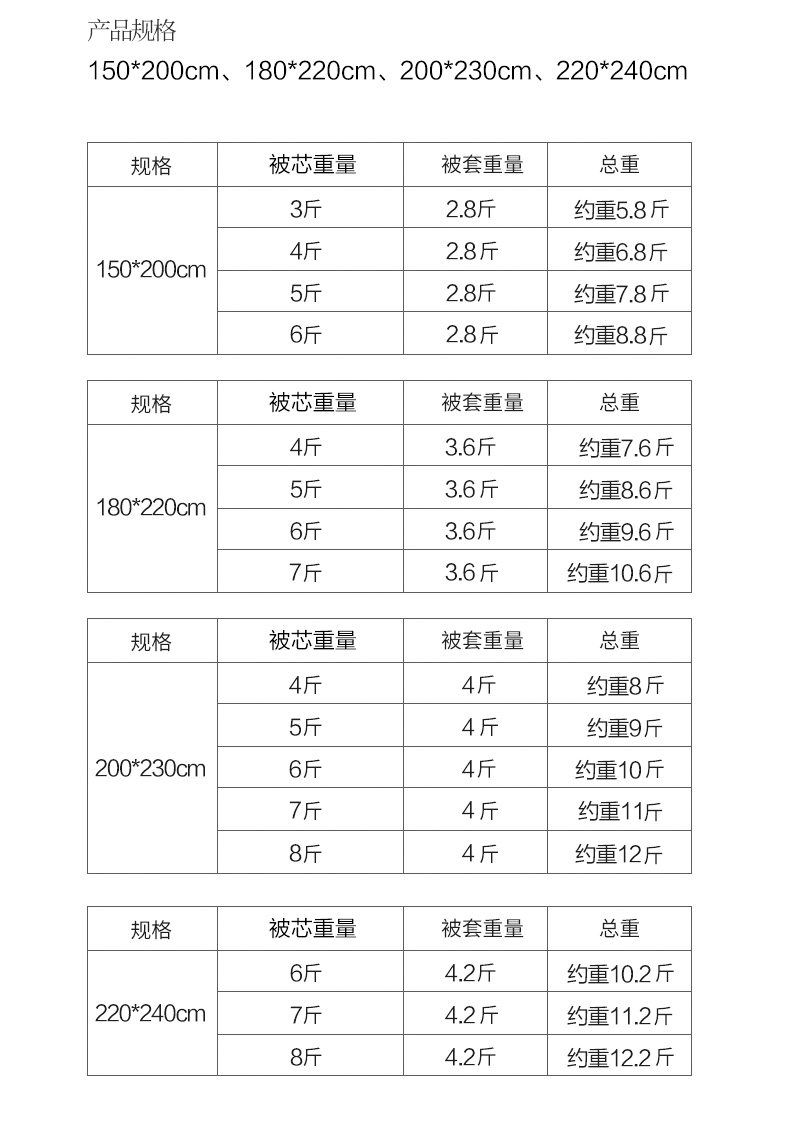 Size 150*200cm, total weight is about 5.8 Jin, Jin is equal to 0.5 kg, quilt cover + 3 Jin, Jin is equal to 0.5 kg, quilt core,150*200cm, total weight is about 6.8 Jin, Jin is equal to 0.5 kg, quilt cover + 4 Jin, Jin is equal to 0.5 kg, quilt core,150*200cm, total weight is about 7.8 Jin, Jin is equal to 0.5 kg, quilt cover + 5 Jin, Jin is equal to 0.5 kg, quilt core,150*200cm, total weight is about 8.8 Jin, Jin is equal to 0.5 kg, quilt cover + 6 Jin, Jin is equal to 0.5 kg, quilt core,180*220cm, total weight is about 7.6 Jin, Jin is equal to 0.5 kg, quilt cover + 4 Jin, Jin is equal to 0.5 kg, quilt core,180*220cm, total weight is about 8.6 Jin, Jin is equal to 0.5 kg, quilt cover + 5 Jin, Jin is equal to 0.5 kg, quilt core,180*220cm, total weight is about 9.6 Jin, Jin is equal to 0.5 kg, quilt cover + 6 Jin, Jin is equal to 0.5 kg, quilt core,180*220cm, total weight is about 10.6 Jin, Jin is equal to 0.5 kg, quilt cover + 7 Jin, Jin is equal to 0.5 kg, quilt core,200*230cm, total weight is about 8 Jin, Jin is equal to 0.5 kg, quilt cover + 4 Jin, Jin is equal to 0.5 kg, quilt core,200*230cm, total weight is about 9 Jin Jin equals 0.5 kg quilt cover + 5 Jin Jin equals 0.5 kg quilt core,200*230cm, total weight is about 10 Jin, Jin is equal to 0.5 kg, quilt cover + 6 Jin, Jin is equal to 0.5 kg, quilt core,200*230cm, total weight is about 11 Jin, Jin is equal to 0.5 kg, quilt cover + 7 Jin, Jin is equal to 0.5 kg, quilt core,200*230cm, total weight is about 12 Jin, Jin is equal to 0.5 kg, quilt cover + 8 Jin, Jin is equal to 0.5 kg, quilt core,220*240cm, total weight is about 10.2 Jin, Jin is equal to 0.5 kg, quilt cover + 6 Jin, Jin is equal to 0.5 kg, quilt core,220*240cm, total weight is about 11.2 Jin, Jin is equal to 0.5 kg, quilt cover + 7 Jin, Jin is equal to 0.5 kg, quilt core,220*240cm, total weight is about 12.2 Jin, Jin is equal to 0.5 kg, quilt cover + 8 Jin, Jin is equal to 0.5 kg, quilt core