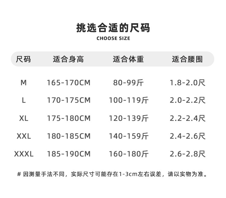 尺码 M 80-99斤,L 100-119斤,XL 120-139斤,XXL 140-159斤,XXXL 160-180斤