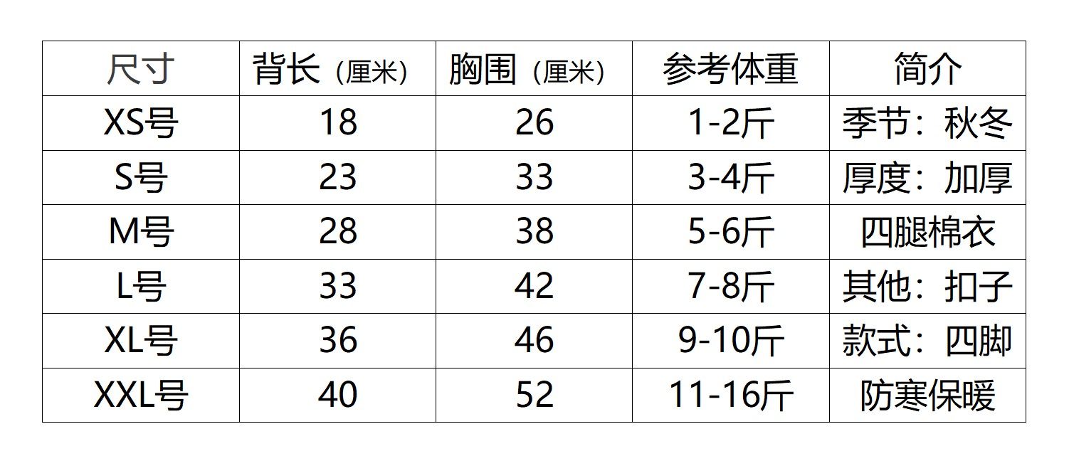 Size XS Back Length 18cm (Recommended 0.5-1.0kg),Size S Back Length 23 (Recommended 1.5-2kg),Size m Back Length 28 (Recommended 2.5-3kg),Size L Back Length 33 (Recommended 3.5-4kg),XL Size Back Length 36 (Recommended 4.5-5kg),XXL Size Back Length 40 (Recommended 5.5-8kg)