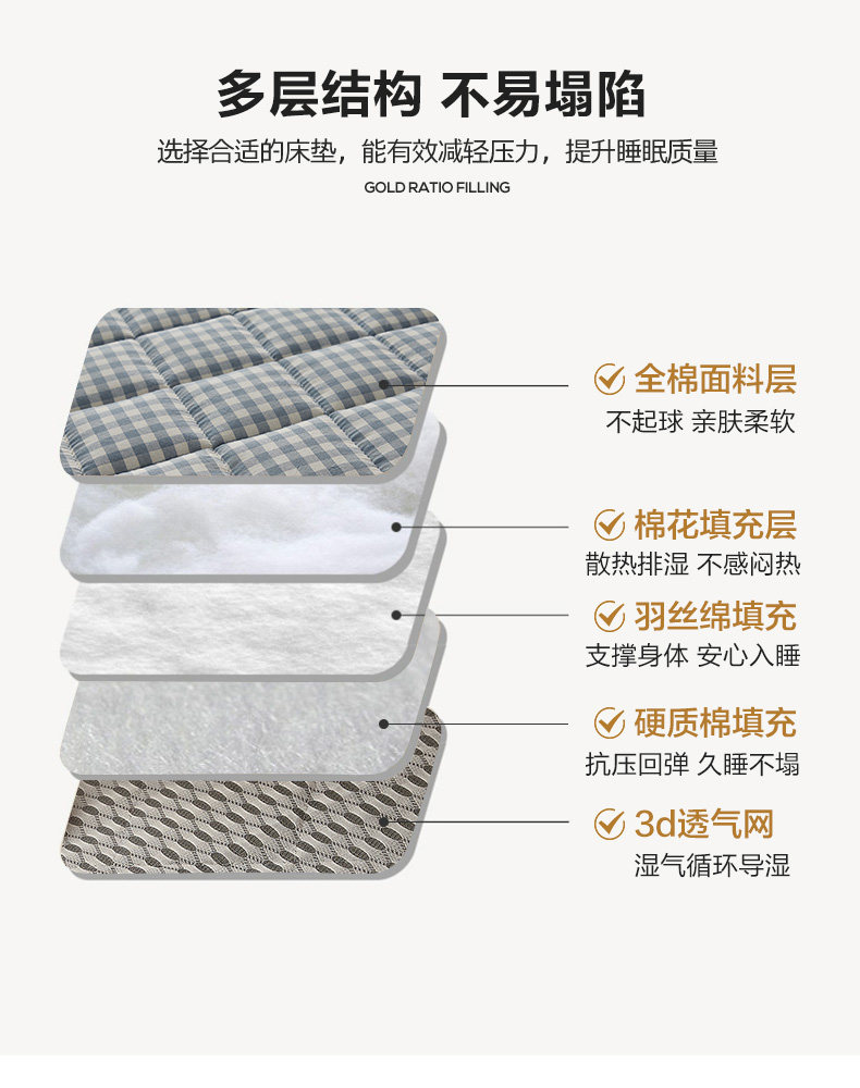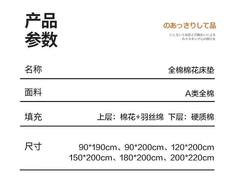 Applicable Bed Size 80x190cm[Class a Cotton Fabric, about 5cm Thick],90x190cm[Class a Cotton Fabric, about 5cm Thick],90x200cm[Class a Cotton Fabric, about 5cm Thick],120x200cm[Class a Cotton Fabric, about 5cm Thick],150x190cm[Class a Cotton Fabric, about 5cm Thick],150x200cm[Class a Cotton Fabric, about 5cm Thick],180x200cm[Class a Cotton Fabric, about 5cm Thick],200X220cm[Class a Cotton Fabric, about 5cm Thick]