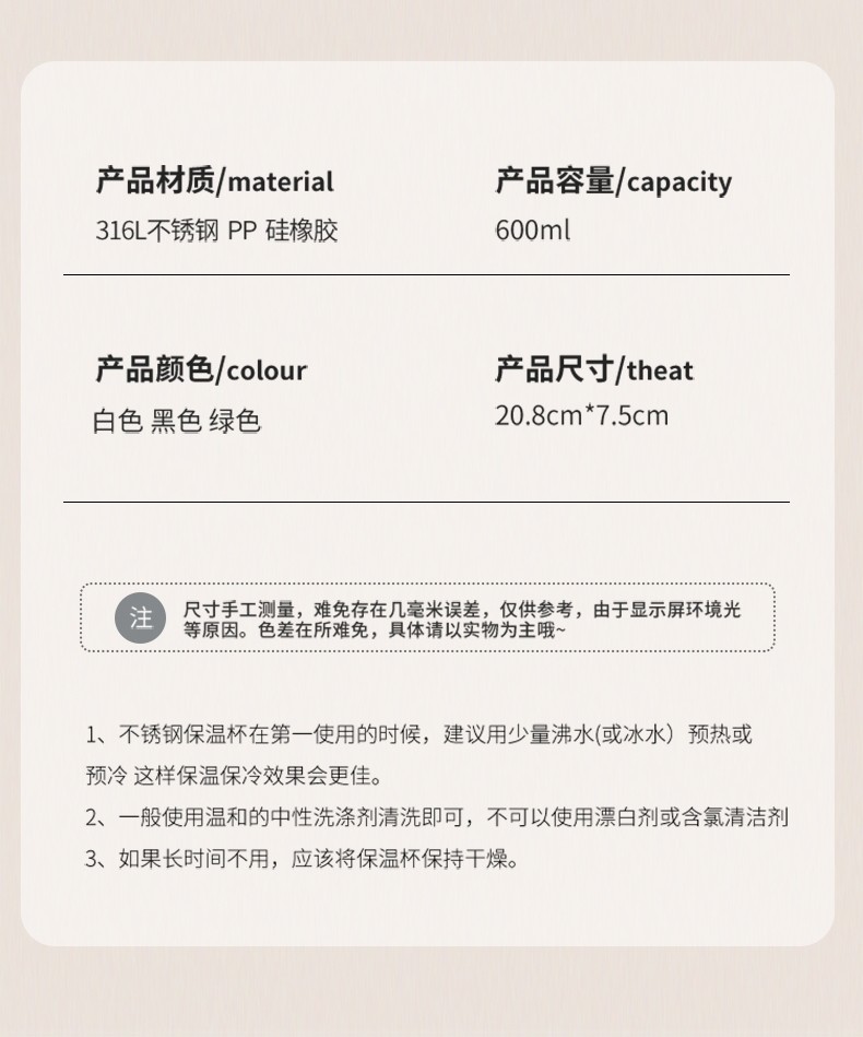 Color Classification (New Model) Black 600ml [Upgraded 316 Stainless Steel + Free Engraving],(New Model) White 600ml [Upgraded to 316 Stainless Steel + Free Engraving],(New Model) Green 600ml [Upgraded to 316 Stainless Steel + Free Engraving],White 600ml [316 Liner + Convenient Double Mouth + Nylon Carrying Rope],Black 600ml [316 Liner + Convenient Double Mouth + Nylon Carrying Rope],Pink 600ml [316 Liner + Convenient Double Mouth + Nylon Carrying Rope],Blue 600ml [304 Stainless Steel + Free Engraving + Cup Brush],(316 Liner) 500ml White