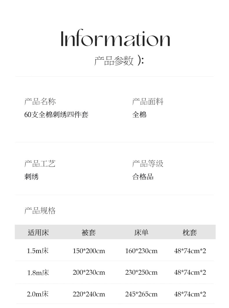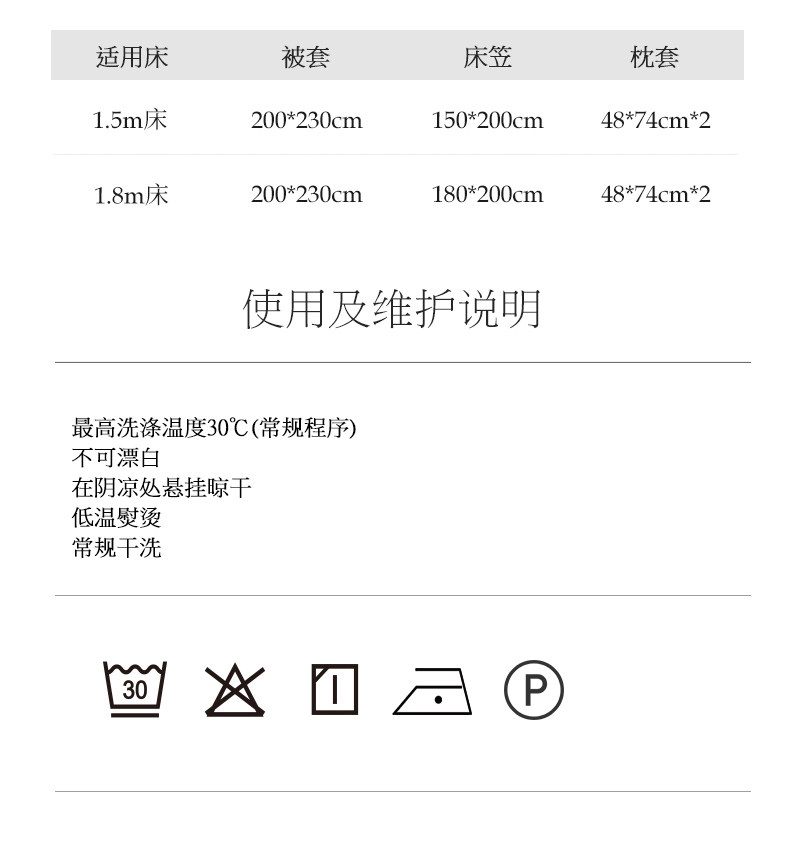 Applicable bed size 1.2m sheet three-piece set (suitable for 150*200cm quilt core),1.5m sheet four-piece set (suitable for 200*230cm quilt core),1.8m sheet four-piece set (suitable for 200*230cm quilt core),2.0m sheet four-piece set (suitable for 220*240cm quilt core),1.5m bed cover four-piece set (suitable for 200*230cm quilt core),1.8m bed cover four-piece set (suitable for 200*230cm quilt core)