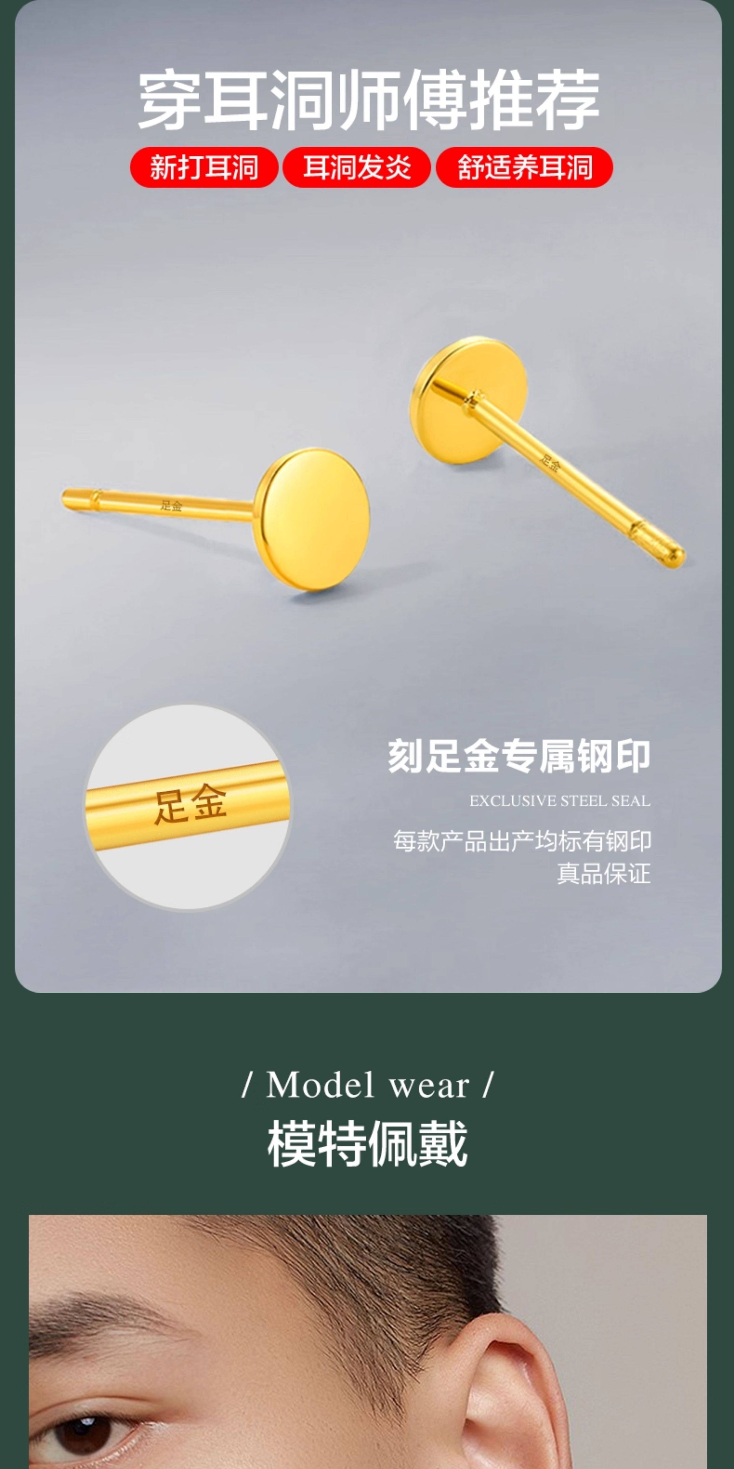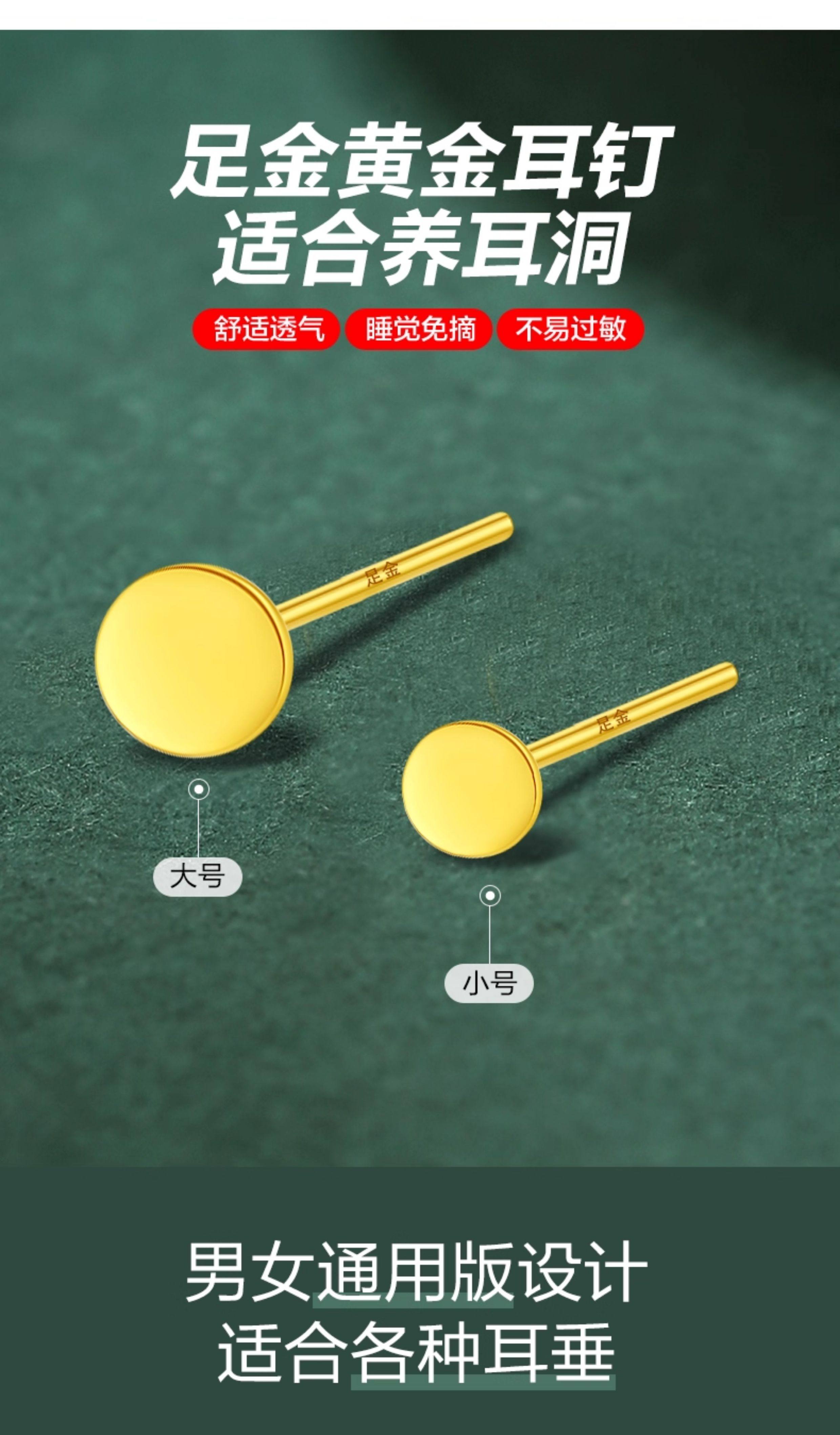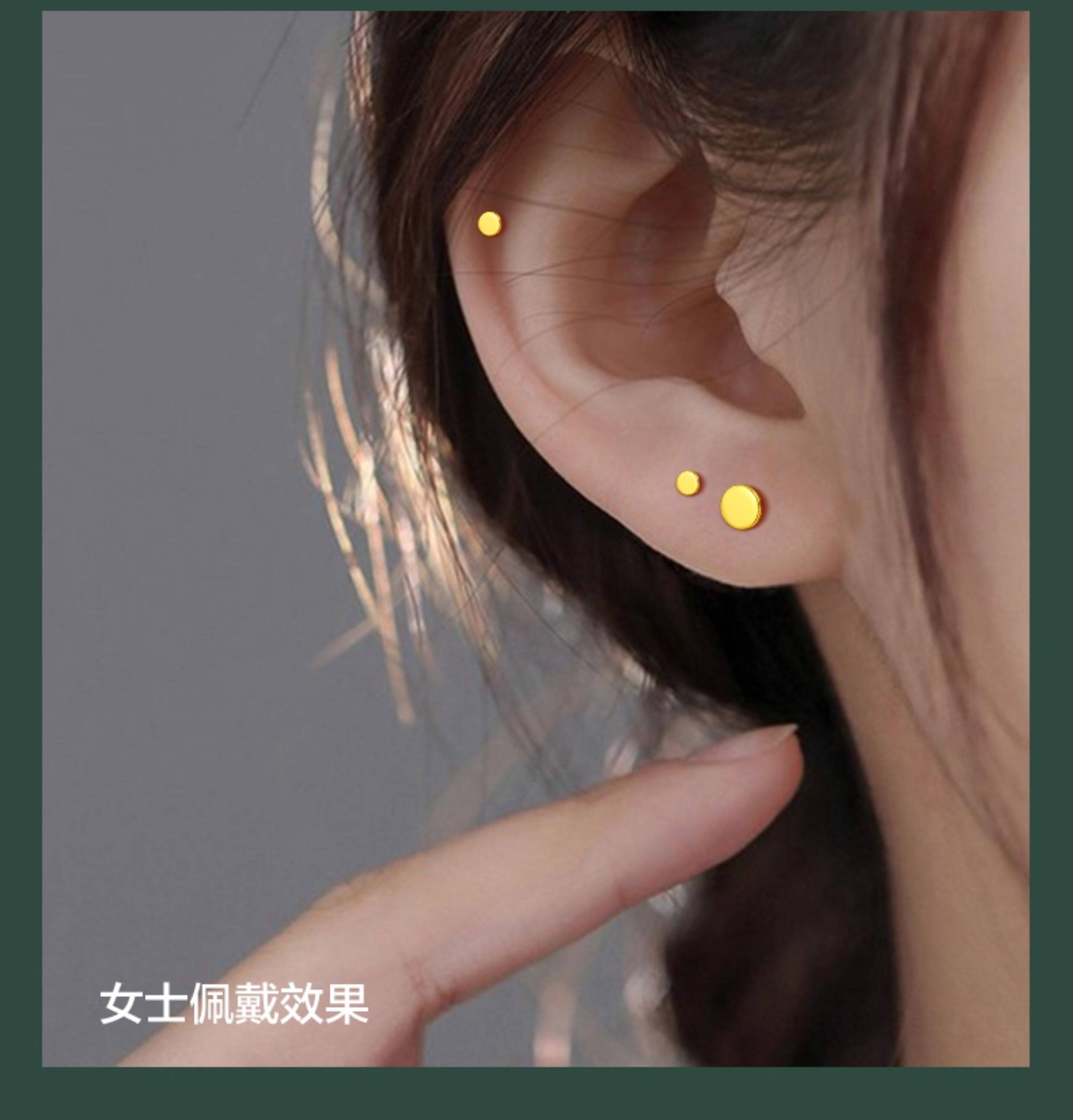 Specifications Single small gold stud earring (diameter 3mm, approximately 0.17g),A pair of small gold stud earrings (diameter 3mm, approximately 0.34g),Single large gold stud earring (diameter 5mm, approximately 0.21g),A pair of large gold stud earrings (diameter 5mm, approximately 0.42g)