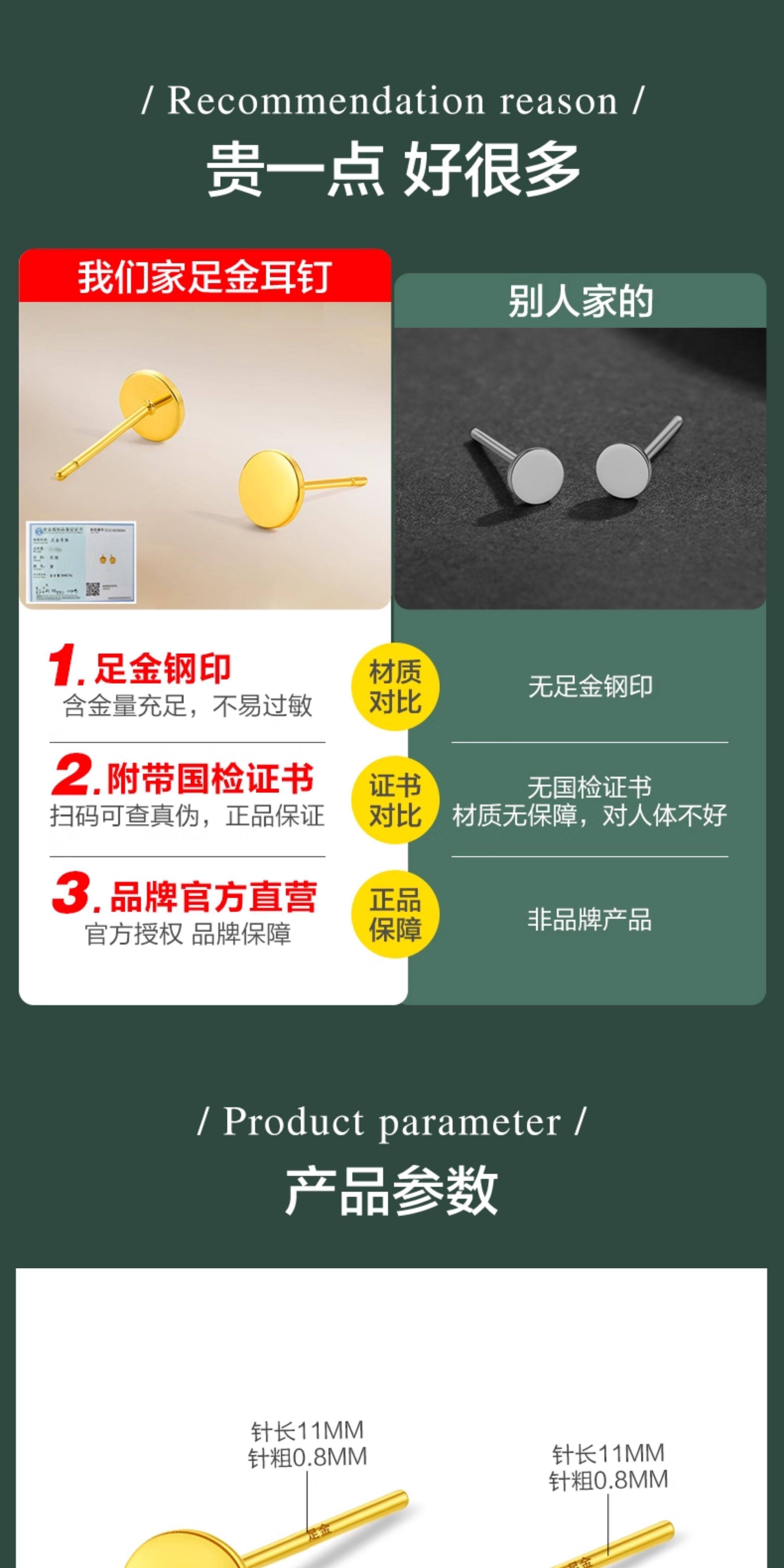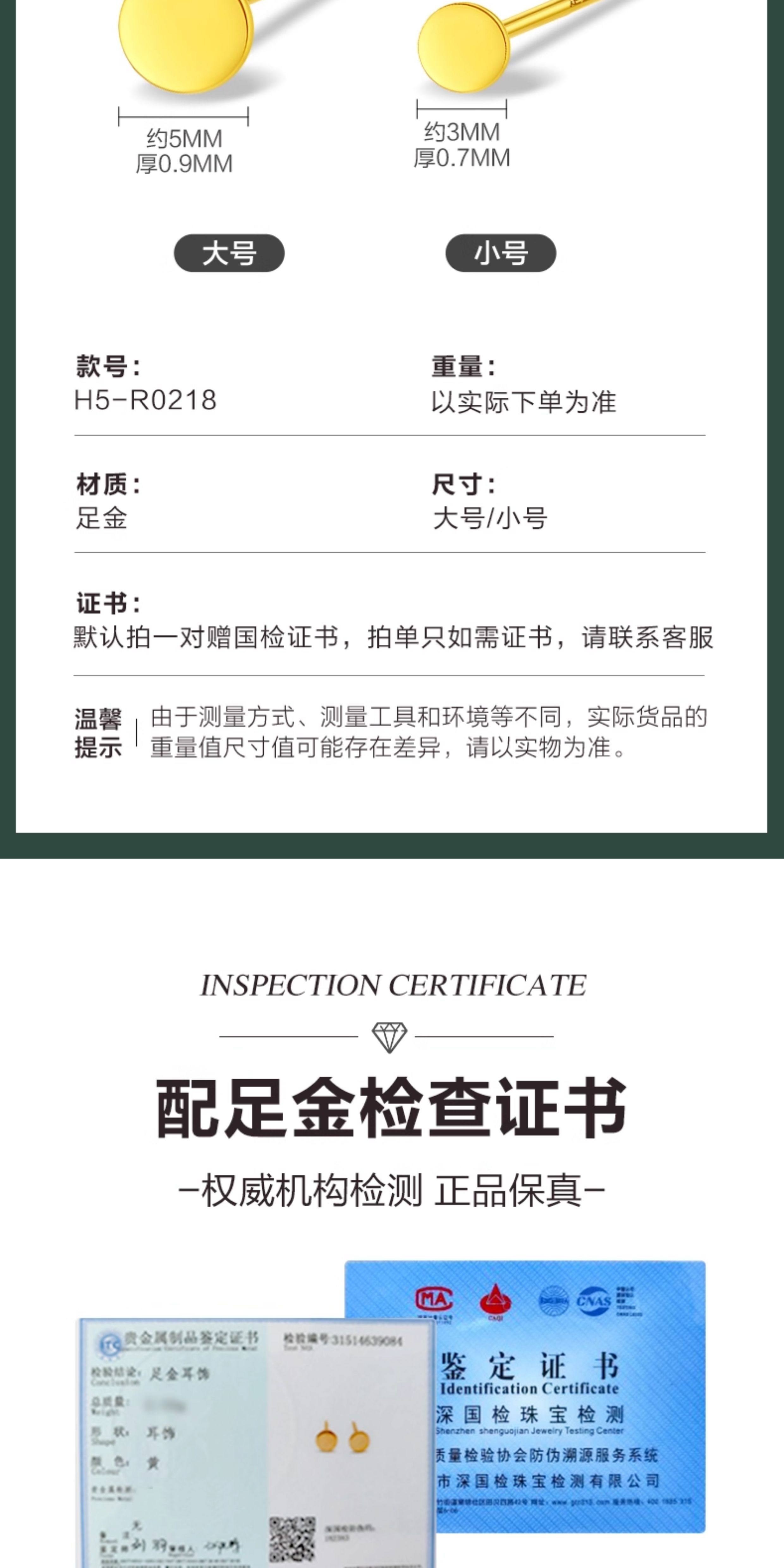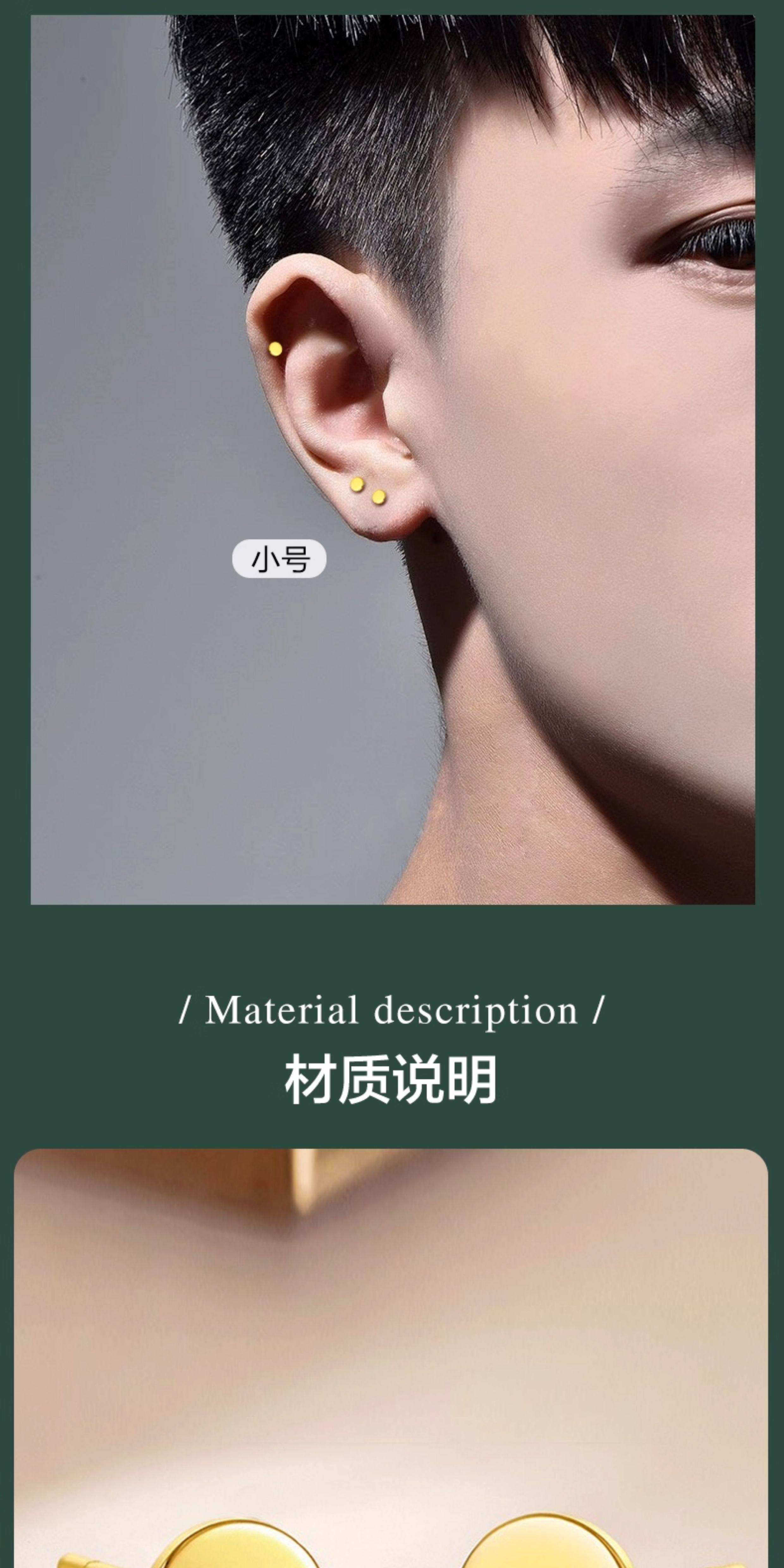 Specifications Single small gold stud earring (diameter 3mm, approximately 0.17g),A pair of small gold stud earrings (diameter 3mm, approximately 0.34g),Single large gold stud earring (diameter 5mm, approximately 0.21g),A pair of large gold stud earrings (diameter 5mm, approximately 0.42g)