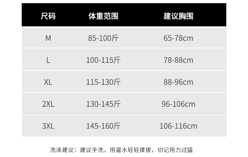Size M (suitable for 80-100 Jin Jin equals 0.5 kg),L (suitable for 100-115 Jin Jin equals 0.5 kg),XL (suitable for 115-130 Jin Jin equals 0.5 kg),XXL (suitable for 130-145 Jin Jin equal to 0.5 kg),3XL (suitable for 145-160Jin Jin equal to 0.5kg),4XL (suitable for 160-180Jin Jin equal to 0.5kg)