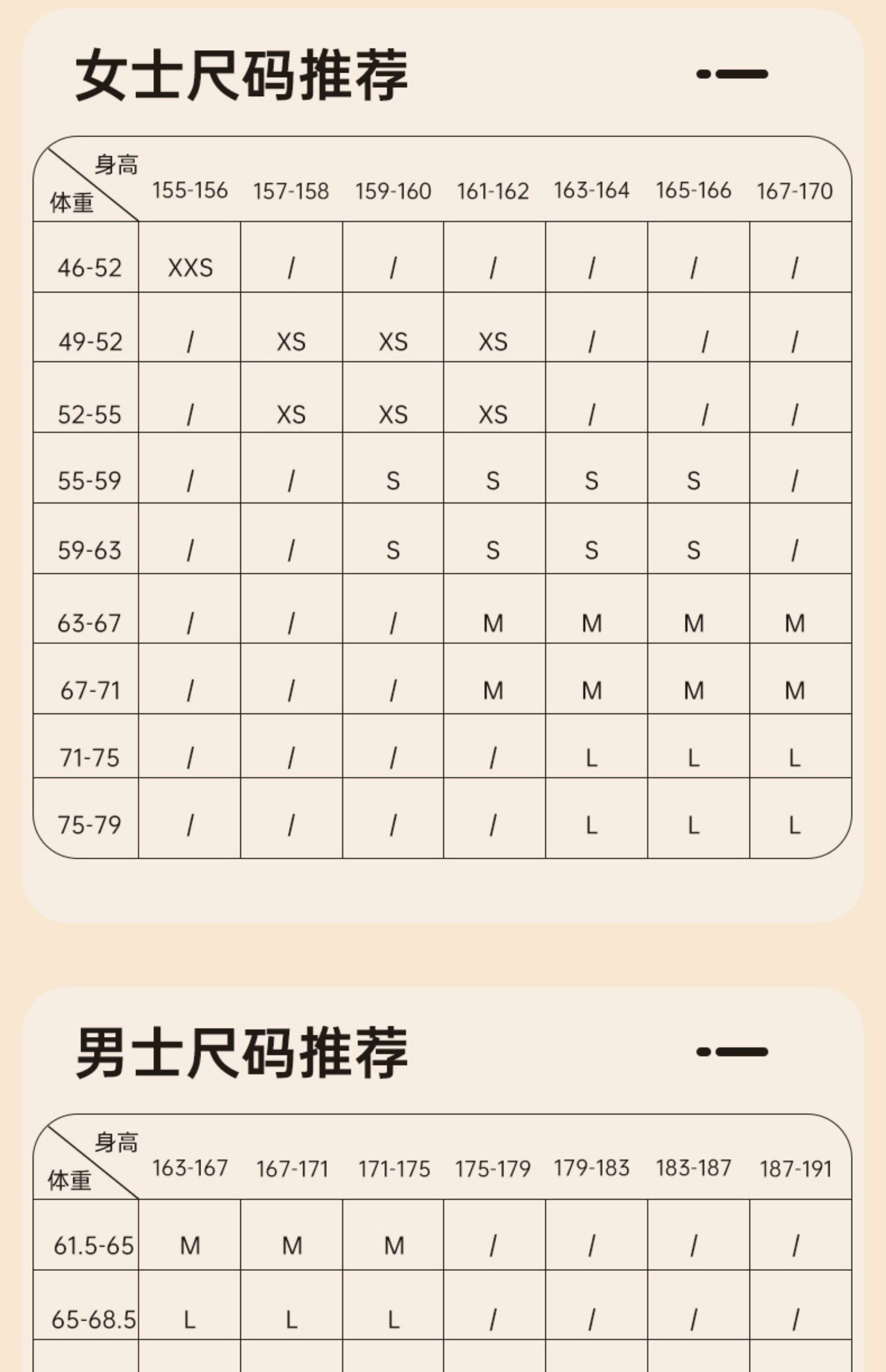 China (cm) 160-165/84-86 165-170 / 88-90 167-172 / 92-96 168-173 / 98-102 170-176 / 106-110