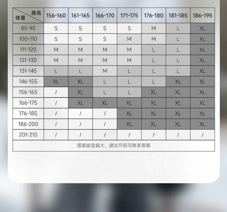 China (cm) 160-165/84-86 165-170 / 88-90 167-172 / 92-96 168-173 / 98-102 170-176 / 106-110