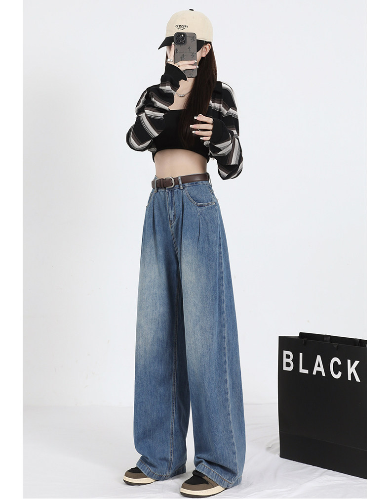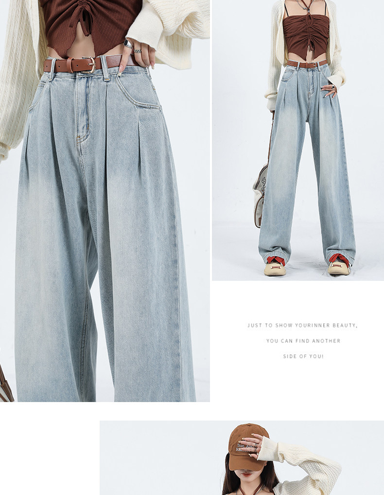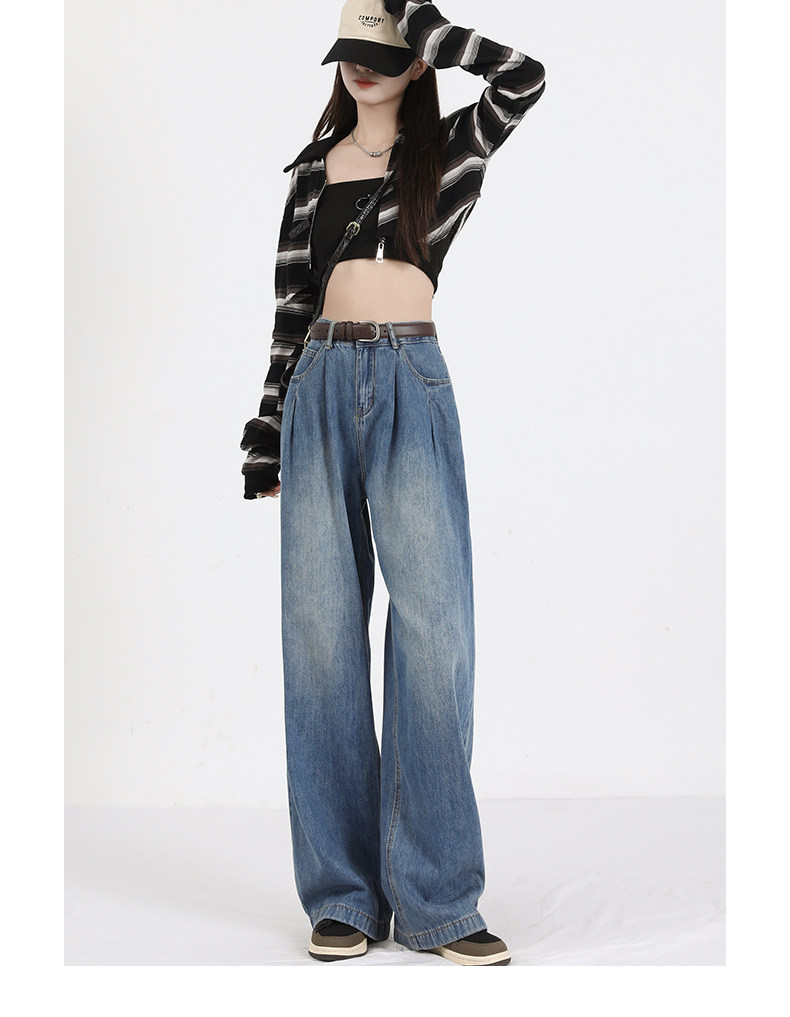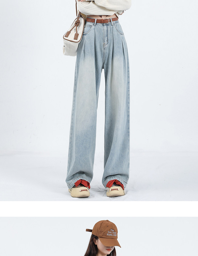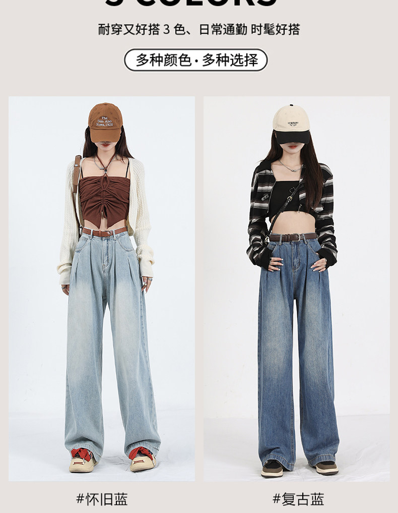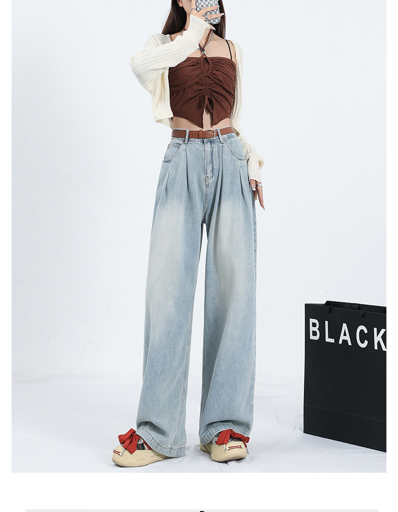 Nostalgic wide-leg jeans for women in spring and summer, loose straight high-waist pleated distressed soft super-soft drape floor-length trousers