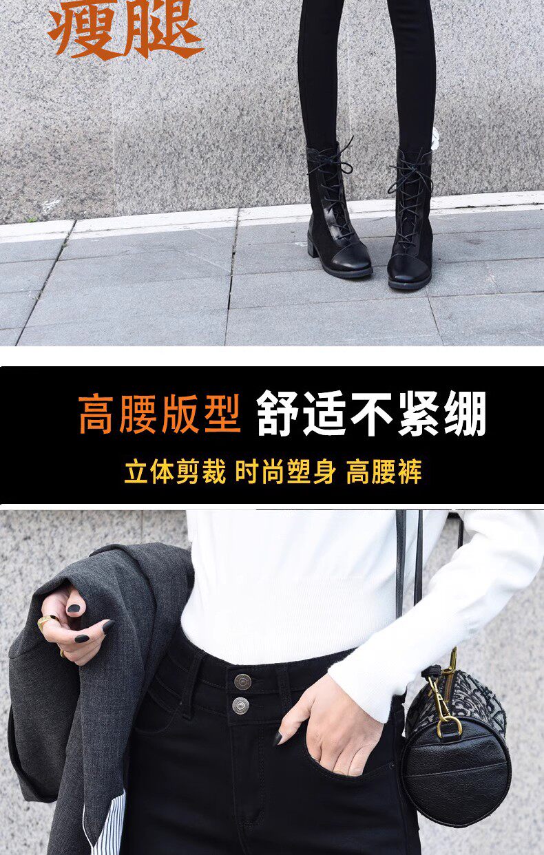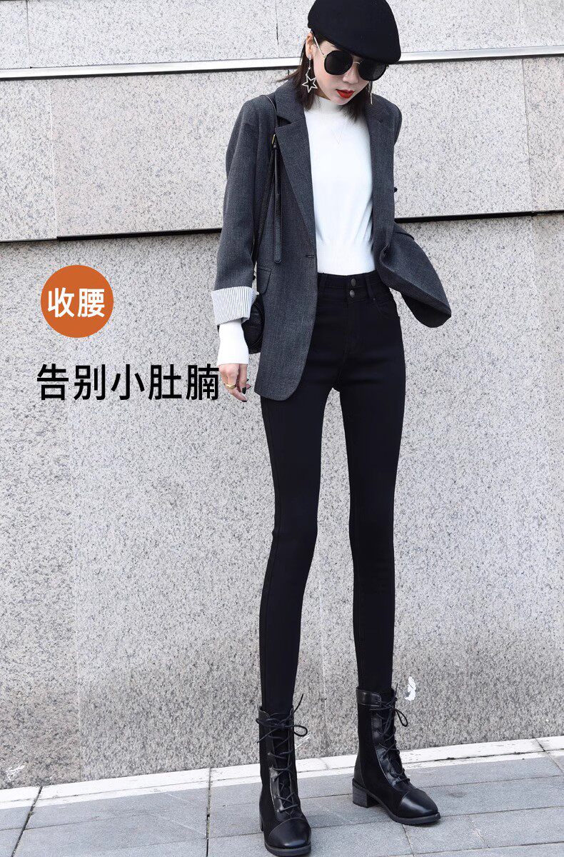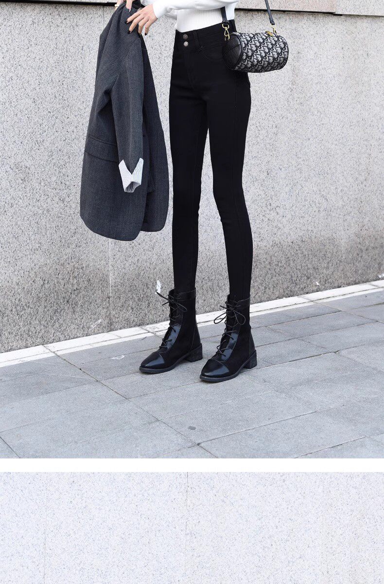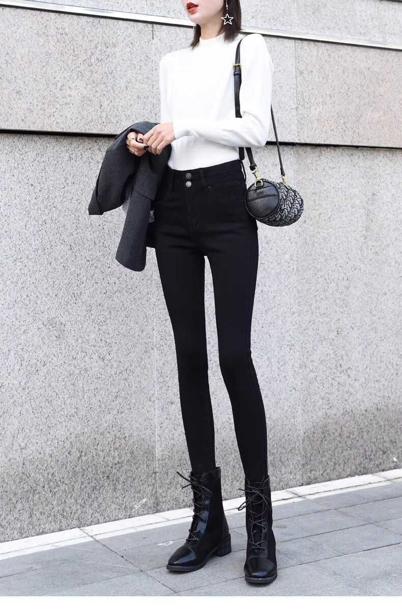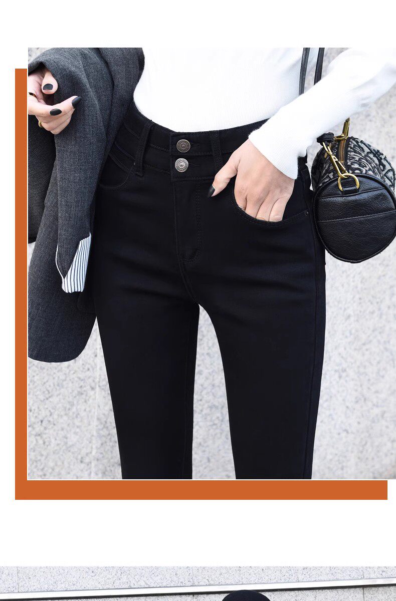 Black High-Waisted Fleece-Lined Skinny Jeans for Women, Slim-Fit, Stretchy, Suitable for Fall and Winter 2025, Ankle-Length