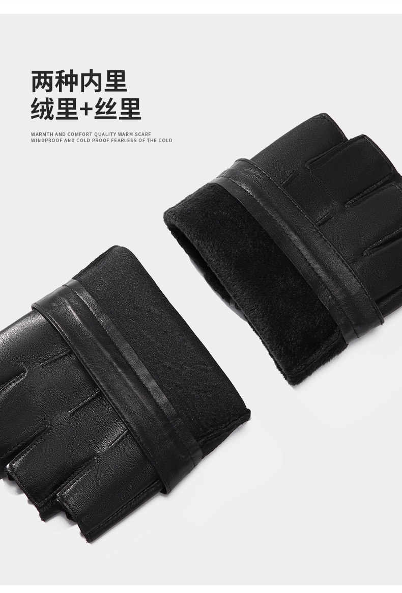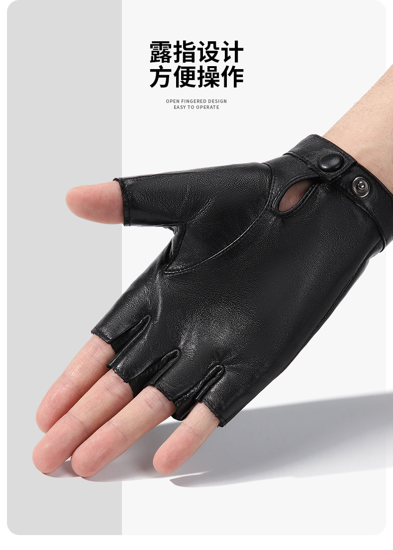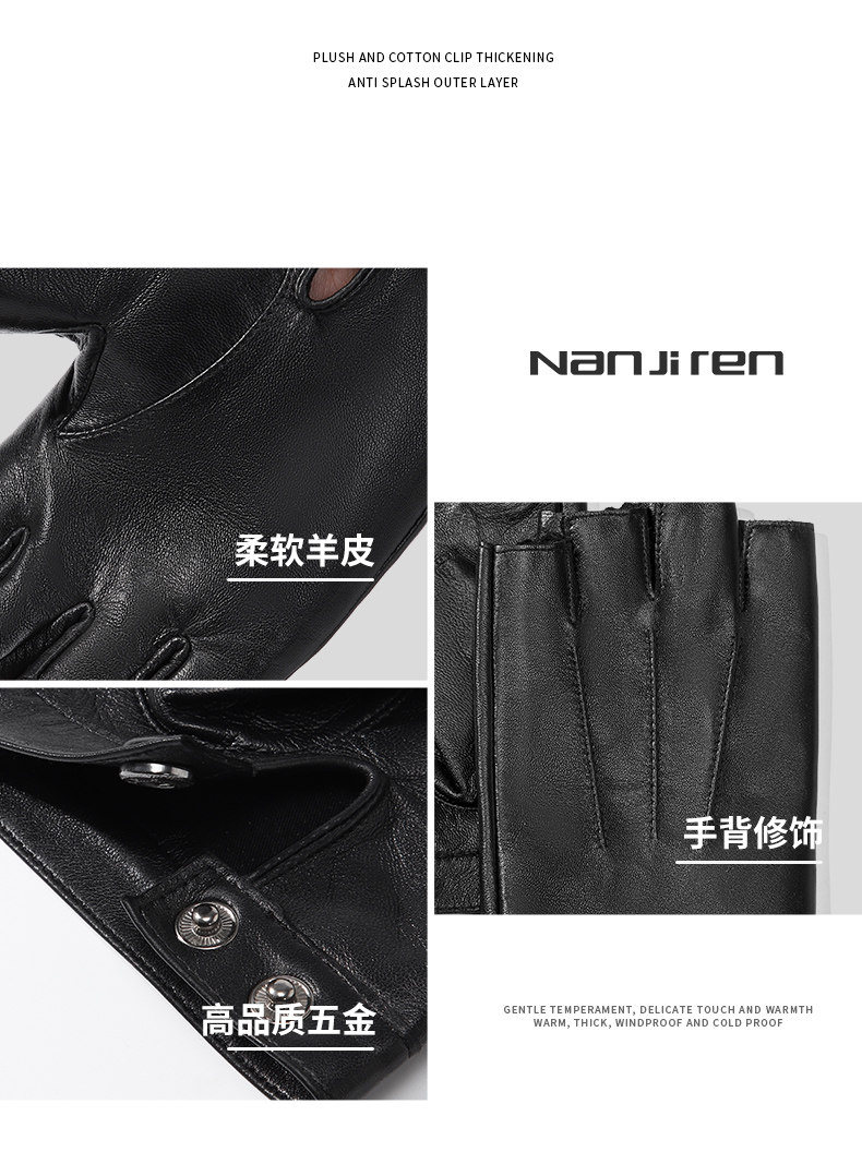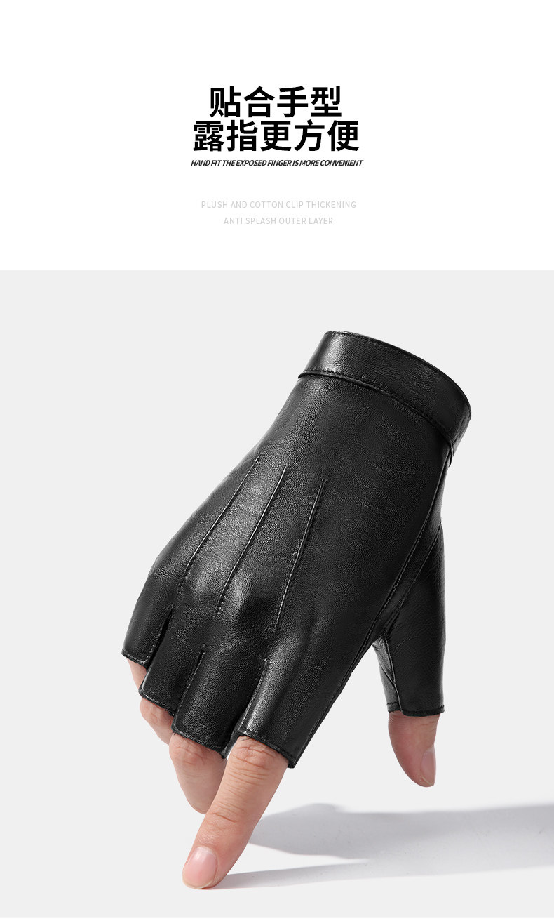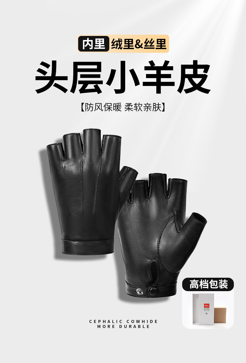 Genuine Leather Half-Finger Gloves for Men, First-Layer Lambskin, Vintage Cycling, Warm, Fleece-Lined, Fingerless Motorcycle Riding Gloves
