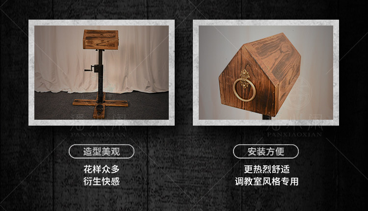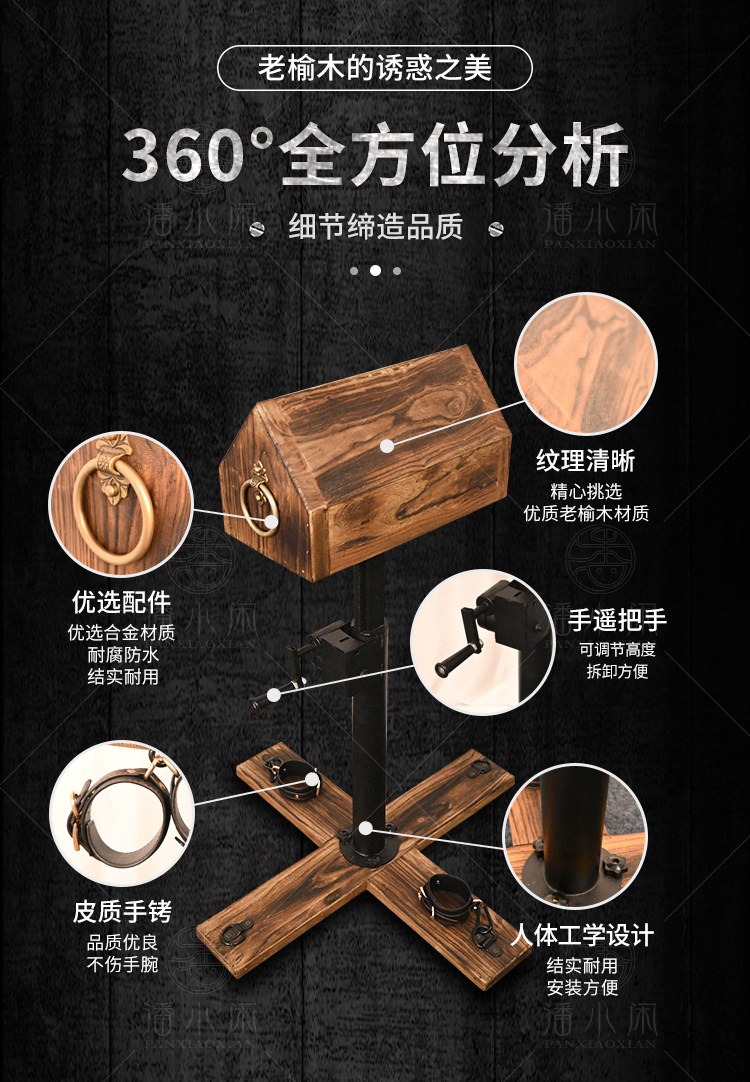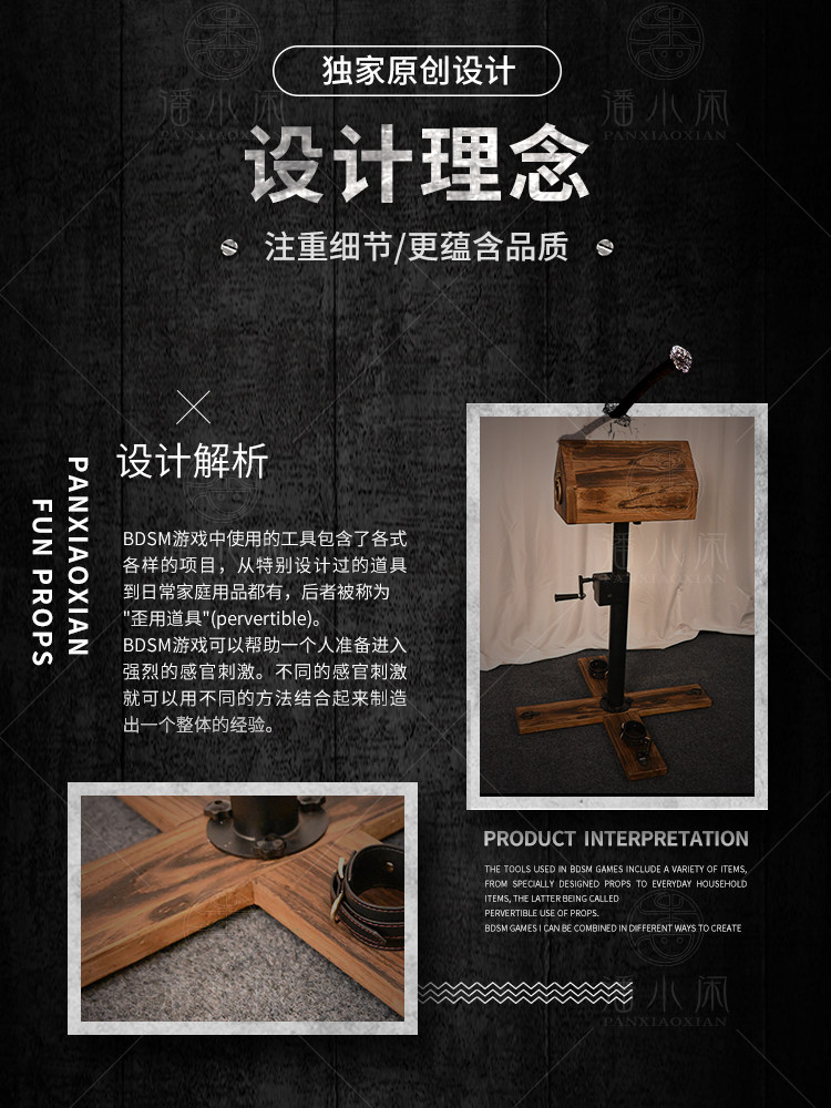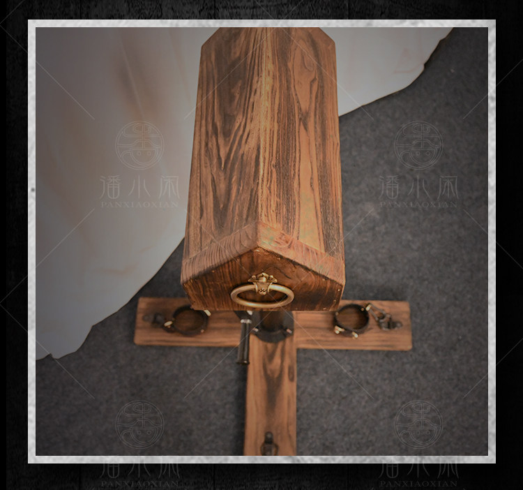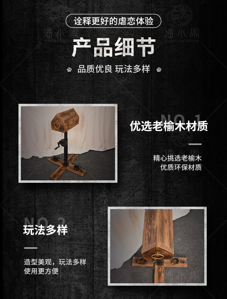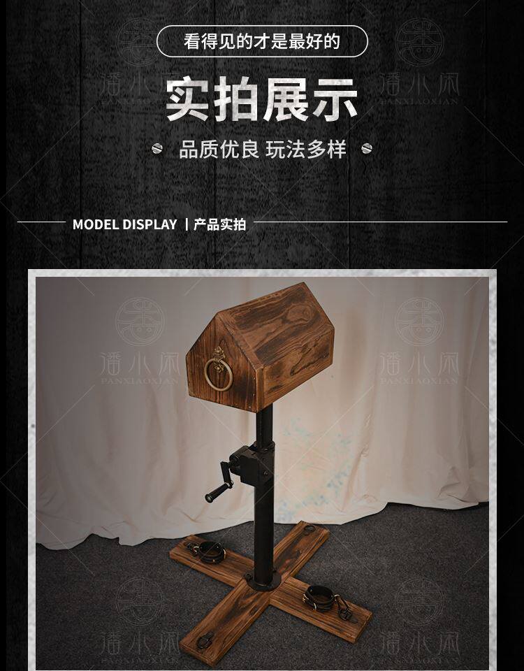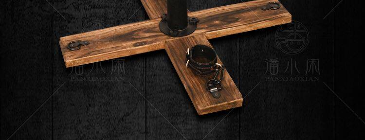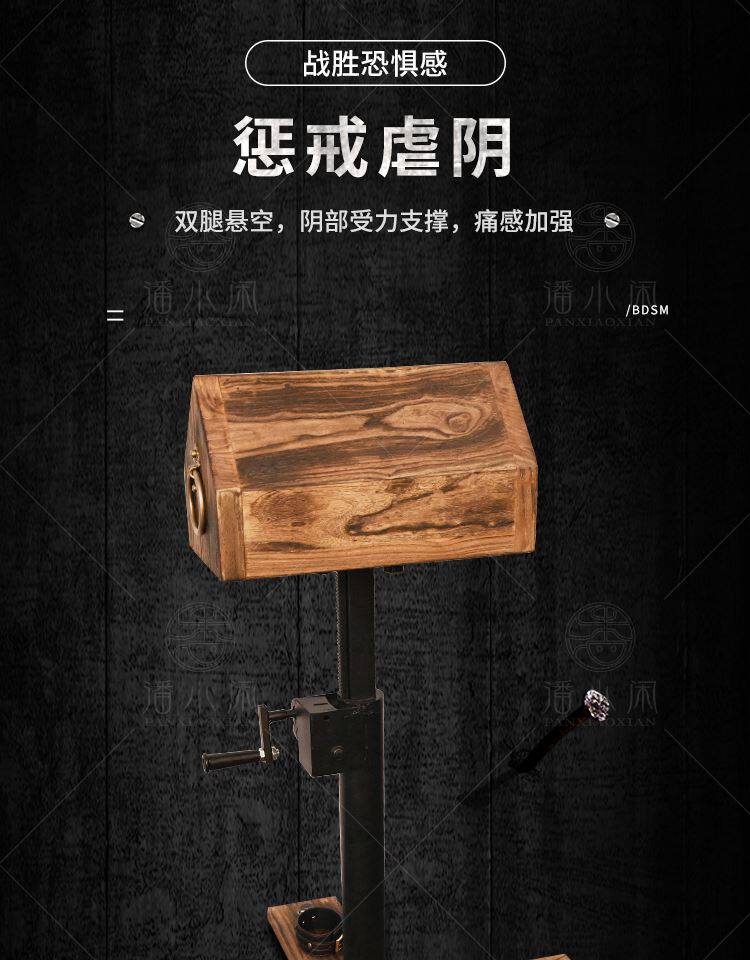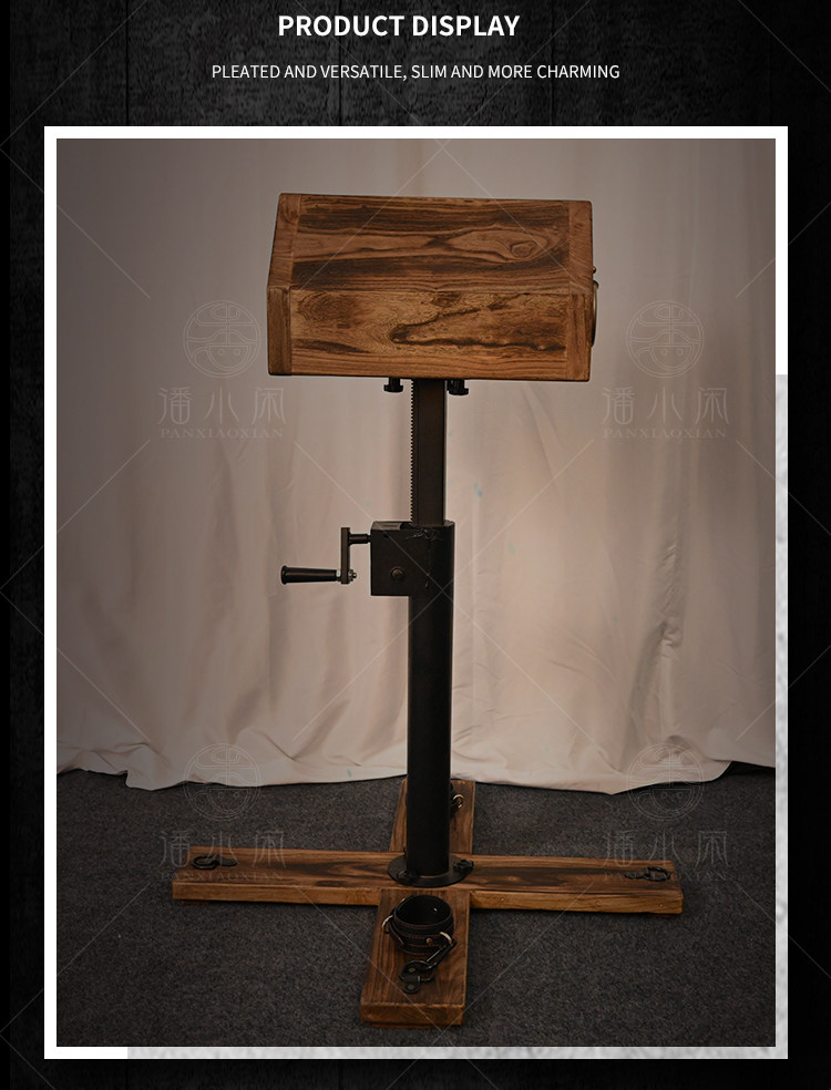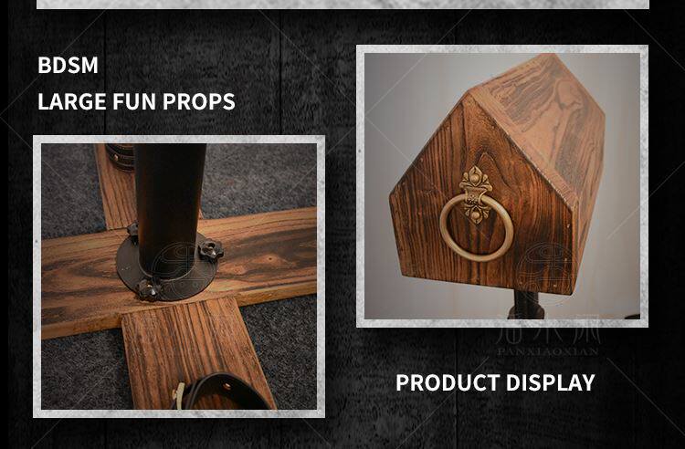 House-Shaped Wooden Horse Riding Frame Sm Training Device for Female Abuse, Adjustable Height, Cross-Shaped Wooden Base, Foot Cuffs for Restraint