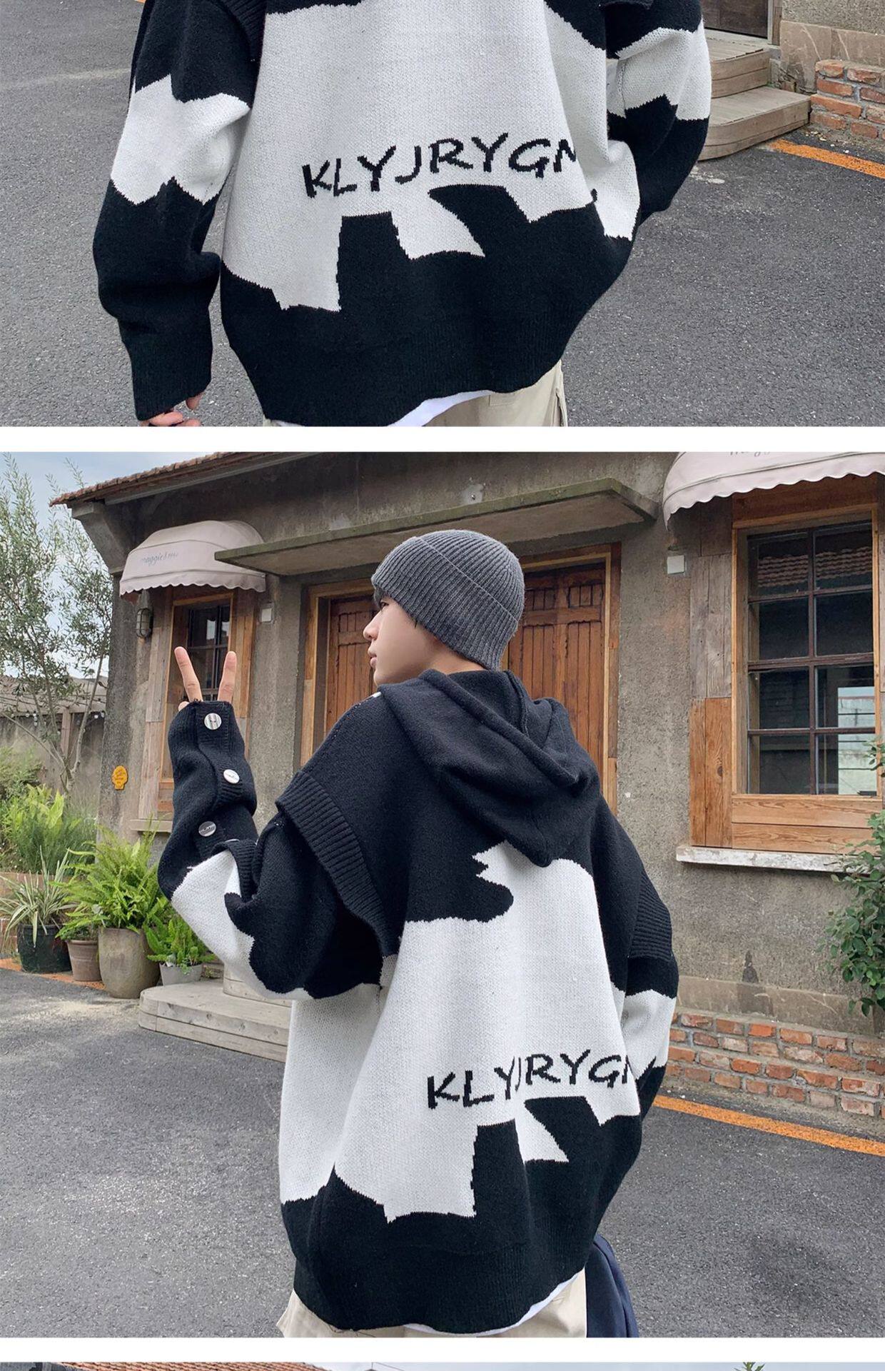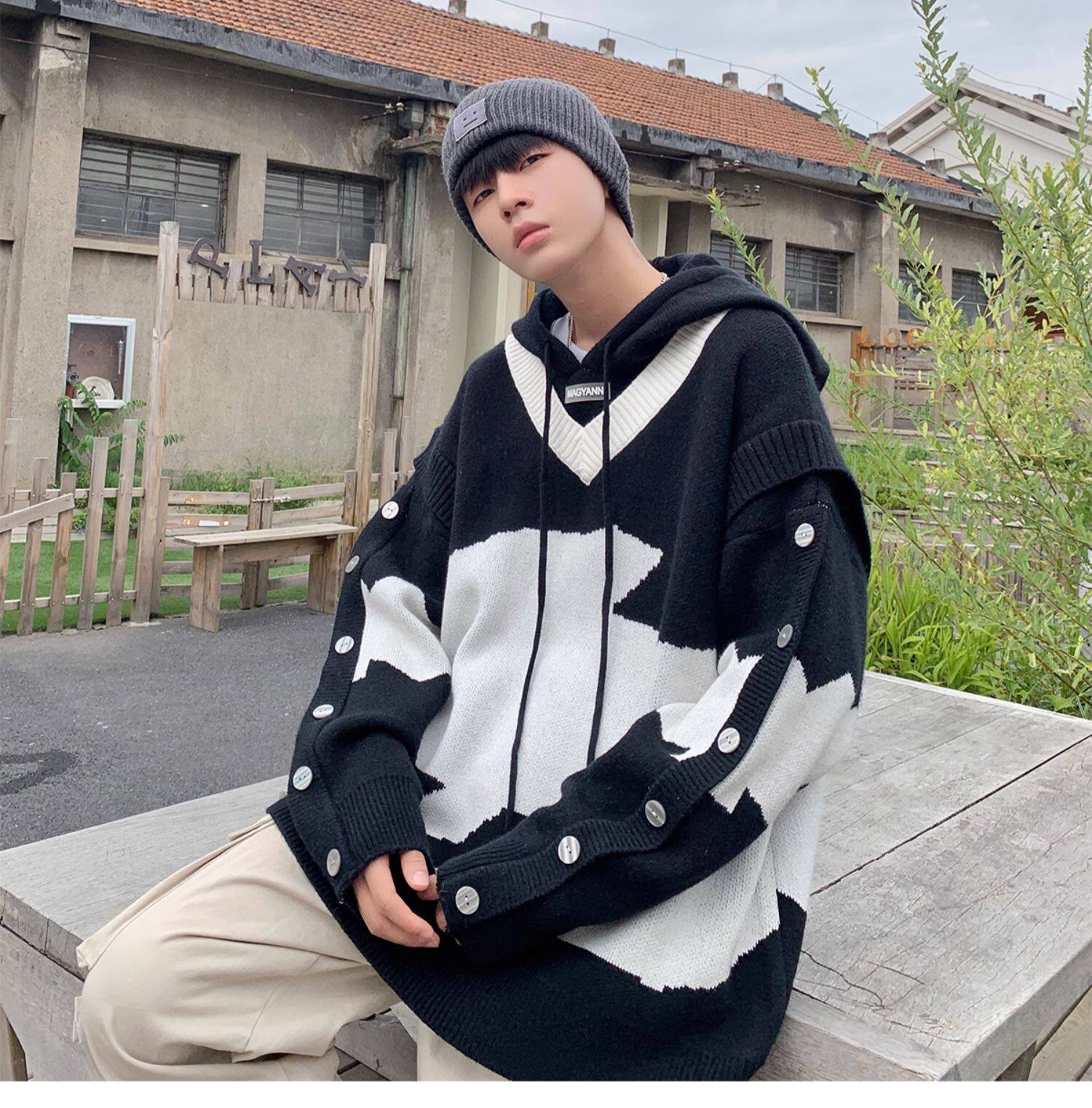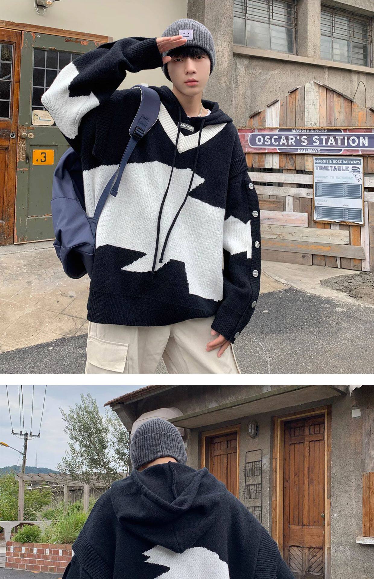 Hooded fake two-piece sweater men's contrasting color buttoned v-neck high-end autumn and winter sweater trend