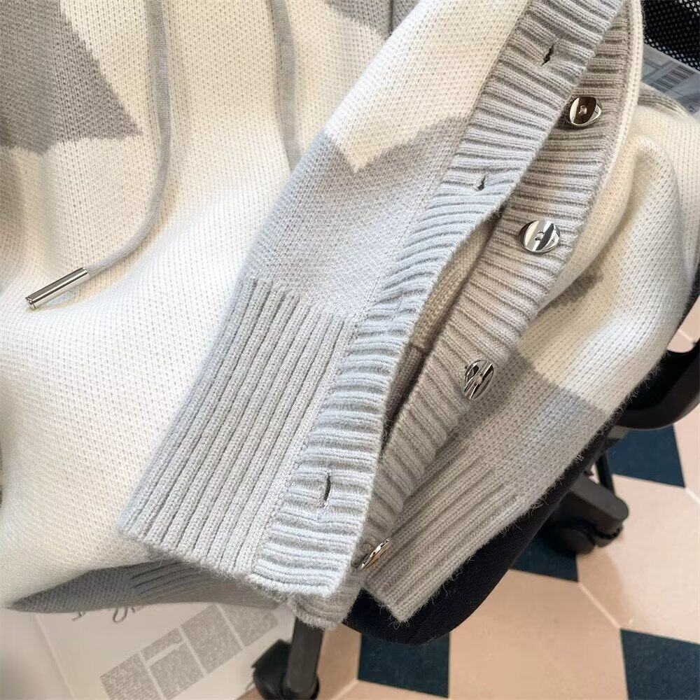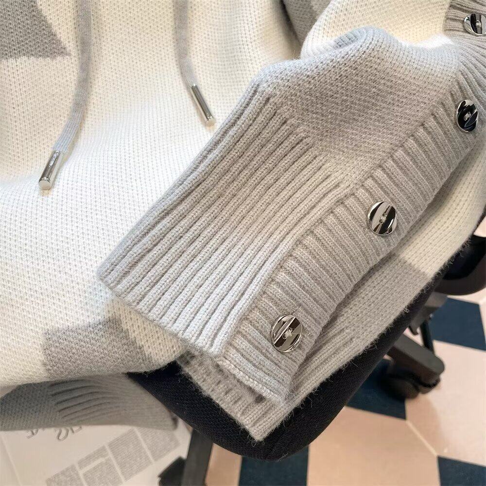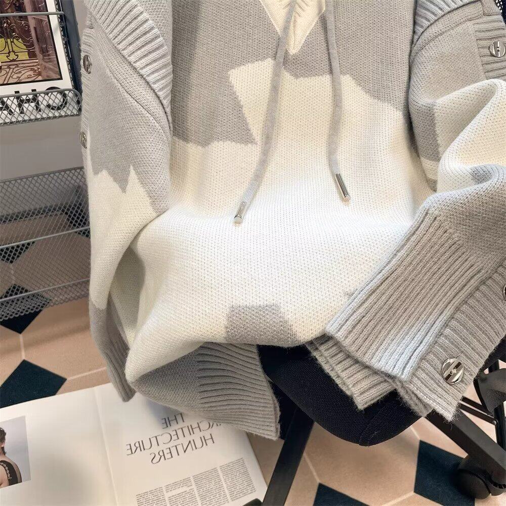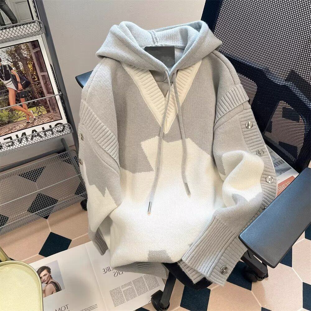 Hooded fake two-piece sweater men's contrasting color buttoned v-neck high-end autumn and winter sweater trend