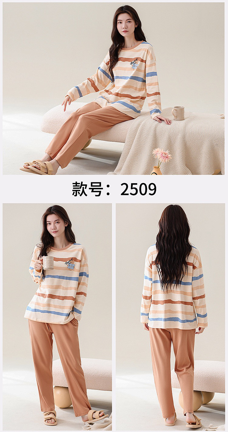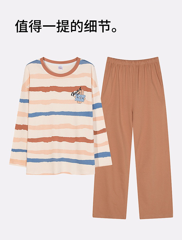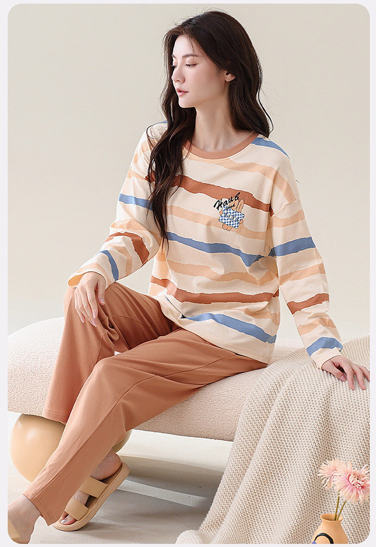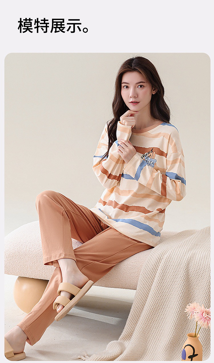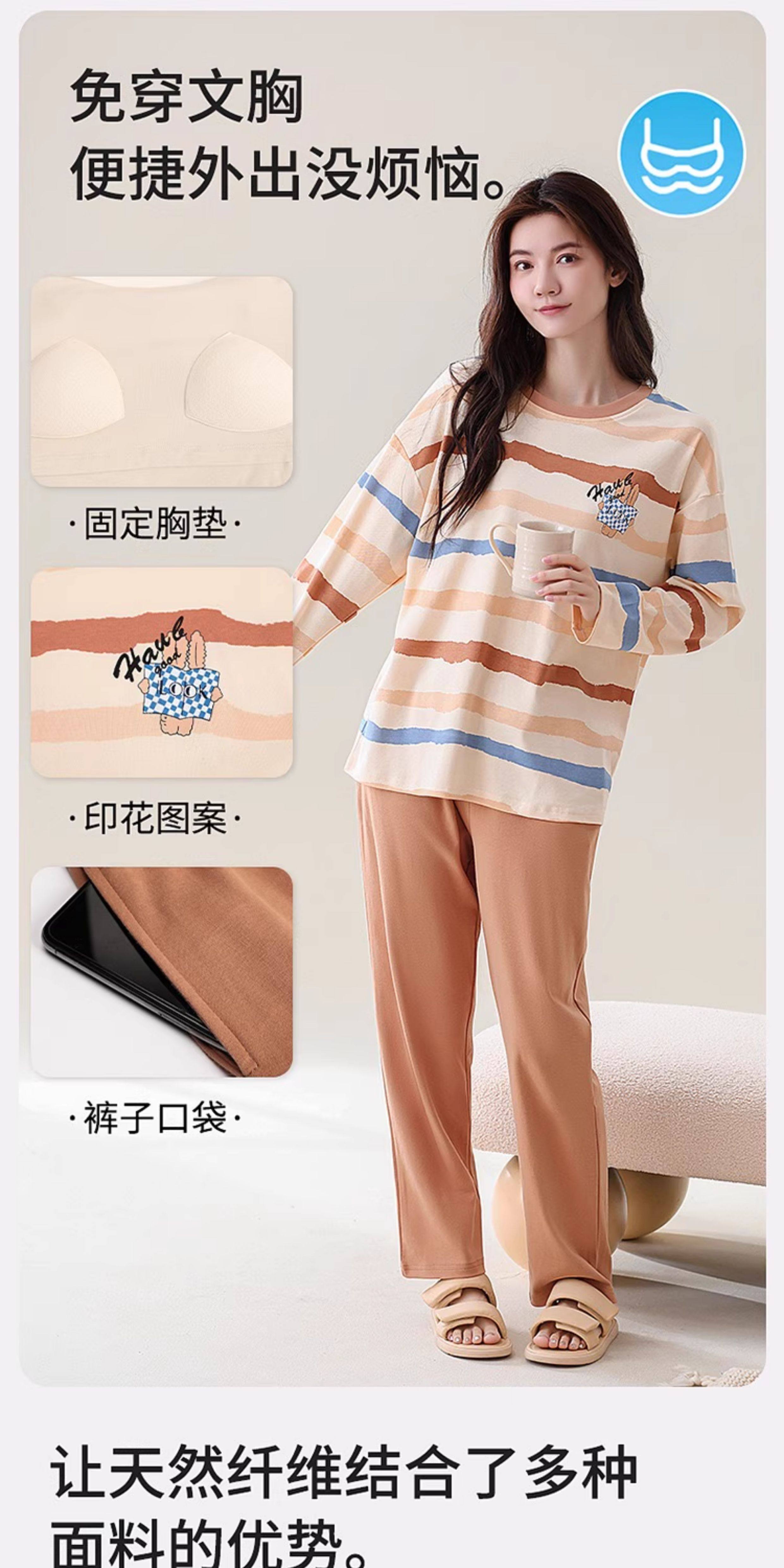 New Style 100% Pure Cotton Pajamas for Women with Chest Pads, Cute Spring and Autumn Long-Sleeved Cotton Round-Neck Home Wear Set That Can Be Worn Outside