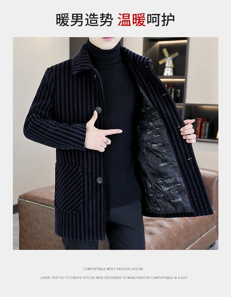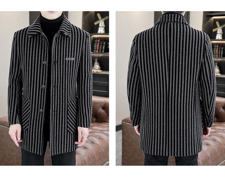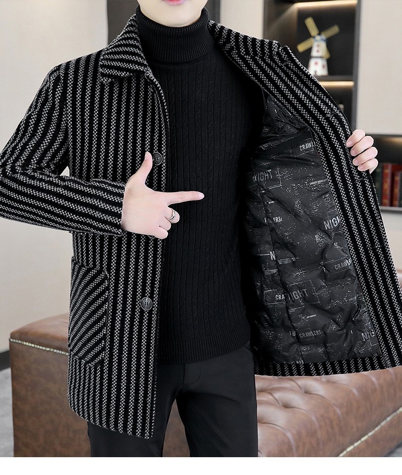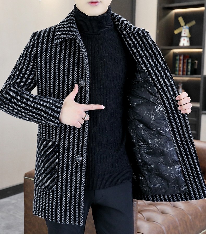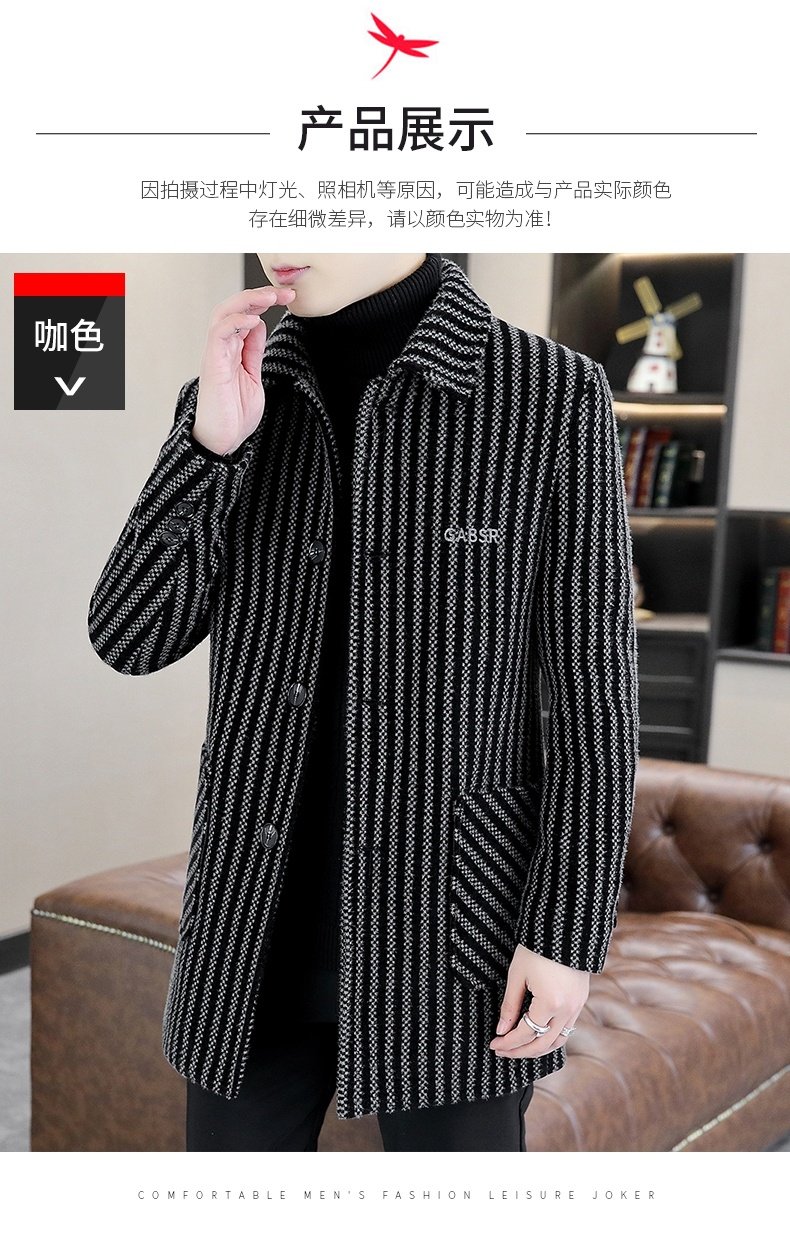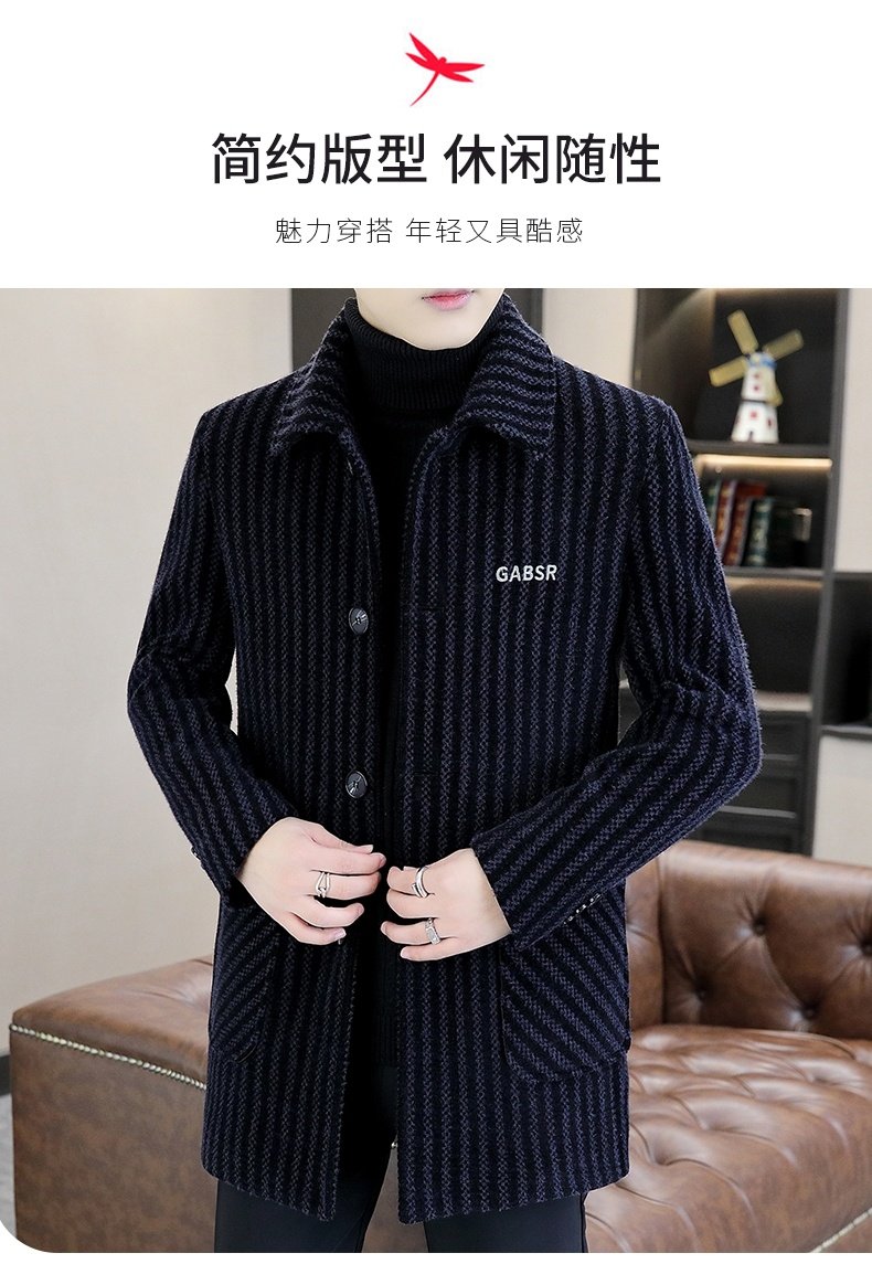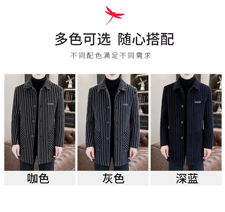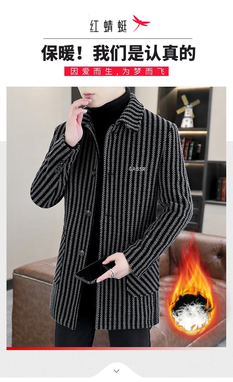 红蜻蜓中长款毛呢羽绒服男士冬季新款休闲条纹大衣加绒风衣外套男