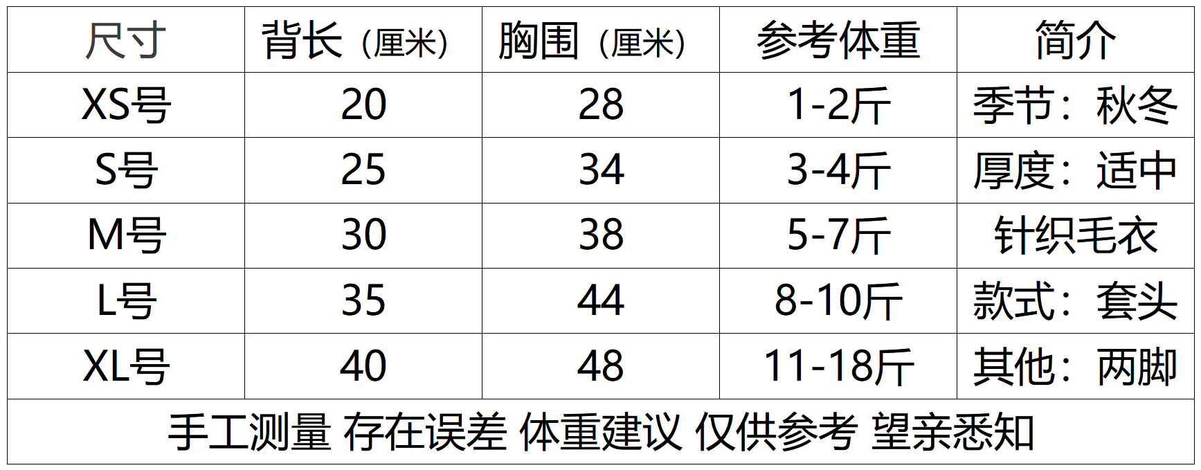Size XS Back Length 20cm (Recommended 0.5-1.0kg),S Back Length 25 (Recommended 1.5-2kg),Size m Back Length 30 (Recommended 2.5-3.5kg),Size L Back Length 35 (Recommended 4-5kg),XL Back Length 40 (Recommended 5.5-9kg)