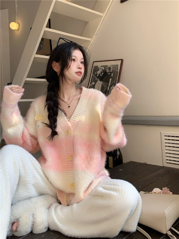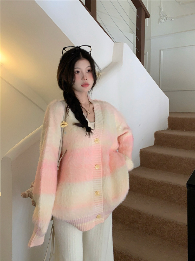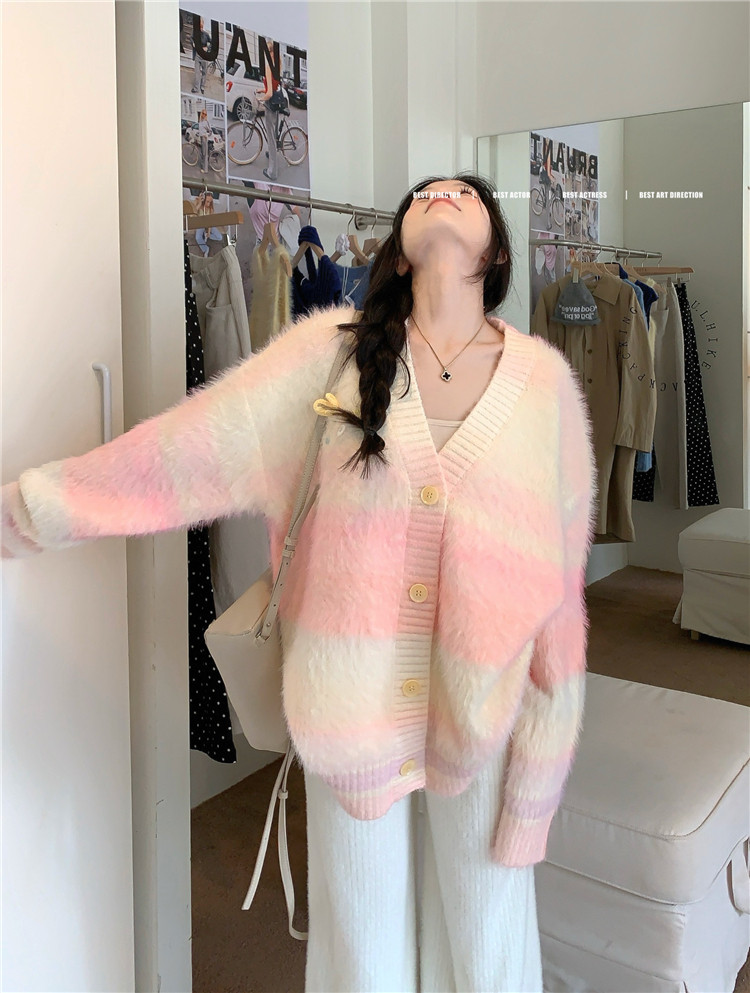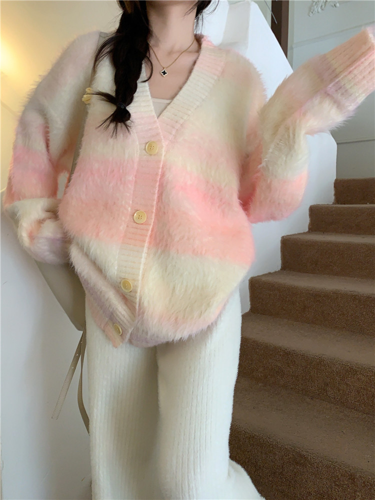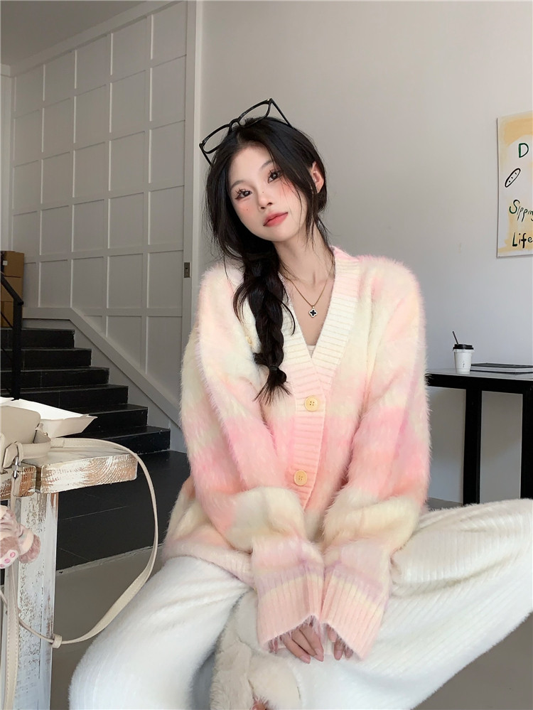 Gradient Pink V-Neck Sweater Cardigan for Women, Spring and Autumn Soft and Loose Lazy Style Mid-Length Knit Top