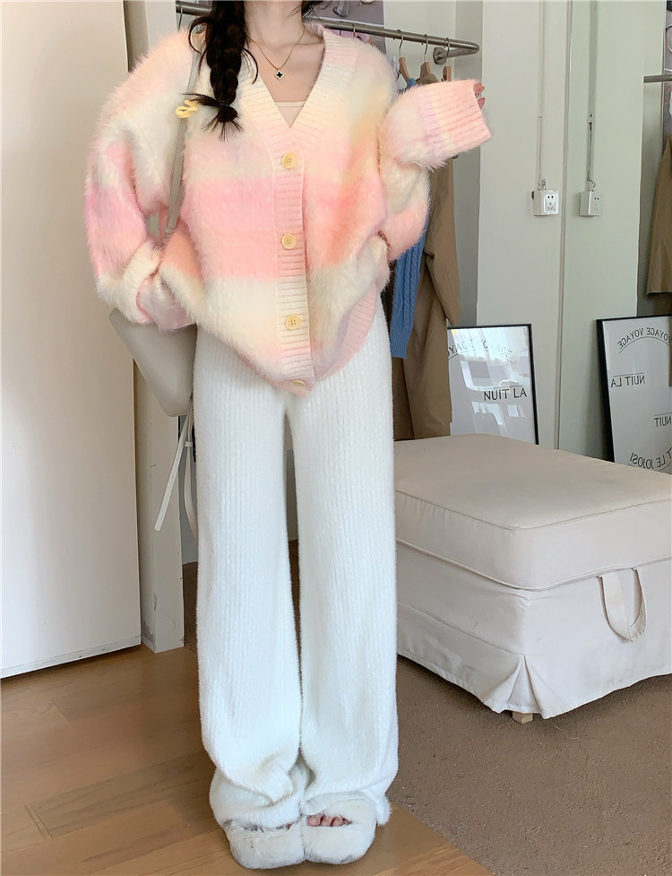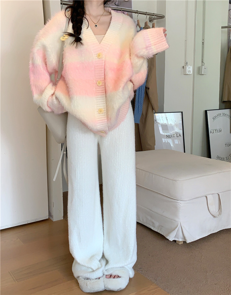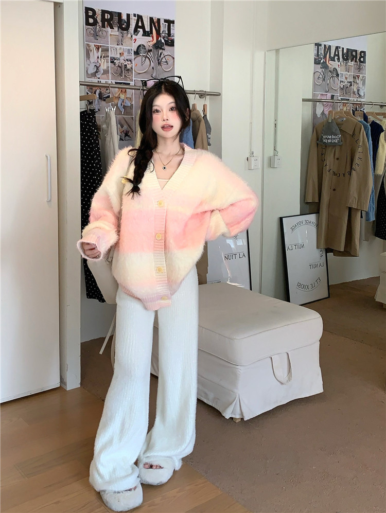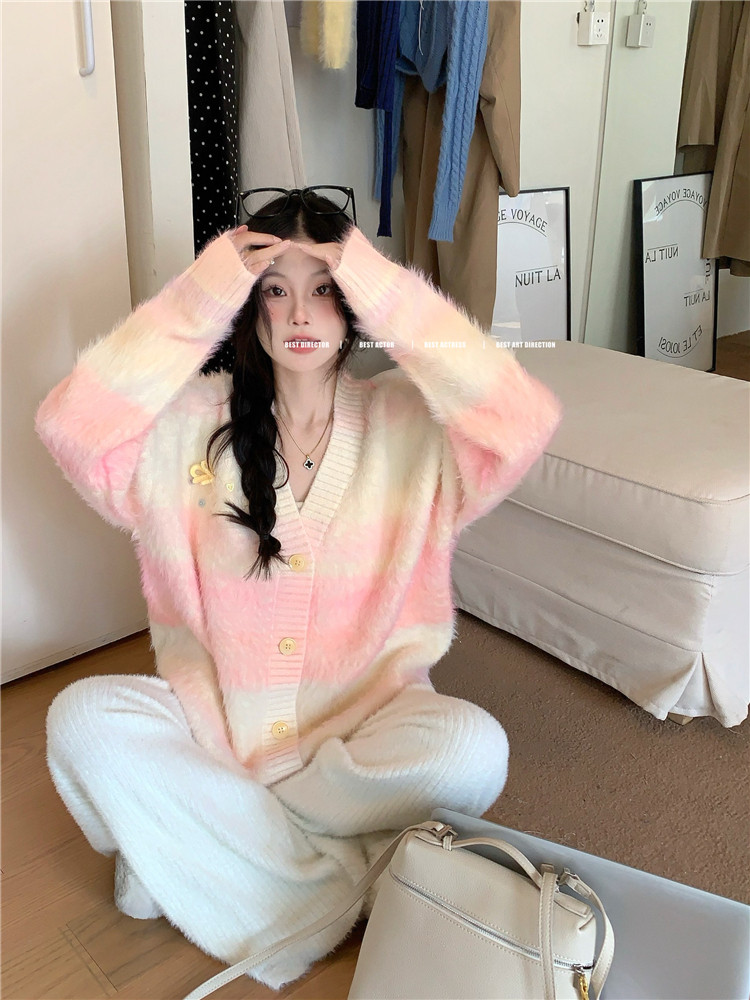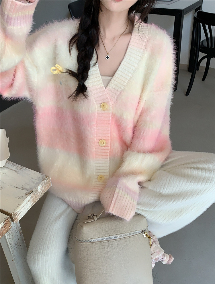 Gradient Pink V-Neck Sweater Cardigan for Women, Spring and Autumn Soft and Loose Lazy Style Mid-Length Knit Top