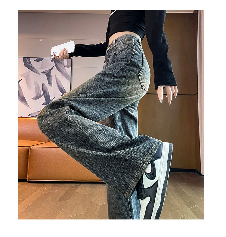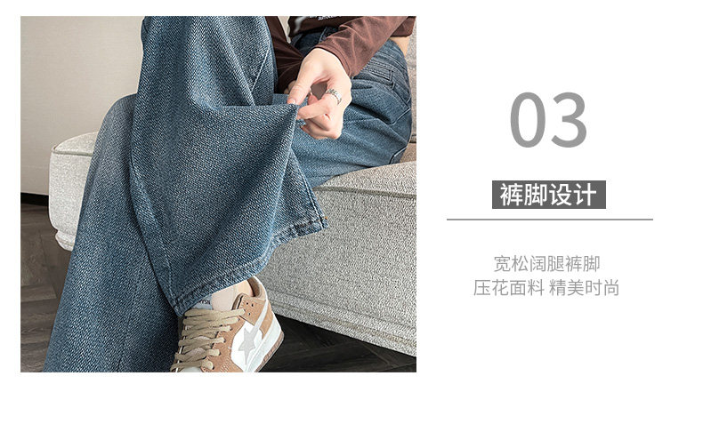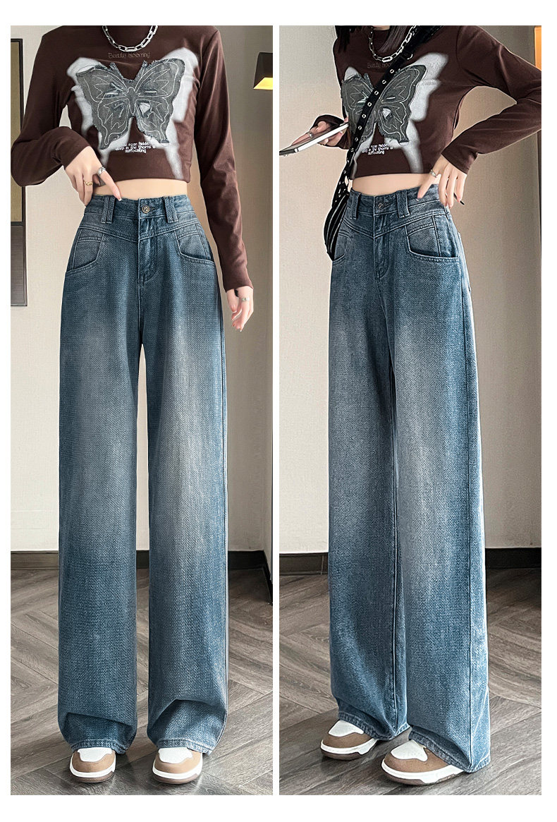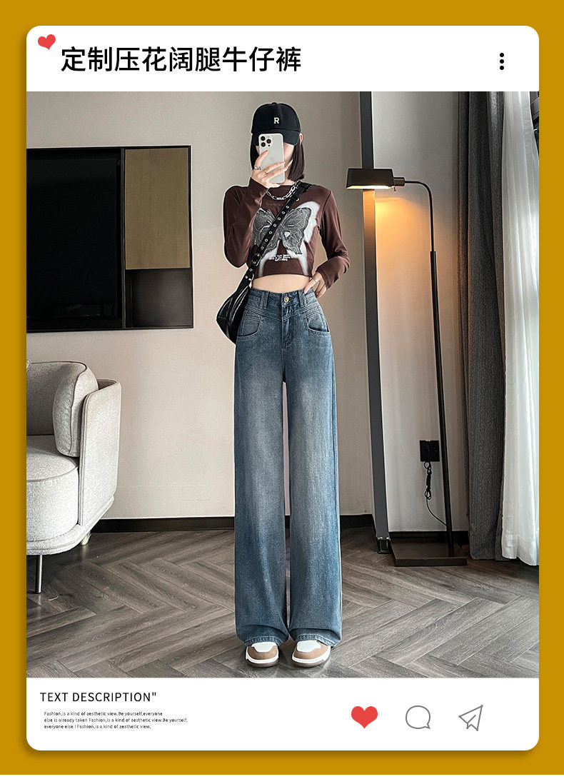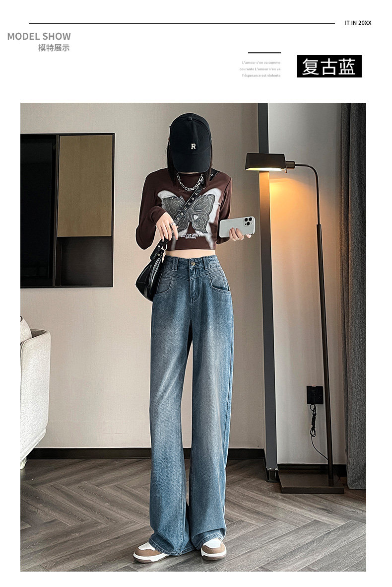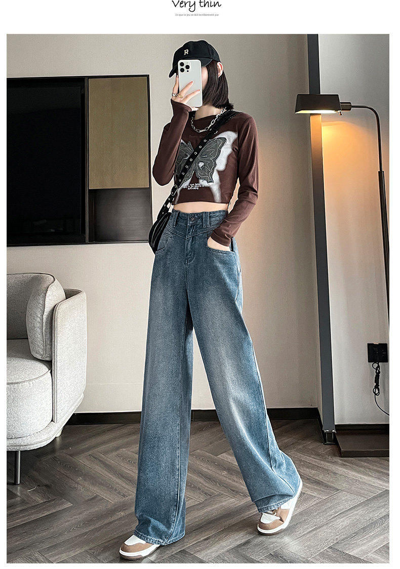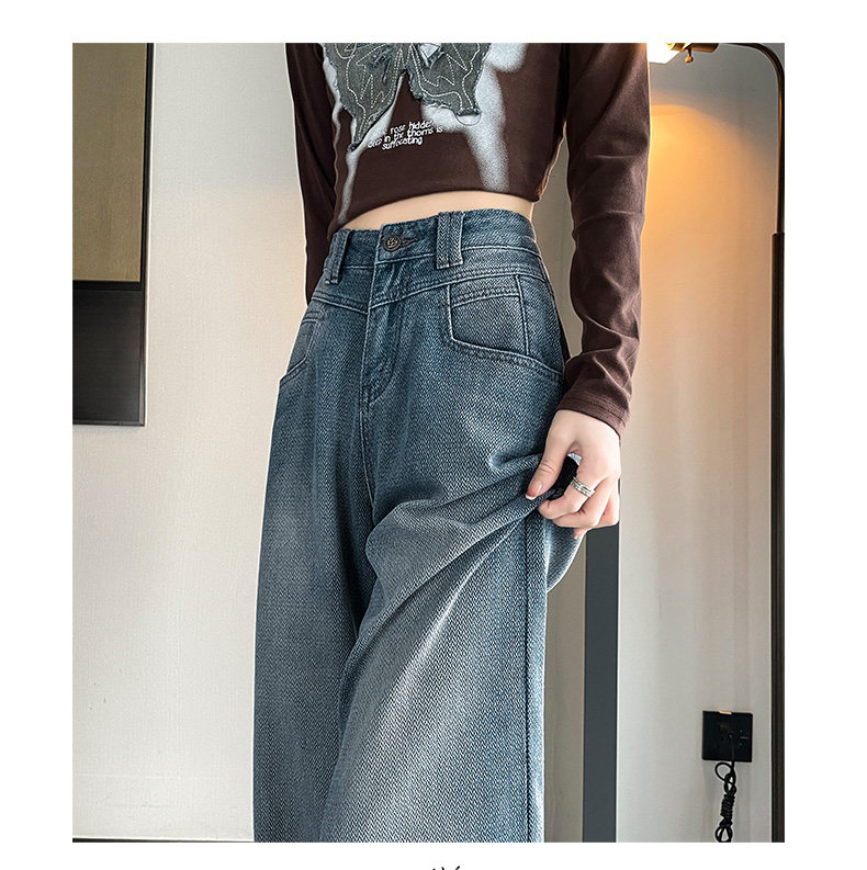 Retro blue wide-leg jeans for women, loose, straight, high-waisted, embossed, slim, smooth and drapey, casual narrow-fit floor-length trousers