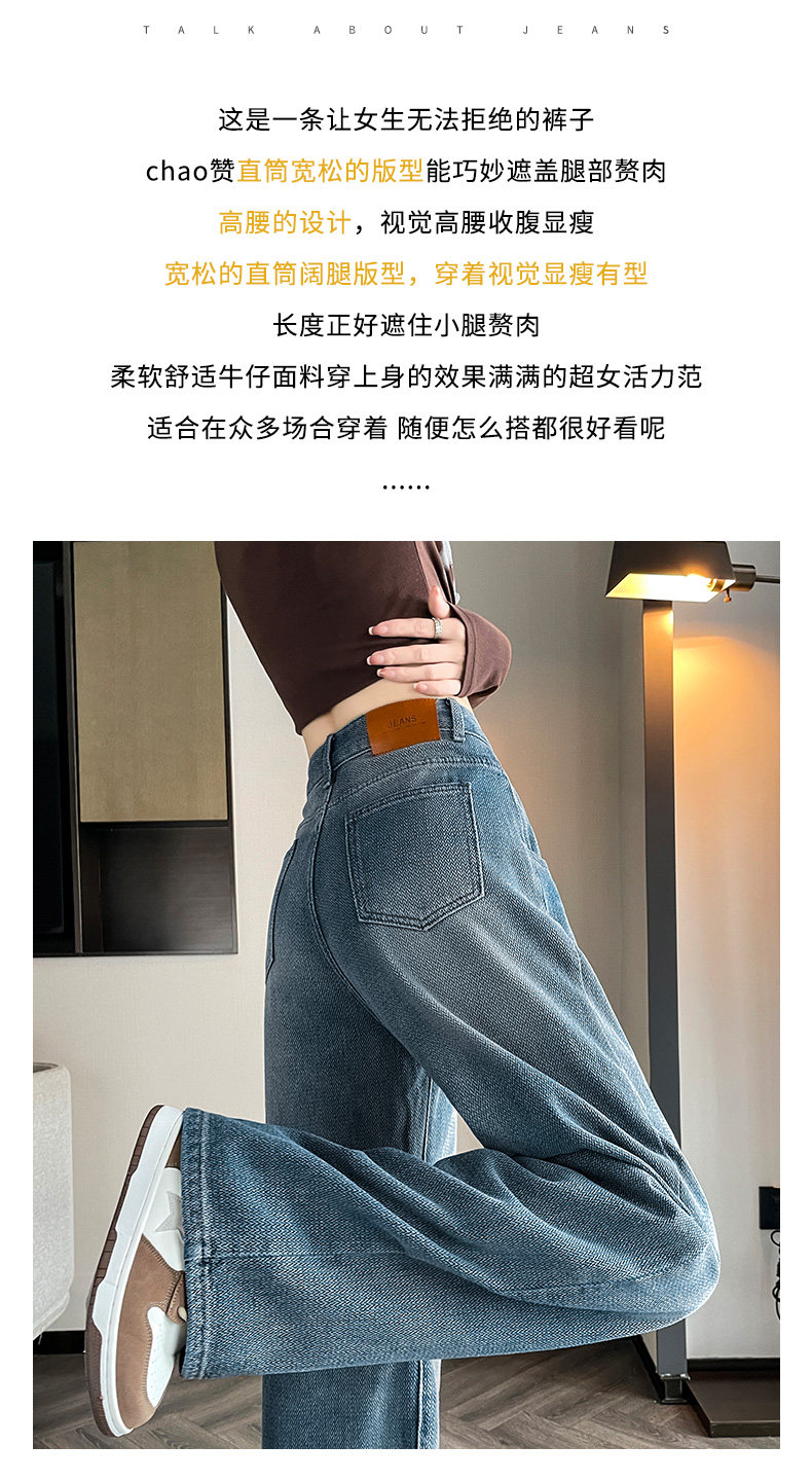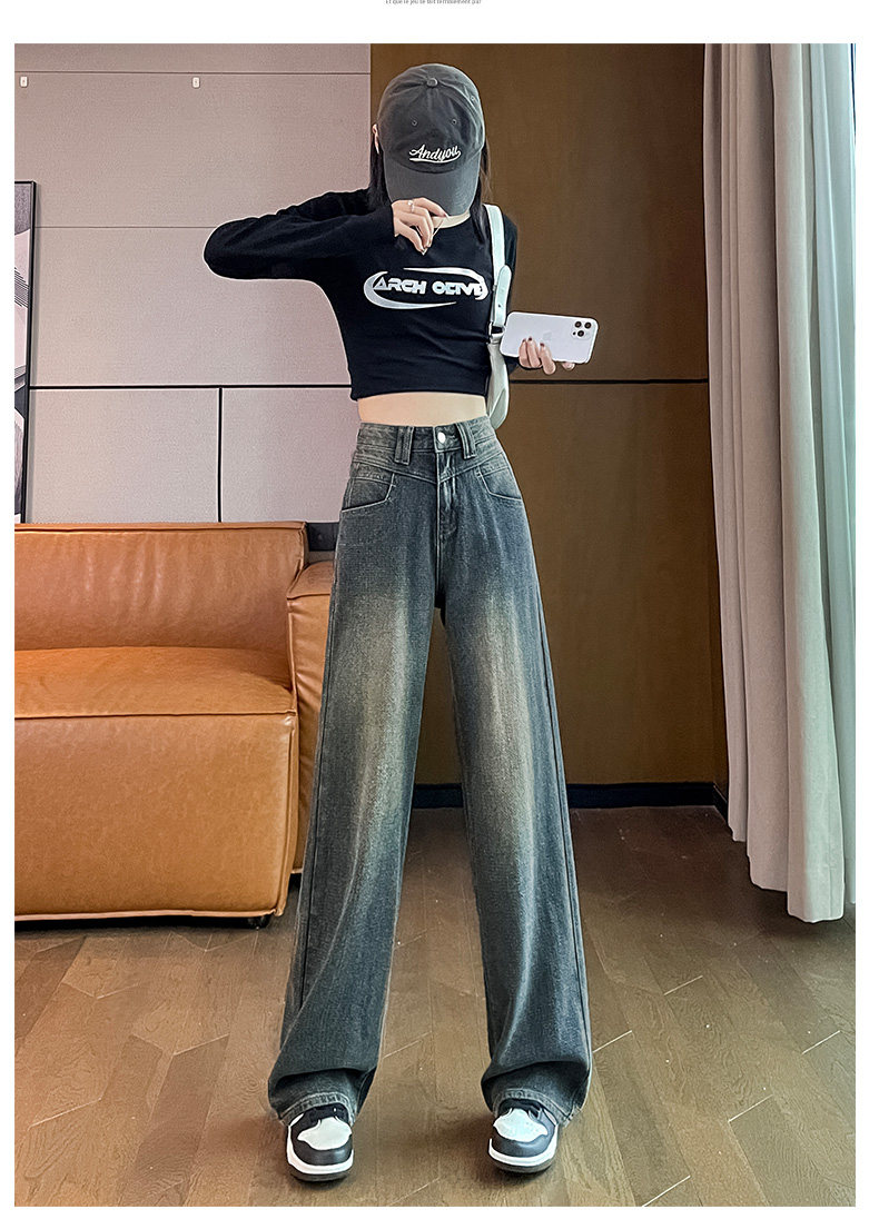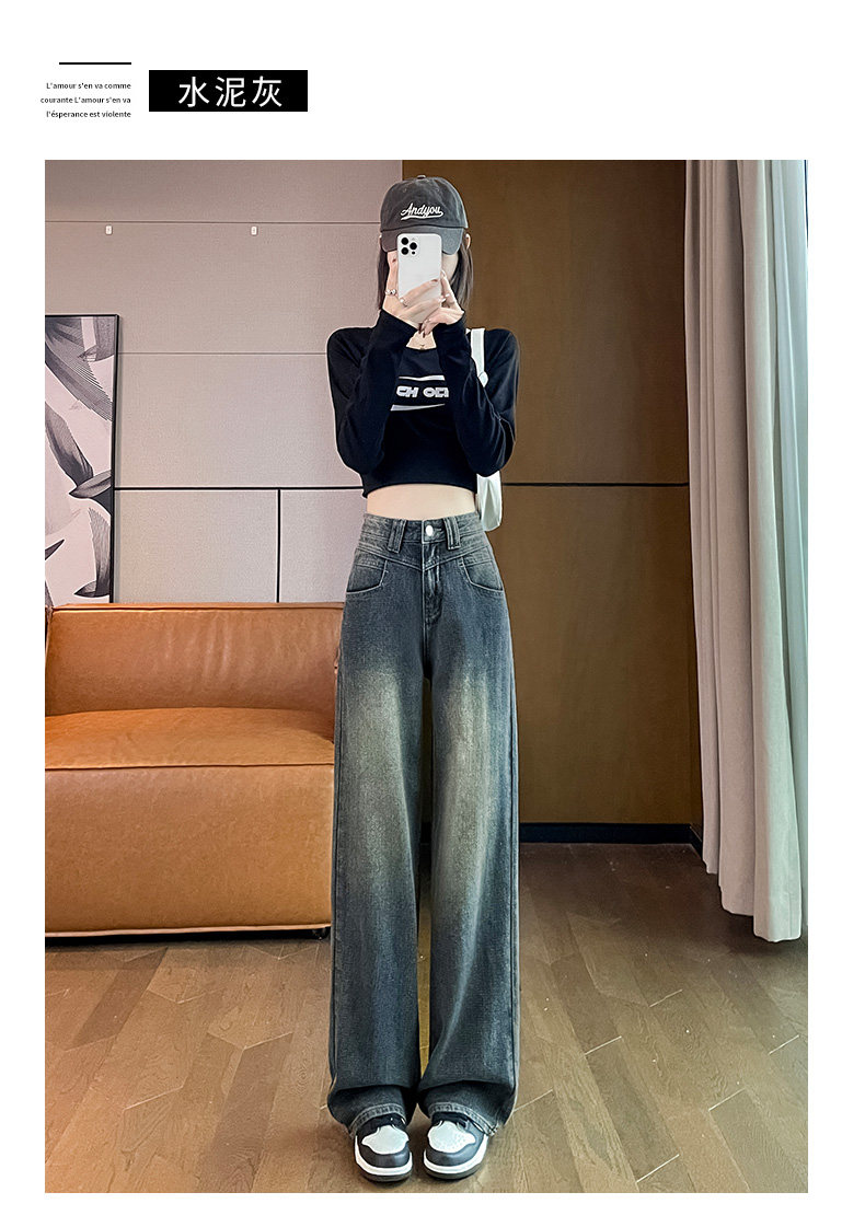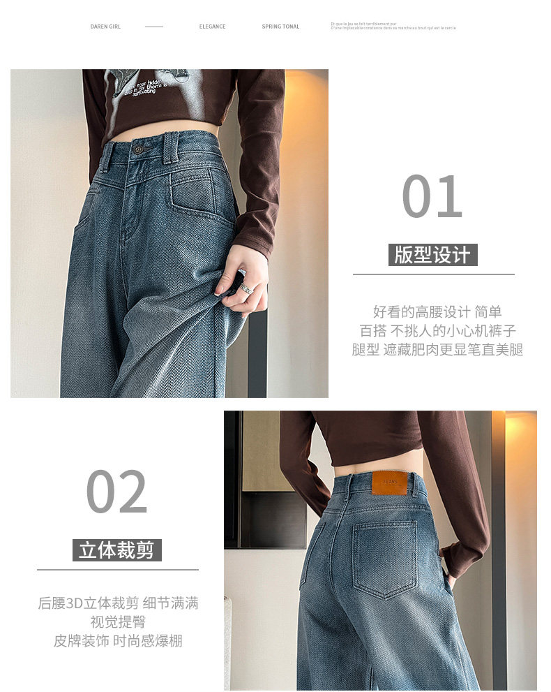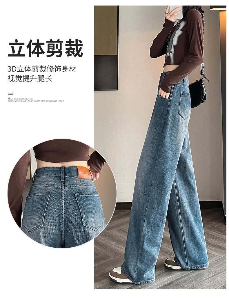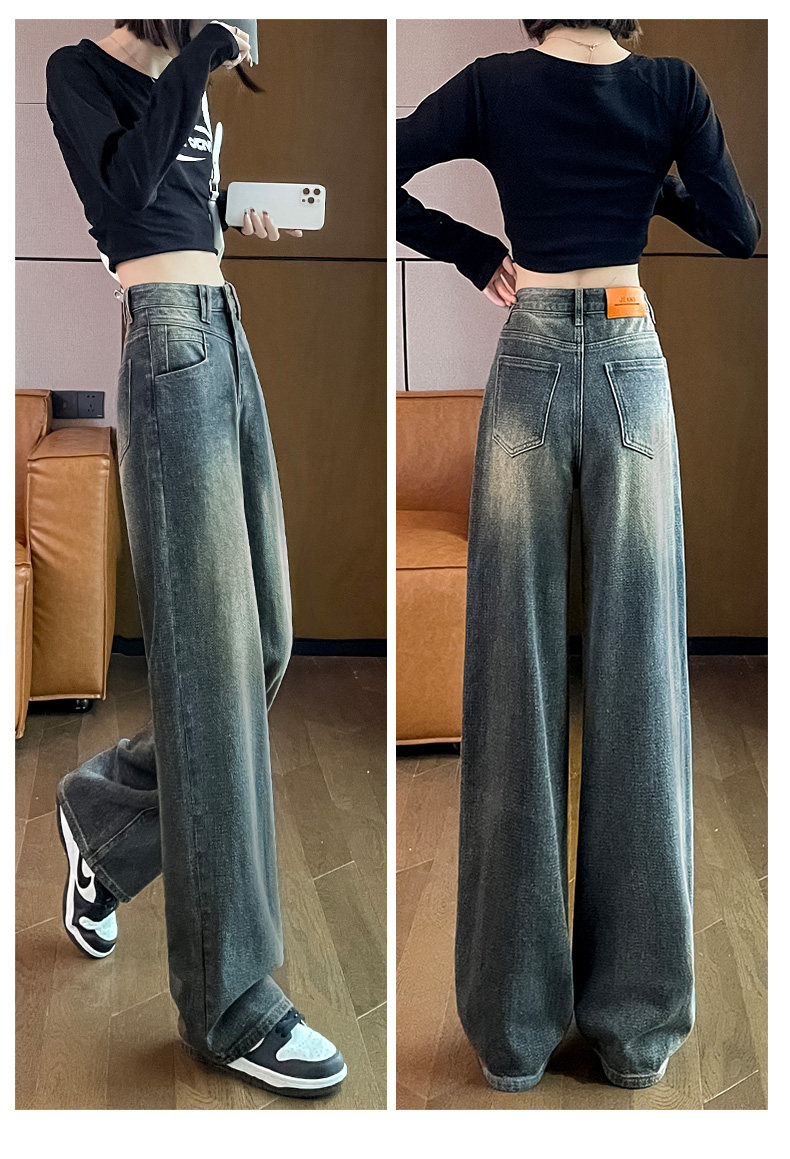 Retro blue wide-leg jeans for women, loose, straight, high-waisted, embossed, slim, smooth and drapey, casual narrow-fit floor-length trousers
