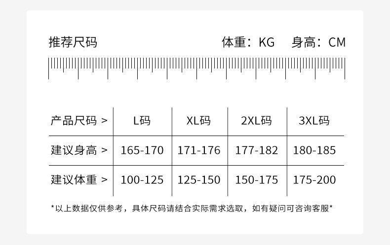 China (cm) 165 / 88-90 170 / 96-98 175 / 108-110 180 / 118-122 185 / 126-130