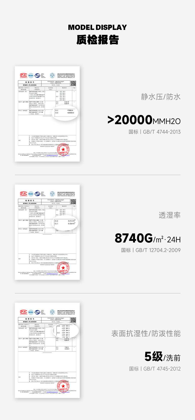 Waterproof Hydrostatic Pressure> 20000Mmh₂O,Surface Moisture Resistance: ≥4-5 Levels before Washing, ≥3-4 Levels after Washing