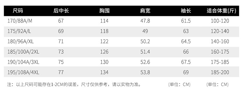 China (cm) 165 / 88-90 170 / 96-98 175 / 108-110 180 / 118-122 185 / 126-130
