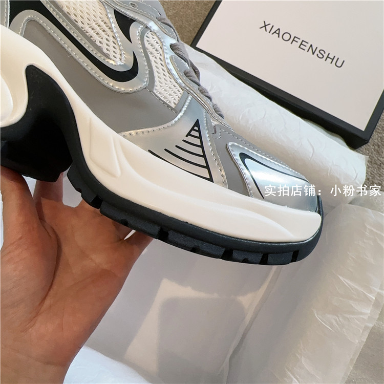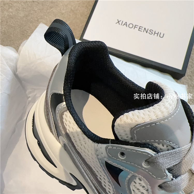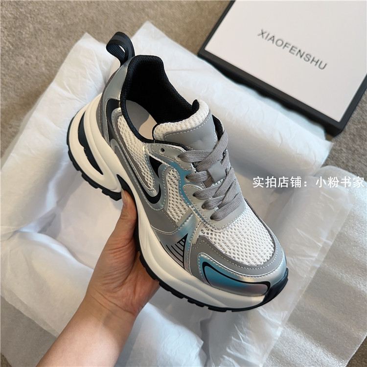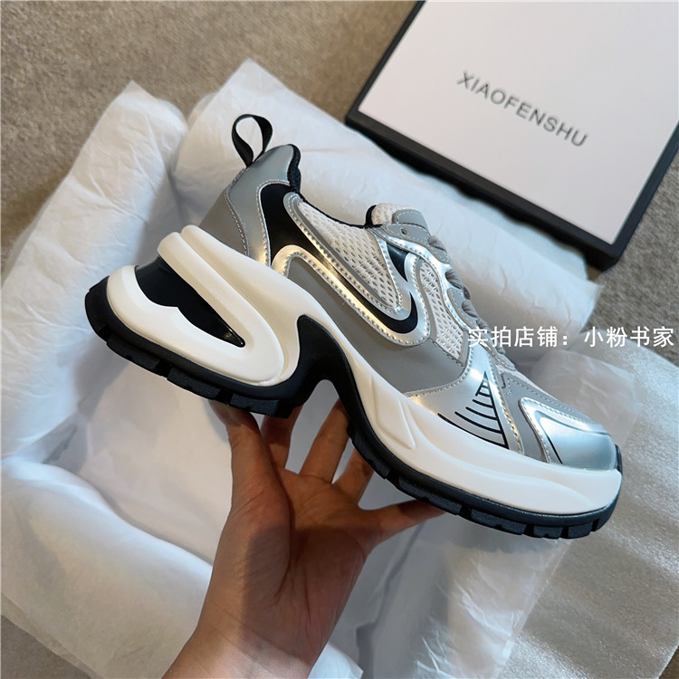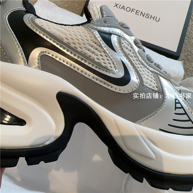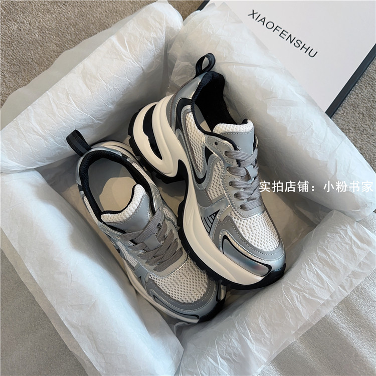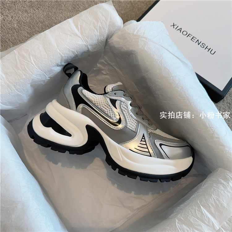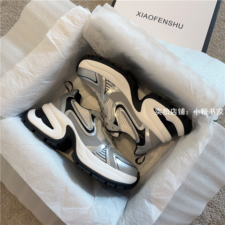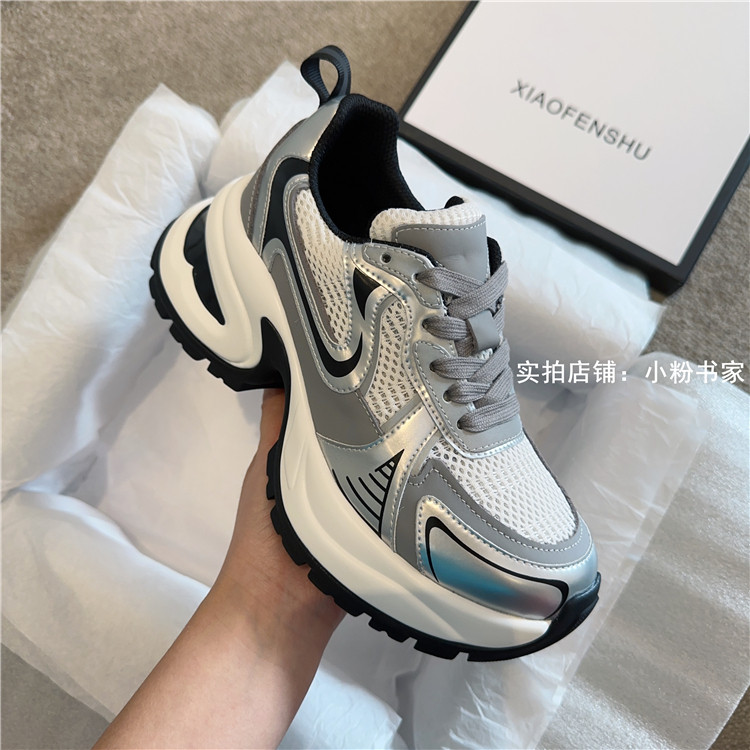 Zhao Lusi's same arch-soled dad shoes for women, thick-soled heightening casual shoes, genuine leather, silver mesh, high-heeled sneakers