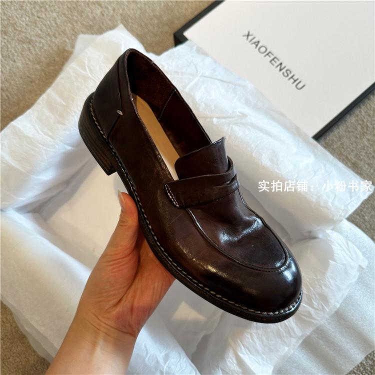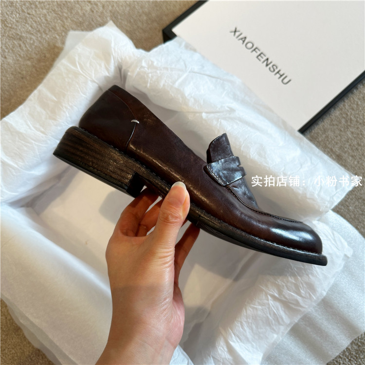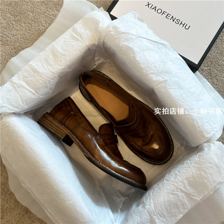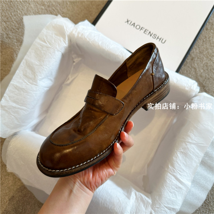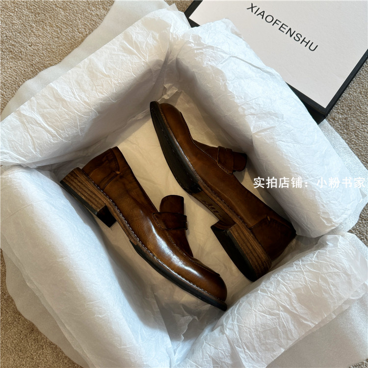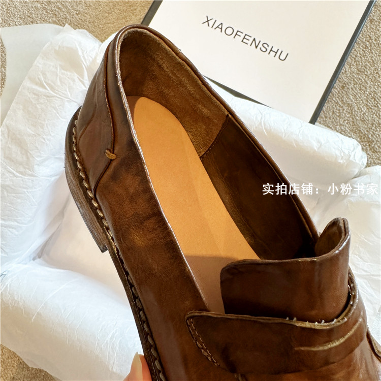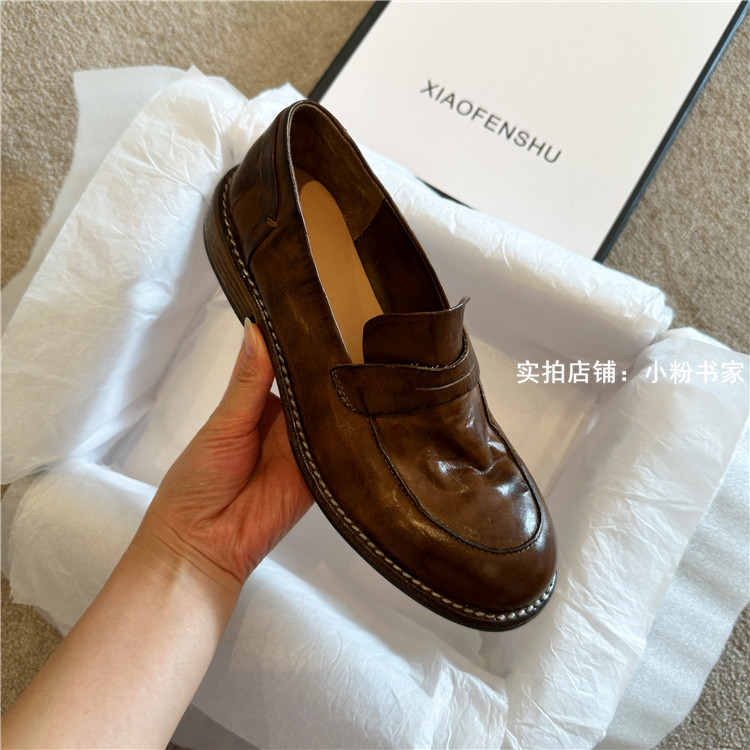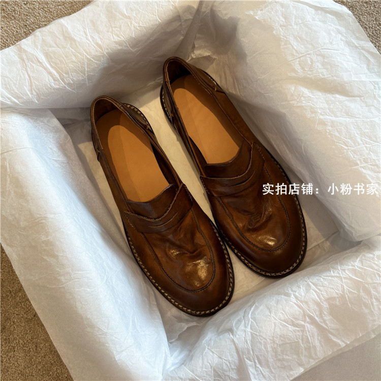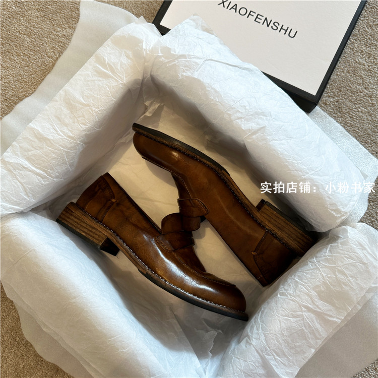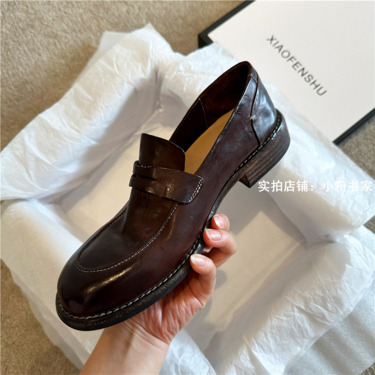 Handmade shoes horsehide washed retro distressed loafers for women autumn and winter new British style small leather shoes soft leather shoes