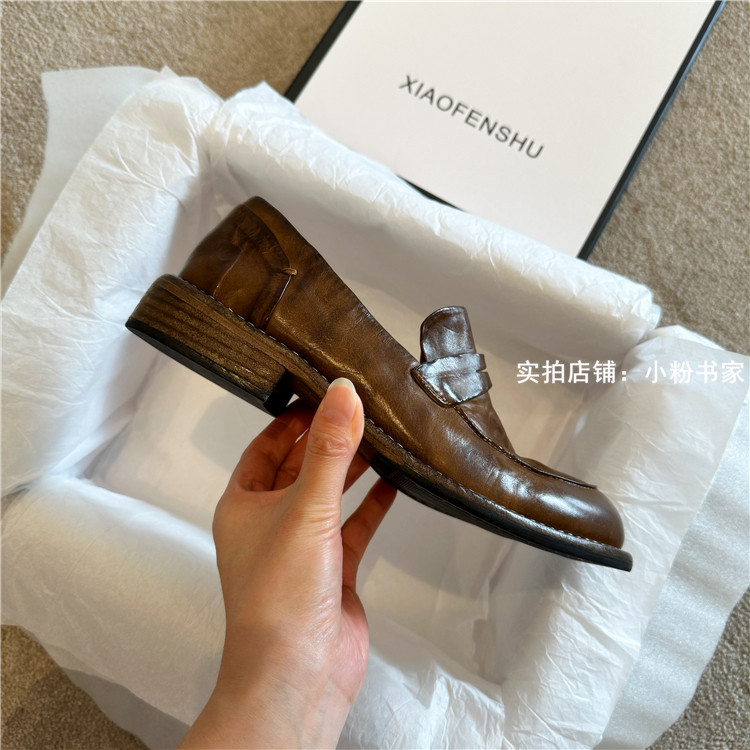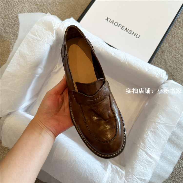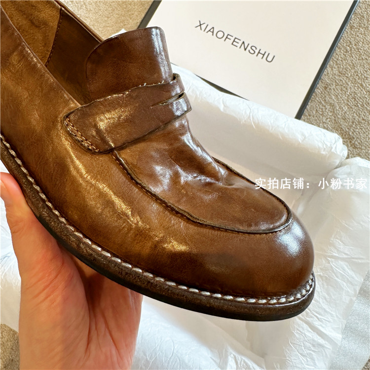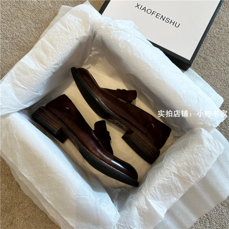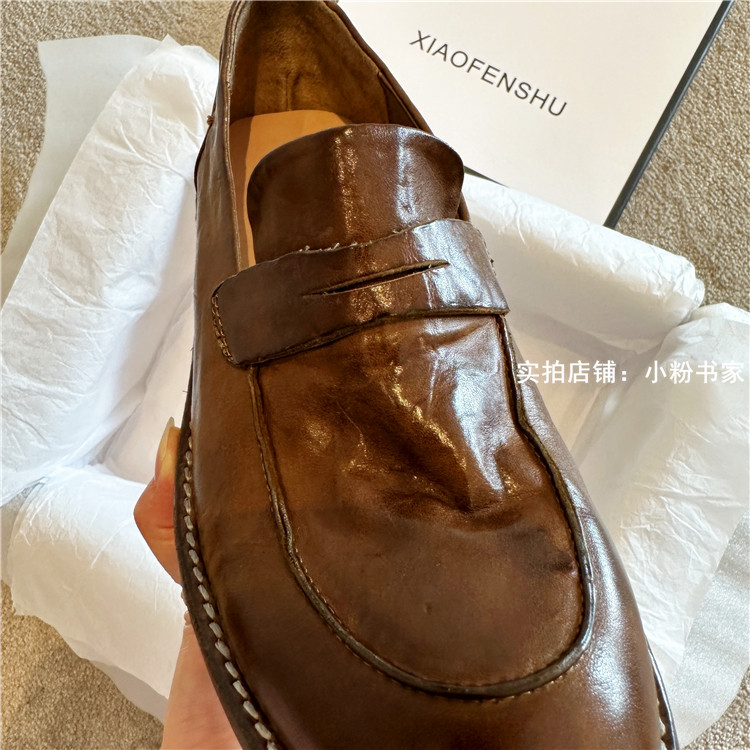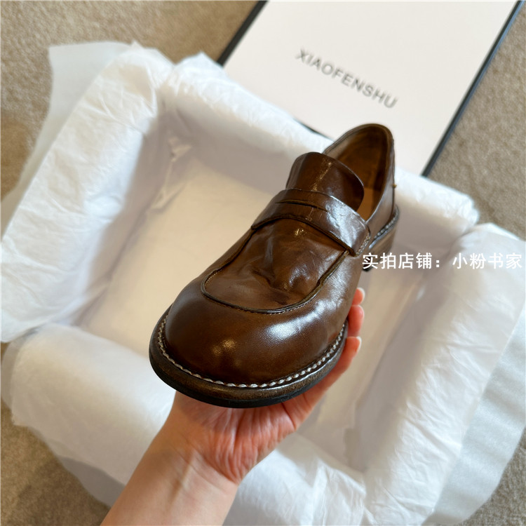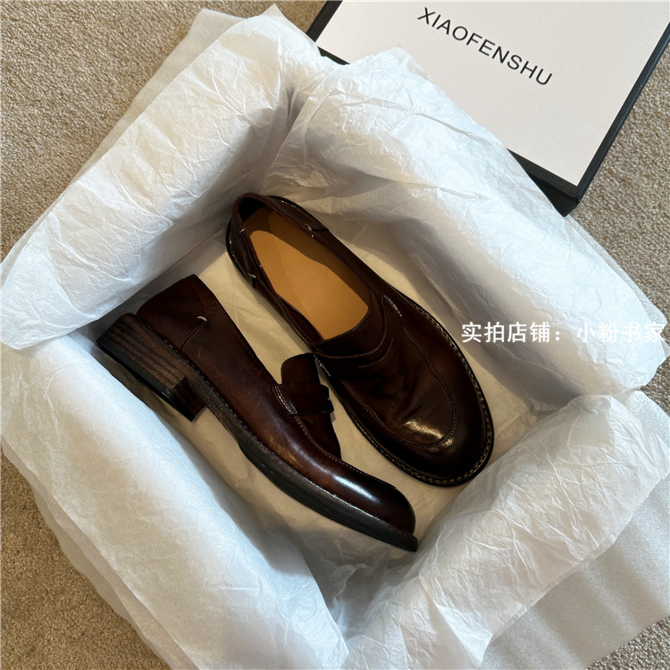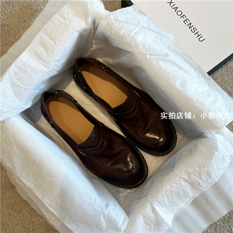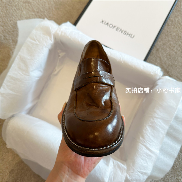 Handmade shoes horsehide washed retro distressed loafers for women autumn and winter new British style small leather shoes soft leather shoes
