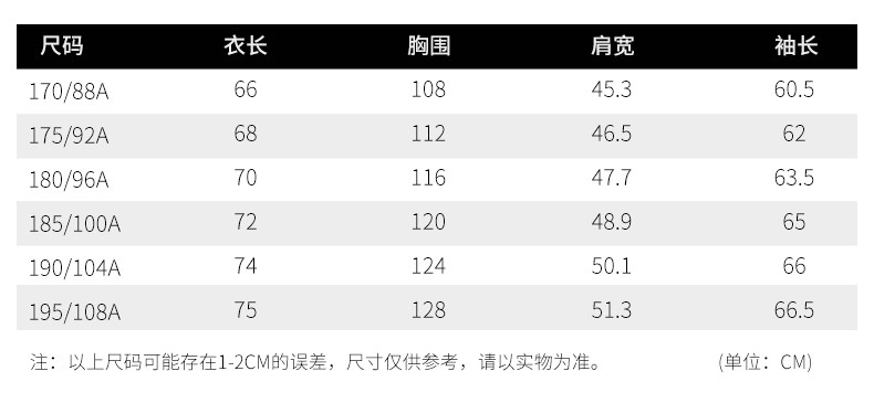 China (cm) 165 / 88-90 170 / 96-98 175 / 108-110 180 / 118-122 185 / 126-130