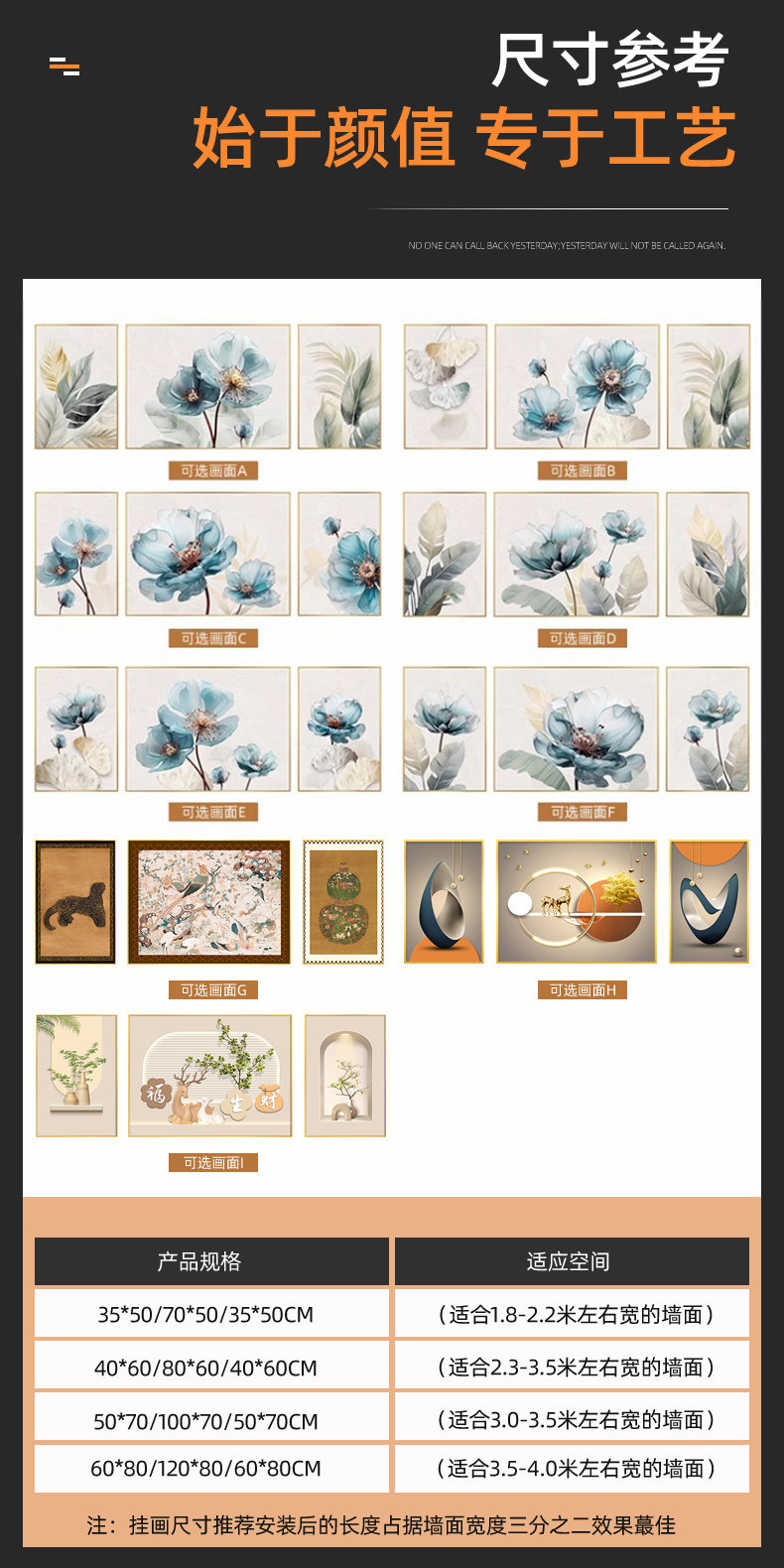 Size 30*40/60*40/30*40 (suitable for walls around 1.5-2 meters),35*50/70*50/35*50 (recommended for sofas of about 2 meters),40*60/80*60/40*60 (recommended for sofas of about 2.5 meters),50*70/100*70/50*70 (recommended for sofas of about 3 meters),60*80/120*80/60*80 (recommended for sofas of about 3.5 meters)