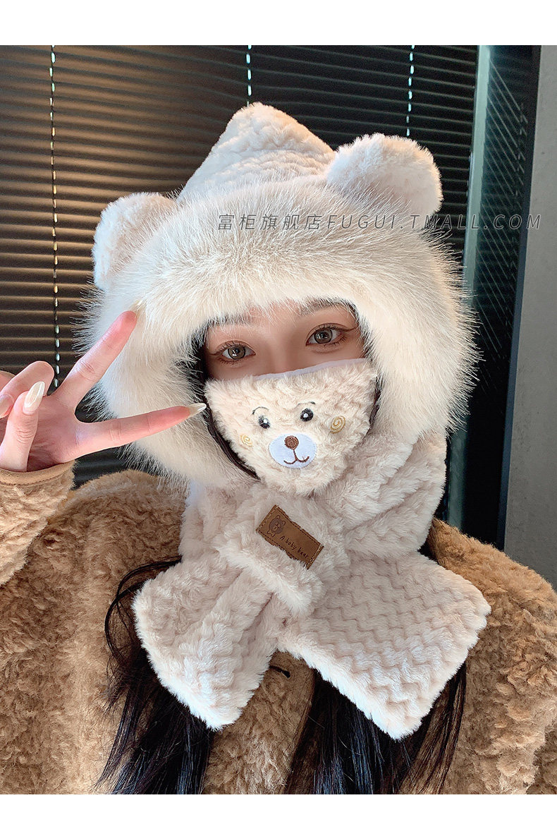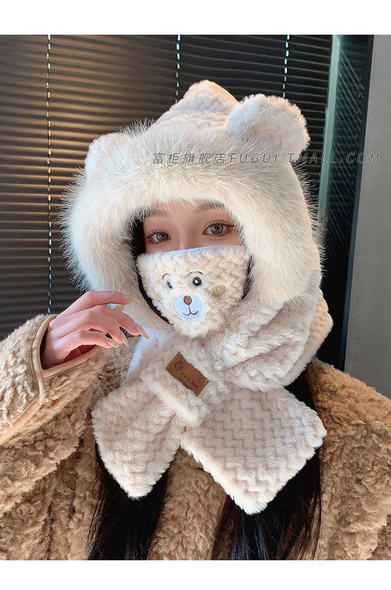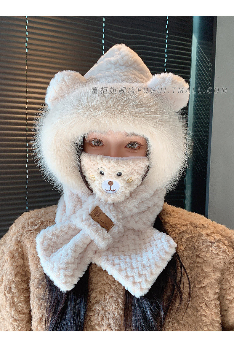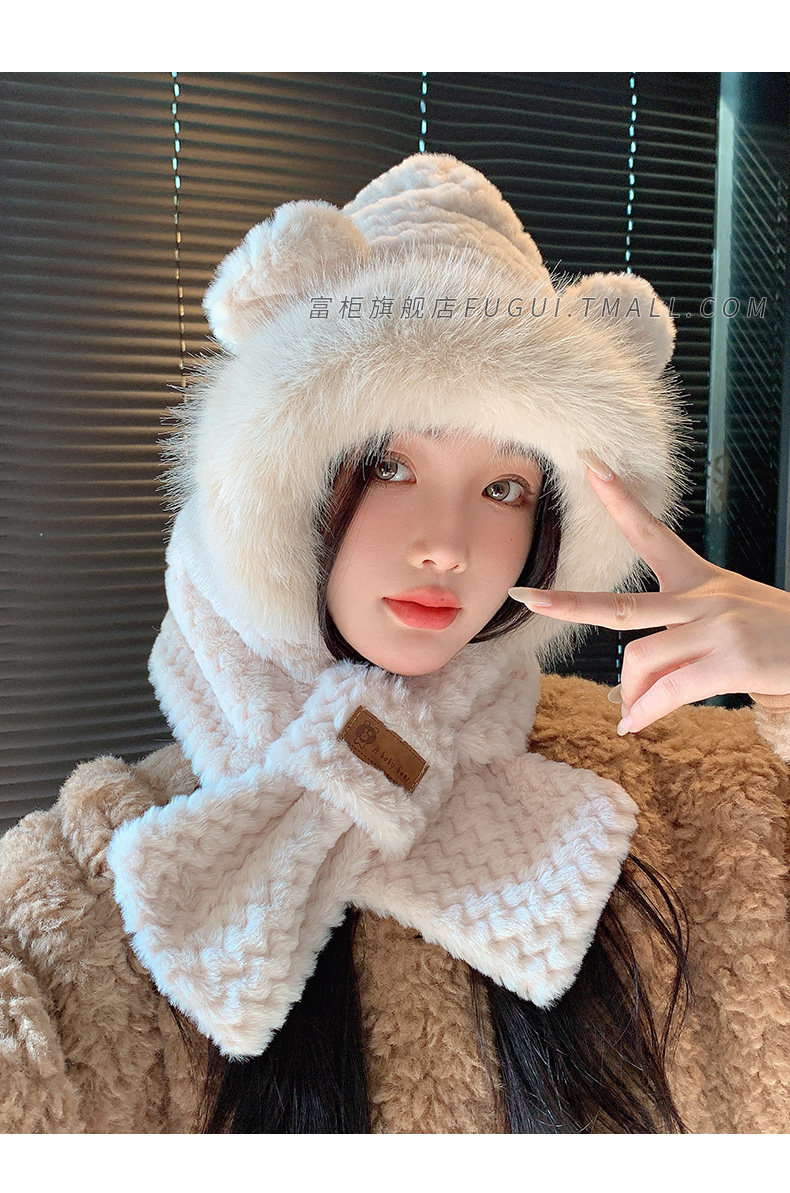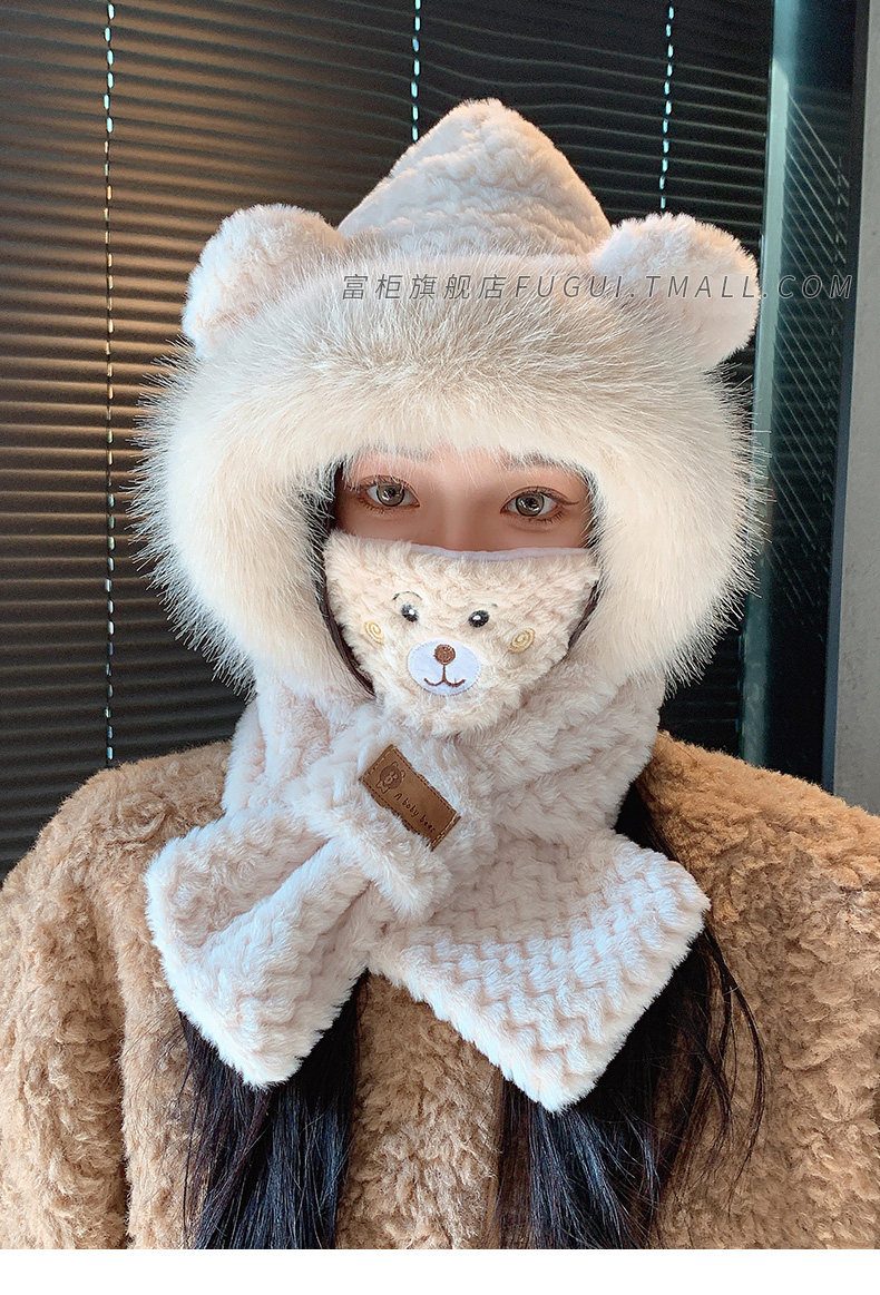 Fugui 2025 New Cute Plush Bear Hat for Women, Winter Scarf Integrated Thickened Warm Neck Warmer Two-Piece Set