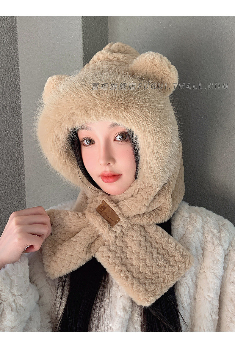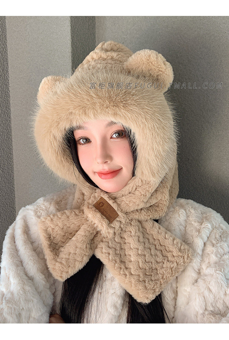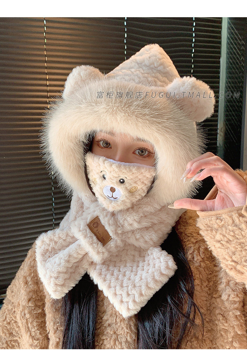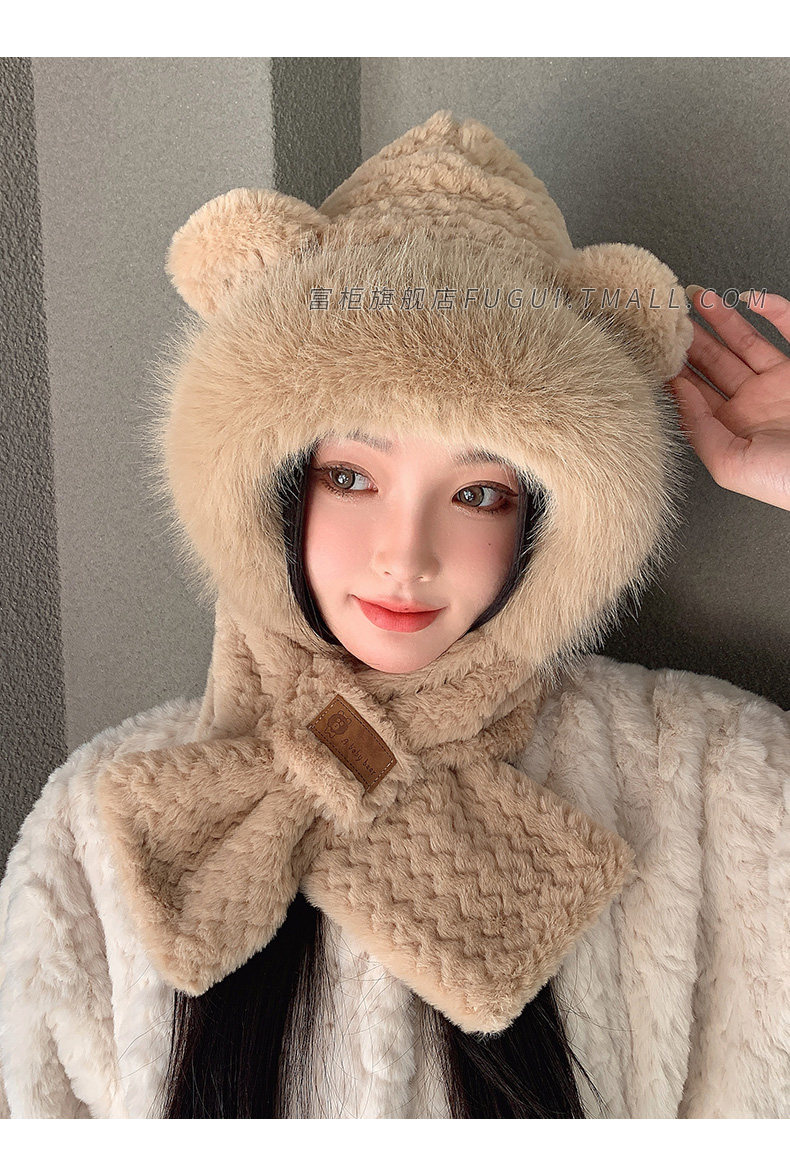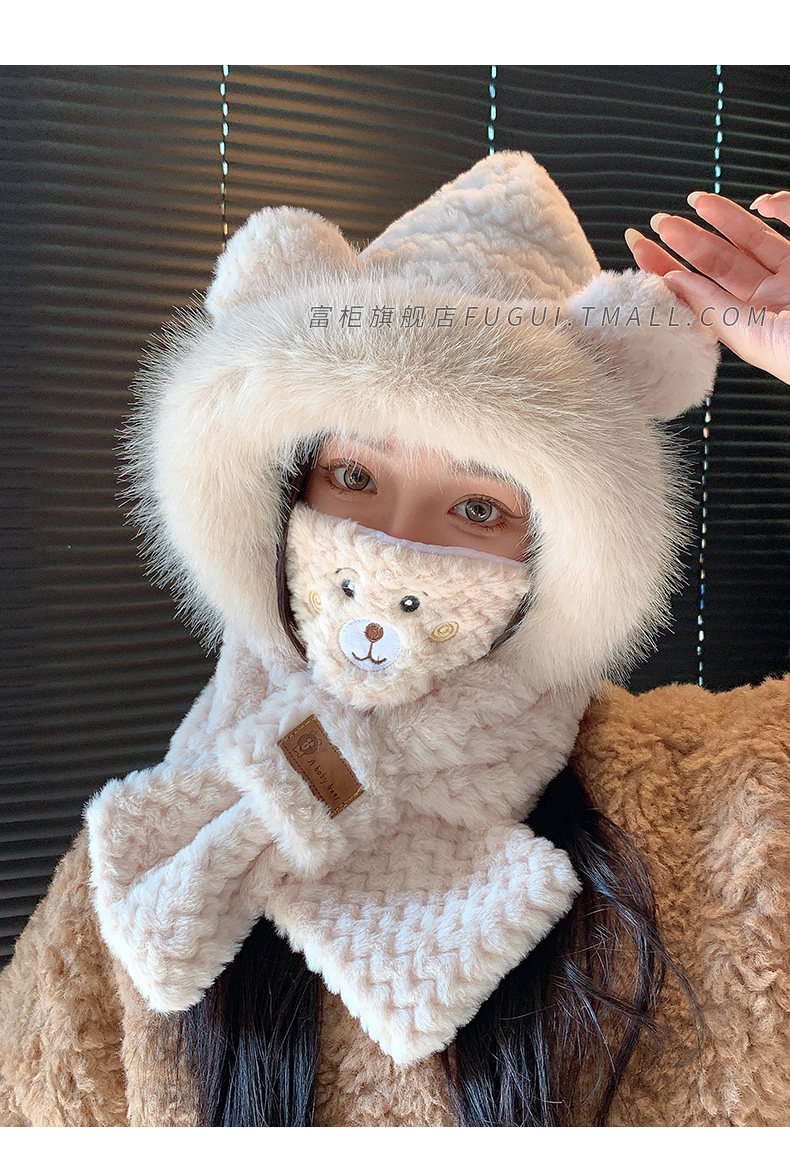 Fugui 2025 New Cute Plush Bear Hat for Women, Winter Scarf Integrated Thickened Warm Neck Warmer Two-Piece Set