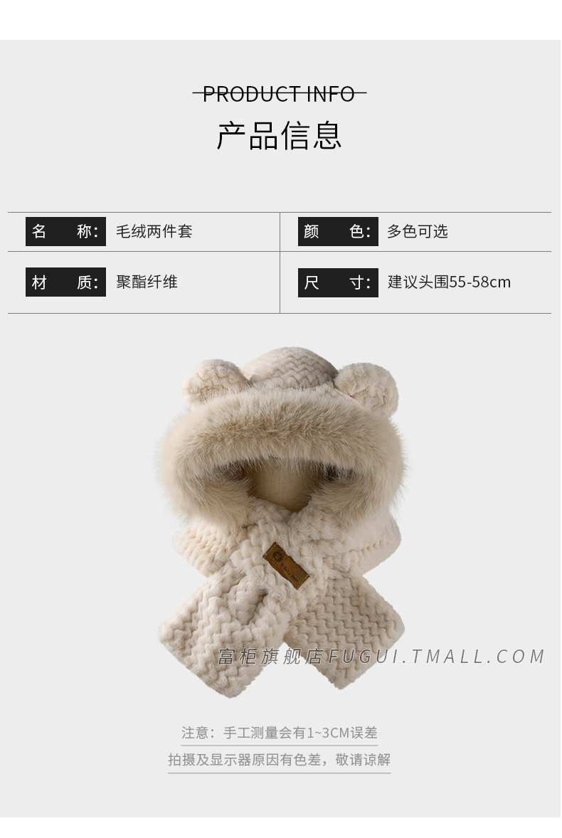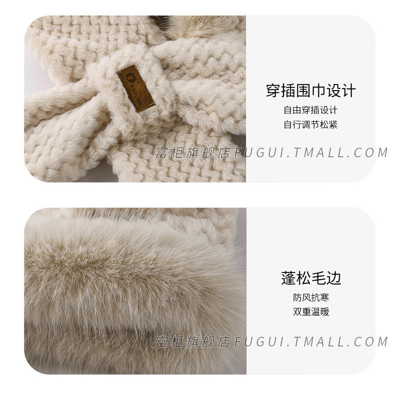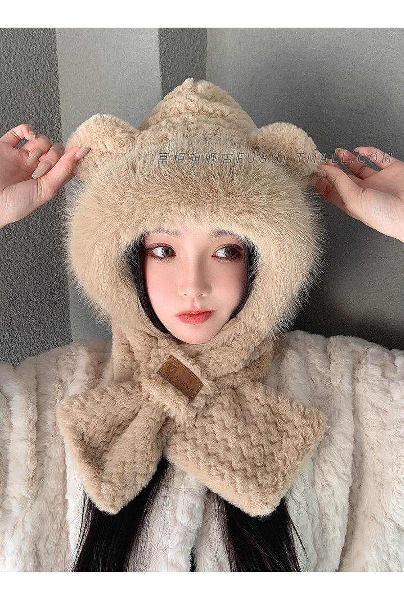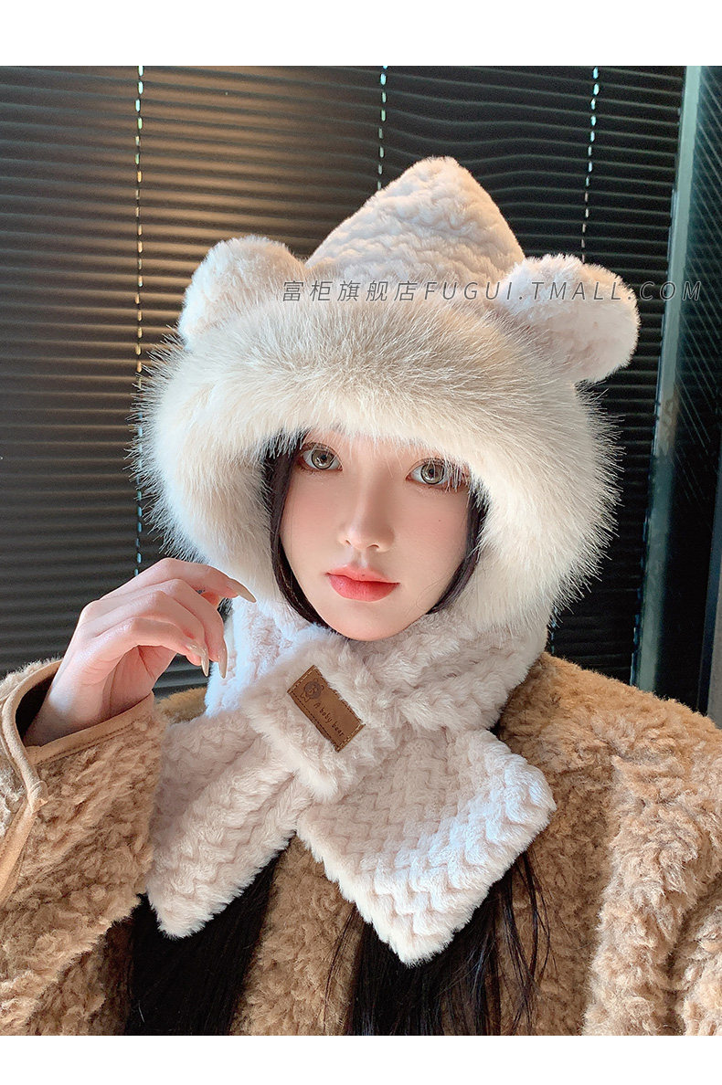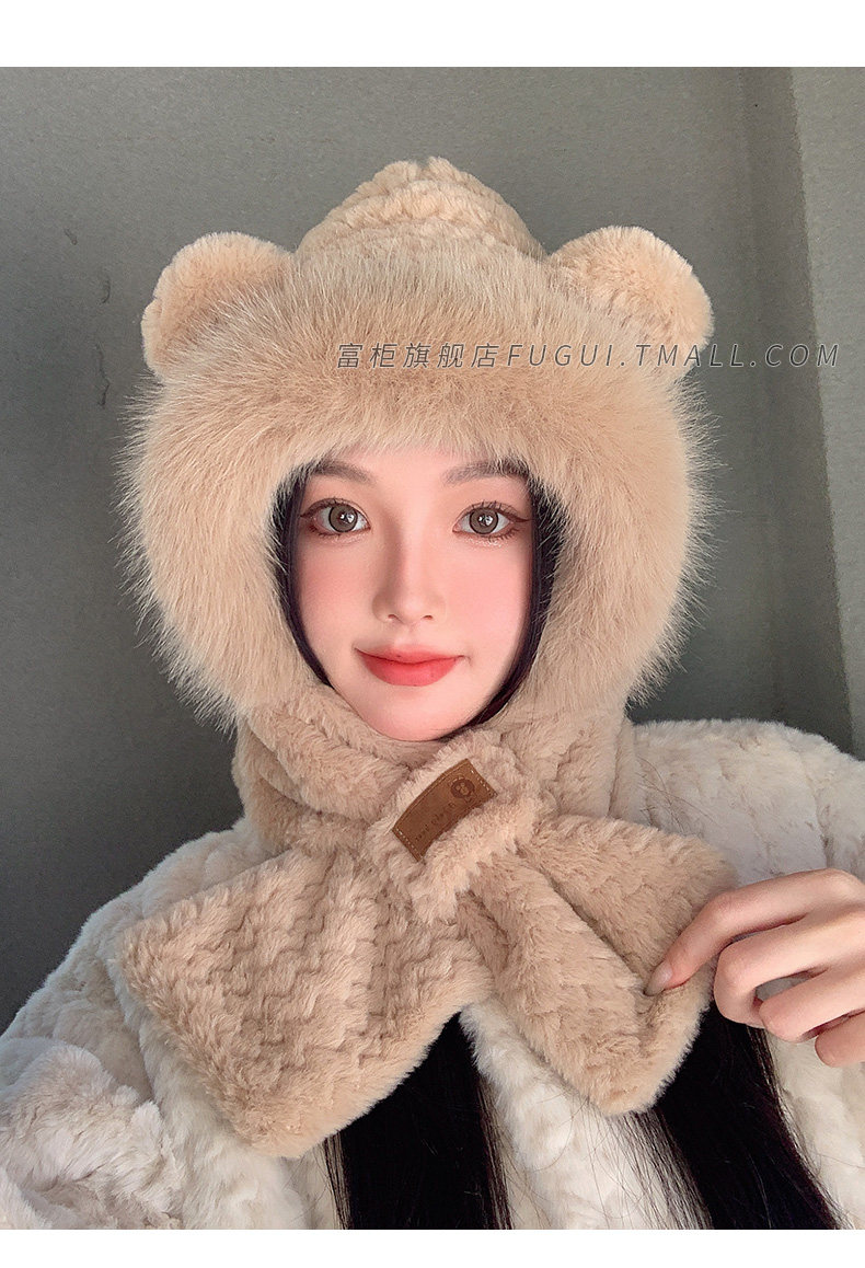 Fugui 2025 New Cute Plush Bear Hat for Women, Winter Scarf Integrated Thickened Warm Neck Warmer Two-Piece Set