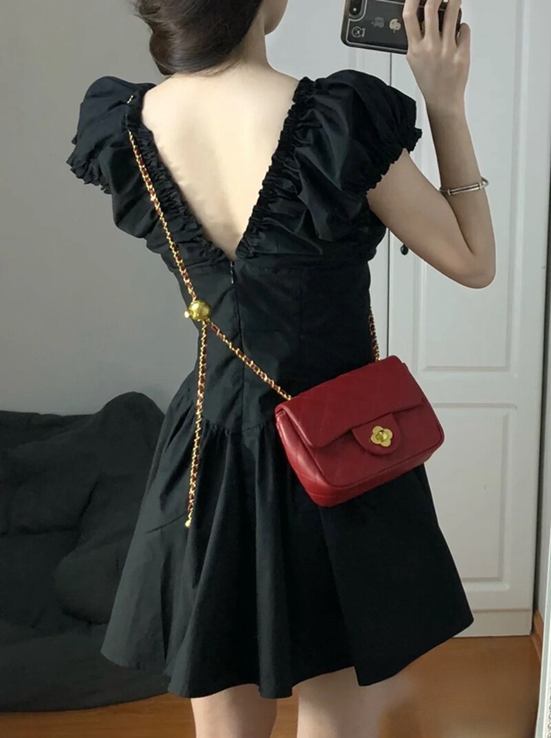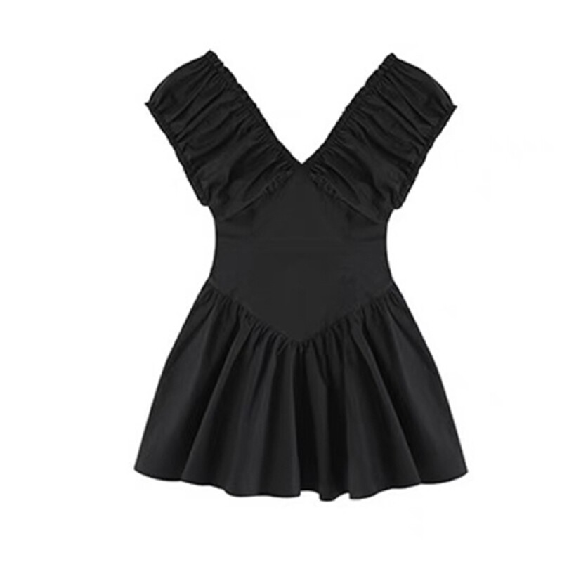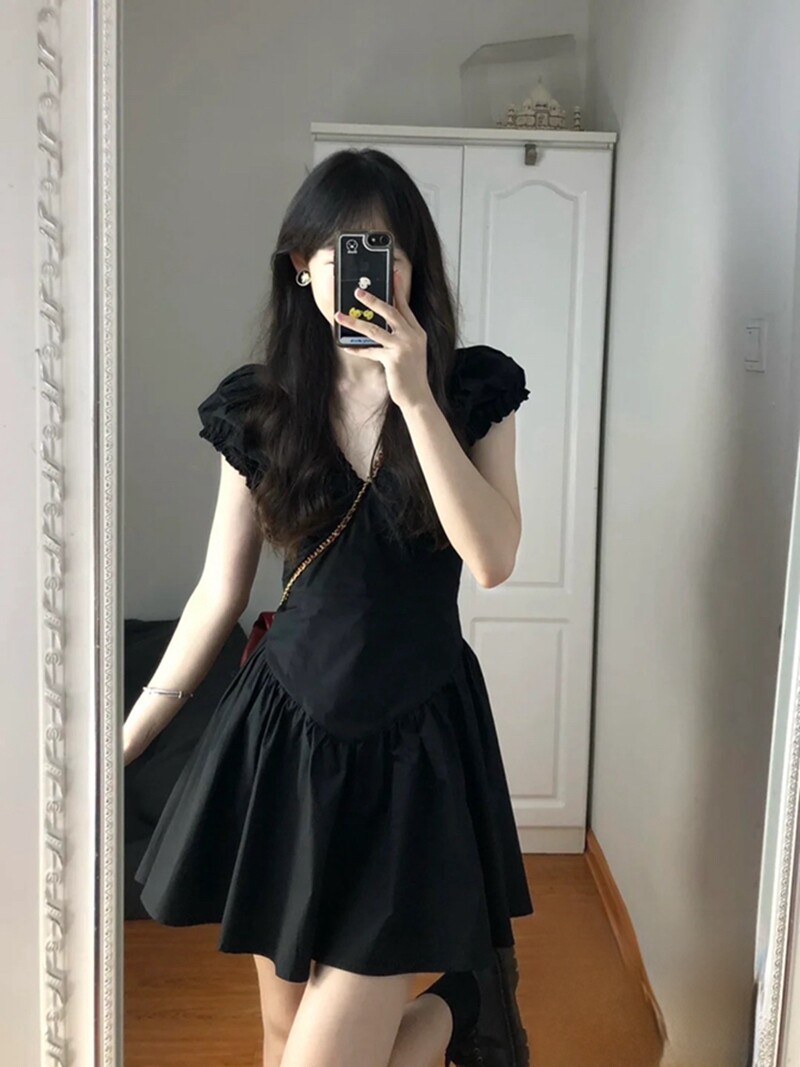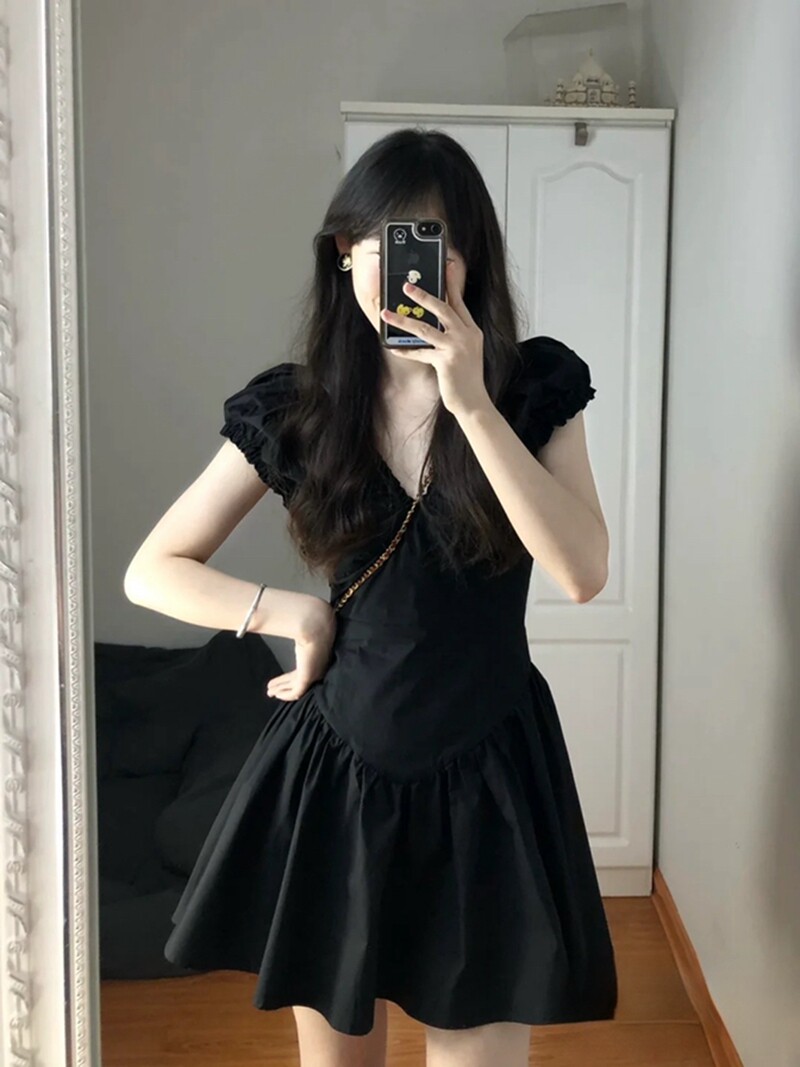 Summer New Style French Pleated Dress with Short Sleeves, Black, High-End, Waist-Cinching, Slimming, Sweet Fairy Princess Dress