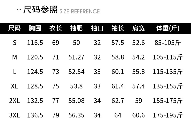China (cm) 165 / 88-90 170 / 96-98 175 / 108-110 180 / 118-122 185 / 126-130