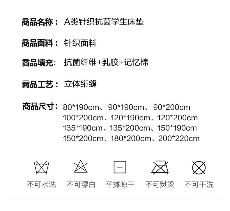 Applicable bed size 80*190cm, anti-mite and antibacterial, guaranteed compensation for collapse,90*190cm, anti-mite and antibacterial, guaranteed to compensate for collapse,90*200cm, anti-mite and antibacterial, guaranteed to compensate for collapse,100*200cm, anti-mite and antibacterial, guaranteed compensation for collapse,120*190cm, anti-mite and antibacterial, guaranteed to compensate for collapse.,120*200cm, anti-mite and antibacterial, guaranteed to compensate for collapse,135*190cm, anti-mite and antibacterial, guaranteed to compensate for collapse.,135*200cm, anti-mite and antibacterial, guaranteed to compensate for collapse,150*190cm, anti-mite and antibacterial, guaranteed to compensate for collapse.,150*200cm, anti-mite and antibacterial, guaranteed to compensate for collapse,180*200cm, anti-mite and antibacterial, guaranteed to compensate for collapse,200*220cm, anti-mite and antibacterial, guaranteed to compensate for collapse,Custom size Please contact customer service